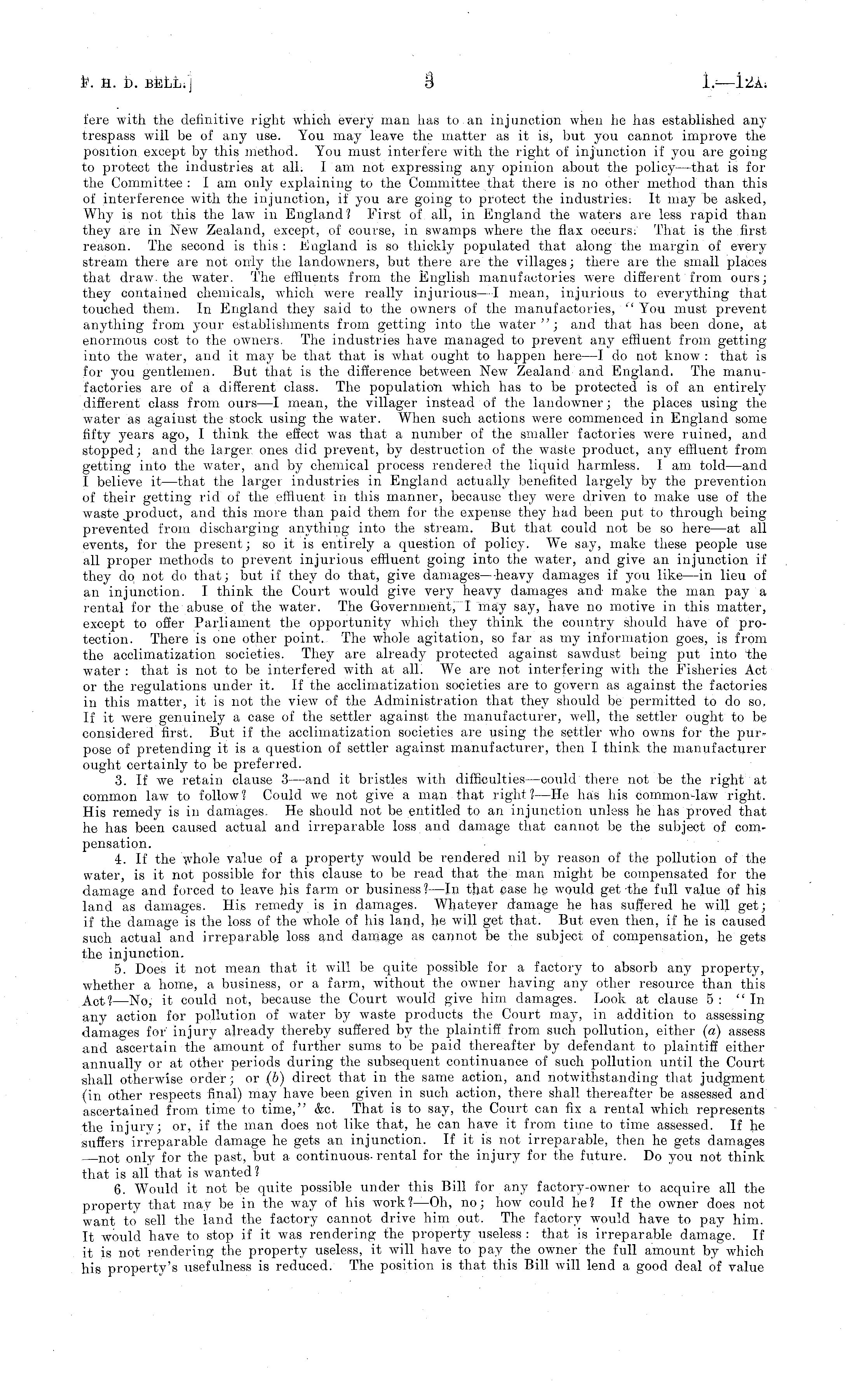 fere with the definitive right which every man has to an injunction when he has established any trespass will be of any use. You may leave the matter as it is, but you cannot improve the position except by this method. You must interfere with the right of injunction if you are going to protect the industries at all. I am not expressing any opinion about the policy—that is for the Committee ; I am only explaining to the Committee that there is no other method than this of interference with the injunction, if you are going to protect the industries. It may be asked, Why is not this the law in England ? First of all, in England the waters are less rapid than they are in New Zealand, except, of course, in swamps where the flax occurs. That is the first reason. The second is this : England is so thickly populated that along the margin of every stream there are not only the landowners, but there are the villages; there are the small places that draw- the water. The effluents from the English manufactories were different from ours; they contained chemicals, which were really injurious—l mean, injurious to everything that touched them. In England they said to the owners of the manufactories, " You must prevent anything from your establishments from getting into the water"; and that has been done, at enormous cost to the owners. The industries have managed to prevent any effluent from getting into the water, and it may be that that is what ought to happen here—l do not know : that is for you gentlemen. But that is the difference between New Zealand and England. The manufactories are of a different class. The population which has to be protected is of an entirely different class from ours —I mean, the villager instead of the landowner; the places using the water as agaiust the stock using the water. When such actions were commenced in England some fifty years ago, I think the effect was that a number of the smaller factories were ruined, and stopped; and the larger ones did prevent, by destruction of the waste product, any effluent from getting into the water, and by chemical process rendered the liquid harmless. I am told—and I believe it —that the larger industries in England actually benefited largely by the prevention of their getting rid of the effluent in this manner, because they were driven to make use of the waste _product, and this more than paid them for the expense they had been put to through being prevented from discharging anything into the stream. But that could not be so here—at all events, for the present; so it is entirely a question of policy. We say, make these people use all proper methods to prevent injurious effluent going into the water, and give an injunction if they do not do that; but if they do that, give damages —heavy damages if you like —in lieu of an injunction. I think the Court would give very heavy damages and make the man pay a rental for the abuse of the water. The Government, I may say, have no motive in this matter, except to offer Parliament the opportunity which they think the country should have of protection. There is one other point. The whole agitation, so far as my information goes, is from the acclimatization societies. They are already protected against sawdust being put into the water : that is not to be interfered with at all. We are not interfering with the Fisheries Act or the regulations under it. If the acclimatization societies are to govern as against the factories in this matter, it is not the view of the Administration that they should be permitted to do so, If it were genuinely a case of the settler against the manufacturer, well, the settler ought to be considered first. But if the acclimatization societies are using the settler who owns for the purpose of pretending it is a question of settler against manufacturer, then I think the manufacturer ought certainly to be preferred. 3. If we retain clause 3 —and it bristles with difficulties —could there not be the right at common law to follow? Could we not give a man that right? —He has his common-law right. His remedy is in damages. He should not be entitled to an injunction unless he has proved that he has been caused actual and irreparable loss and damage that cannot be the subject of compensation. 4. If the whole value of a property would be rendered nil by reason of the pollution of the water, is it not possible for this clause to be read that the man might be compensated for the damage and forced to leave his farm or business ? —ln that case he would get the full value of his land as damages. His remedy is in damages. Whatever damage he has suffered he will get; if the damage is the loss of the whole of his land, lie will get that. But even then, if he is caused such actual and irreparable loss and damage as cannot be the subject of compensation, he gets the injunction. 5. Does it not mean that it will be quite possible for a factory to absorb any property, whether a home, a business, or a farm, without the owner having any other resource than this Act? —No, it could not, because the Court would give him damages. Look at clause 5:" In any action for pollution of water by waste products the Court may, in addition to assessing damages for injury already thereby suffered by the plaintiff from such pollution, either (a) assess and ascertain the amount of further sums to be paid thereafter by defendant to plaintiff either annually or at other periods during the subsequent continuance of such pollution until the Court shall otherwise order; or (6) direct that in the same action, and notwithstanding that judgment (in other respects final) may have been given in such action, there shall thereafter be assessed and ascertained from time to time," &c. That is to say, the Court can fix a rental which represents the injury; or, if the man does not like that, he can have it from time to time assessed. If he suffers irreparable damage he gets an injunction. If it is not i