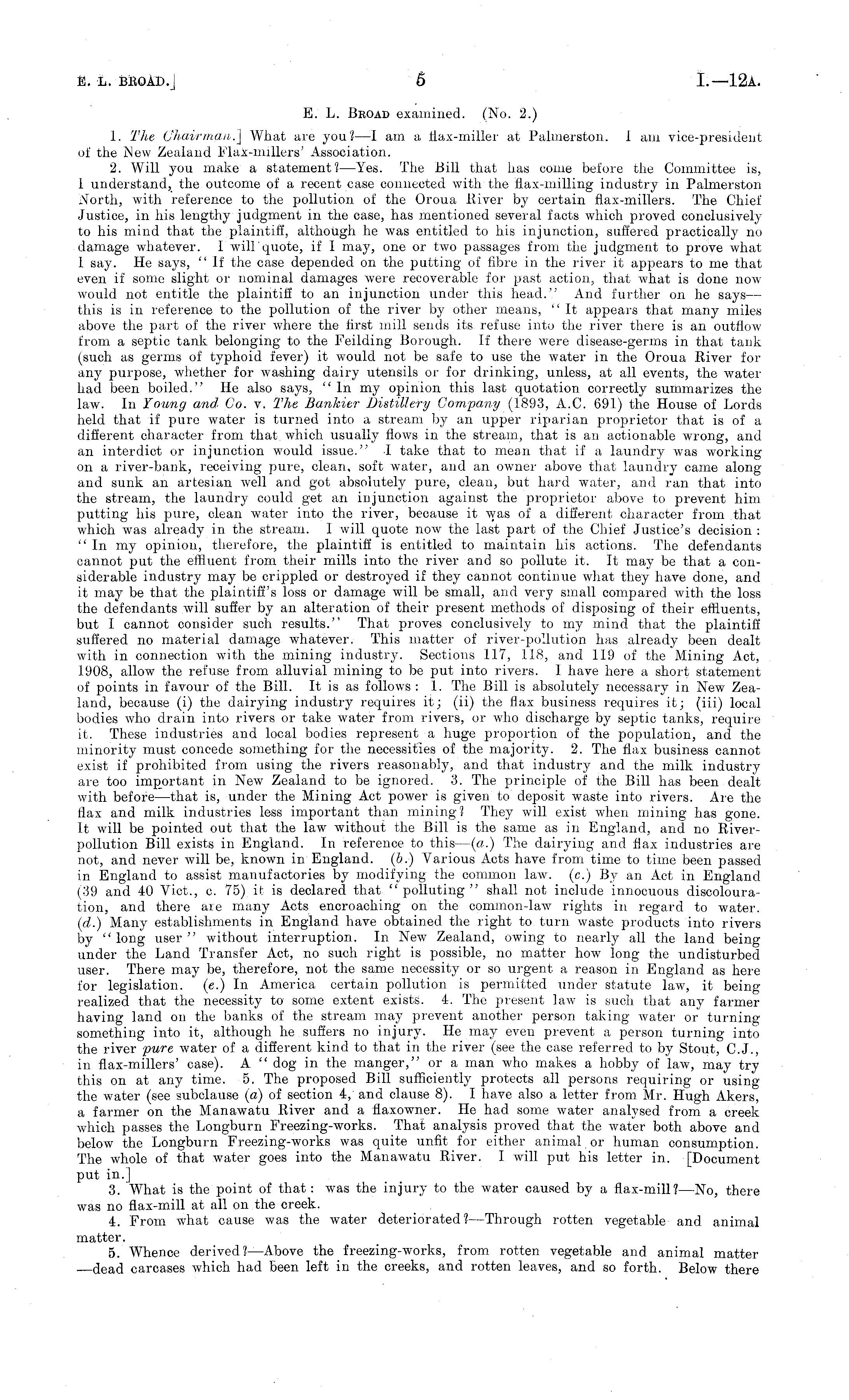 E. L. Bboad examined. (No. 2.) 1. The Chairman.] What are you? —I am a flax-miller at Palmerston. I am vice-president of the New Zealand Flax-millers' Association. 2. Will you make a statement? —Yes. The Bill that has come before the Committee is, I understand,, the outcome of a recent case connected with the flax-milling industry in Palmerston North, with reference to the pollution of the Oroua River by certain flax-millers. The Chief Justice, in his lengthy judgment in the case, has mentioned several facts which proved conclusively to his mind that the plaintiff, although he was entitled to his injunction, suffered practically no damage whatever. I will'quote, if I may, one or two passages from the judgment to prove what I say. He says, "If the case depended on the putting of fibre in the river it appears to me that even if some slight or nominal damages were recoverable for past action, that what is done now would not entitle the plaintiff to an injunction under this head." And further on he says — this is in reference to the pollution of the river by other means, " It appears that many miles above the part of the river where the first mill sends its refuse into the river there is an outflow from a septic tank belonging to the Feilding Borough. If there were disease-germs in that tank (such as germs of typhoid fever) it would not be safe to use the water in the Oroua River for any purpose, whether for washing dairy utensils or for drinking, unless, at all events, the water had been boiled." He also says, "In my opinion this last quotation correctly summarizes the law. In Young and, Co. v. The Bankier Distillery Company (1893, A.C. 691) the House of Lords held that if pure water is turned into a stream by an upper riparian proprietor that is of a different character from that which usually flows in the stream, that is an actionable wrong, and an interdict or injunction would issue." I take that to mean that if a laundry was working on a river-bank, receiving pure, clean, soft water, and an owner above that laundry came along and sunk an artesian well and got absolutely pure, clean, but hard water, and ran that into the stream, the laundry could get an injunction against the proprietor above to prevent him putting his pure, clean water into the river, because it was of a different character from that which was already in the stream. I will quote now the last part of the Chief Justice's decision : "In my opinion, therefore, the plaintiff is entitled to maintain his actions. The defendants cannot put the effluent from their mills into the river and so pollute it. It may be that a considerable industry may be crippled or destroyed if they cannot continue what they have done, and it may be that the plaintiff's loss or damage will be small, and very small compared with the loss the defendants will suffer by an alteration of their present methods of disposing of their effluents, but I cannot consider such results." That proves conclusively to my mind that the plaintiff suffered no material damage whatever, This matter of river-pollution has already been dealt with in connection with the mining industry. Sections 117, 118, and 119 of the Mining Act, 1908, allow the refuse from alluvial mining to be put into rivers. I have here a short statement of points in favour of the Bill. It is as follows: 1. The Bill is absolutely necessary in New Zealand, because (i) the dairying industry requires it; (ii) the flax business requires it; (iii) local bodies who drain into rivers or take water from rivers, or who discharge by septic tanks, require it. These industries and local bodies represent a huge proportion of the population, and the minority must concede something for the necessities of the majority. 2. The flax business cannot exist if prohibited from using the rivers reasonably, and that industry and the milk industry are too important in New Zealand to be ignored. 3. The principle of the Bill has been dealt with before —that is, under the Mining Act power is given to deposit waste into rivers. Are the flax and milk industries less important than mining? They will exist when mining has gone. It will be pointed out that the law without the Bill is the same as in England, and no Riverpollution Bill exists in England. In reference to this —(«.) The dairying and flax industries are not, and never will be, known in England. (&.) Various Acts have from time to time been passed in England to assist manufactories by modifying the common law. (c.) By an Act in England (39 and 40 Vict., c. 75) it is declared that " polluting " shall not include innocuous discolouration, and there aie many Acts encroaching on the common-law rights in regard to water. (d.) Many establishments in England have obtained the right to turn waste products into rivers by " long user " without interruption. In New Zealand, owing to nearly all the land being under the Land Transfer Act, no such right is possible, no matter how long the undisturbed user. There may be, therefore, not the same necessity or so urgent a reason in England as here for legislation. (c.) In America certain pollution is permitted under statute law, it being realized that the necessity to some extent exists. 4. The present law is such that any farmer having land on the banks of the stream may prevent another person taking water or turning something into it, although he suffers no injury. He may even prevent a person turning into the river pure water of a different kind to that in the river (see the case referred to by Stout, C.J., in flax-millers' case). A " dog in the manger," or a man who makes a hobby of law, may try this on at any time. 5. The proposed Bill sufficiently protects all persons requiring or using the water (see subclause (a) of section 4, and clause 8). I have also a letter from Mr. Hugh Akers, a farmer on the Manawatu River and a flaxowner. He had some water analysed from a creek which passes the Longburn Freezing-works. That analysis
