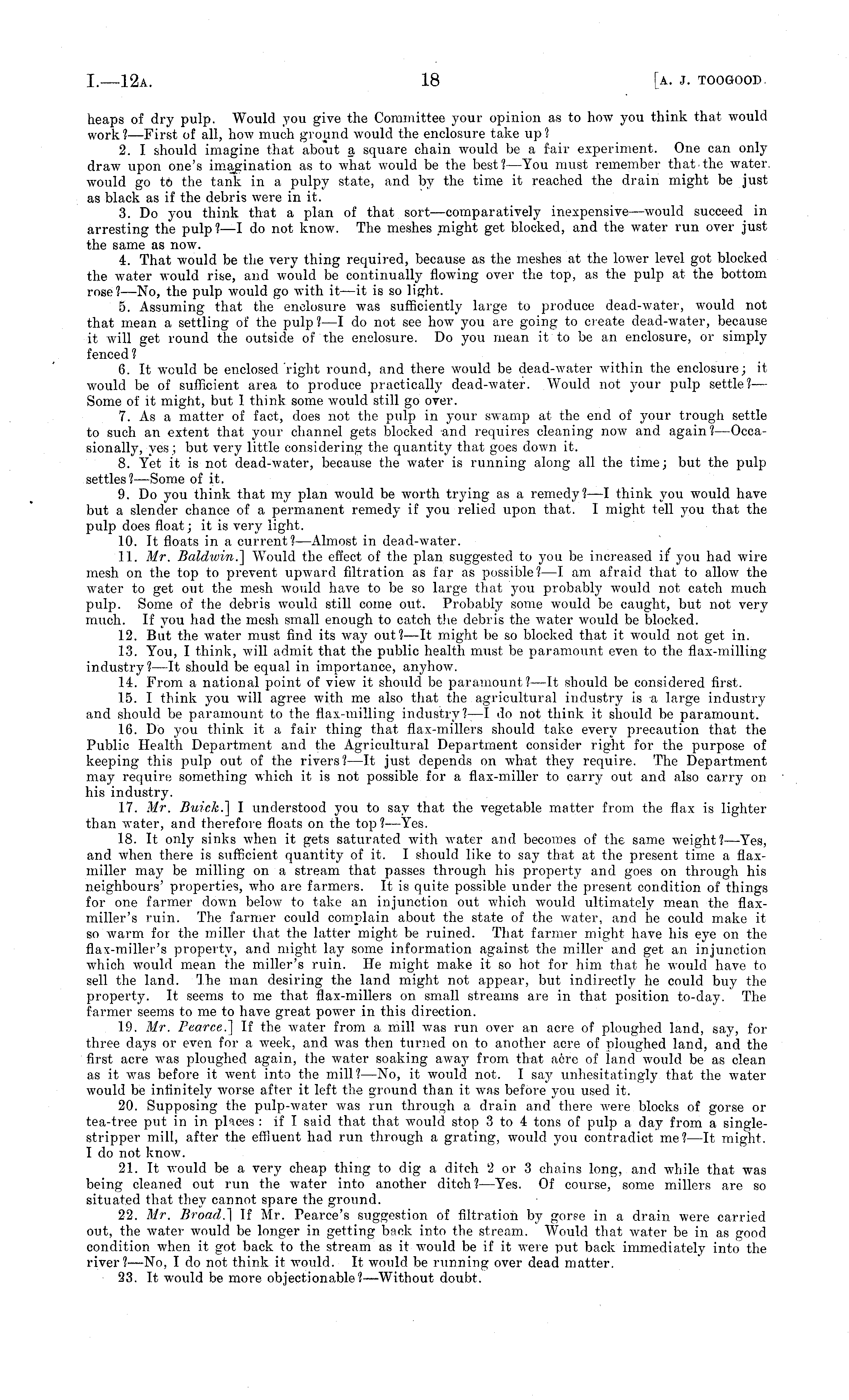 heaps of dry pulp. Would you give the Committee your opinion as to how you think that would work? —First of all, how much ground would the enclosure take up? 2. I should imagine that about a square chain, would be a fair experiment. One can onlydraw upon one's imagination as to what would be the best? —You must remember that .the water, would go to the tank in a pulpy state, and by the time it reached the drain might be just as black as if the debris were in it. 3. Do you think that a plan of that sort —comparatively inexpensive—would succeed in arresting the pulp ?—I do not know. The meshes might get blocked, and the water run over just the same as now. 4. That would be the very thing required, because as the meshes at the lower level got blocked the water would rise, and would be continually flowing over the top, as the pulp at the bottom rose? —No, the pulp would go with it—it is so light. 5. Assuming that the enclosure was sufficiently large to produce dead-water, would not that mean a settling of the pulp ? —I do not see how you are going to create dead-water, because it will get round the outside of the enclosure. Do you mean it to be an enclosure, or simply fenced ? 6. It would be enclosed right round, and there would be dead-water within the enclosure; it would be of sufficient area to produce practically dead-water. Would not your pulp settle? — Some of it might, but I think some would still go over. 7. As a matter of fact, does not the pulp in your swamp at the end of your trough settle to such an extent that your channel gets blocked and requires cleaning now and again? —Occasionally, yes ; but very little considering the quantity that goes down it. 8. Yet it is not dead-water, because the water is running along all the time; but the pulp settles? —Some of it. 9. Do you think that my plan would be worth trying as a remedy?—l think you would have but a slender chance of a permanent remedy if you relied upon that. I might tell you that the pulp does float; it is very light. 10. It floats in a current?— Almost in dead-water. 11. Mr. Baldwin.] Would the effect of the plan suggested to you be increased if you had wire mesh on the top to prevent upward filtration as far as possible?—l. am afraid that to allow the water to get out the mesh would have to be so large that you probably would not catch much pulp. Some of the debris would still come out. Probably some would be caught, but not very much. If you had the mesh small enough to catch the debris the water would be blocked. 12. But the water must find its way out?—lt might be so blocked that it would not get in. 13. You, I think, will admit that the public health must be paramount even to the flax-milling industry? —It should be equal in importance, anyhow. 14. From a national point of view it should be paramount?—lt should be considered first. 15. I think you will agree with me also that the agricultural industry is a large industry and should be paramount to the flax-milling industry ?—I do not think it should be paramount. 16. Do you think it a fair thing that flax-millers should take every precaution that the Public Health Department and the Agricultural Department consider right for the purpose of keeping this pulp out of the rivers? —It just depends on what they require. The Department may require something which it is not possible for a flax-miller to carry out and also carry on his industry. 17. Mr. Buick.] I understood you to say that the vegetable matter from the flax is lighter than water, and therefore floats on the top?— Yes. 18. It only sinks when it gets saturated with water and becomes of the same weight?— Yes, and when there is sufficient quantity of it. I should like to say that at the present time a flaxmiller may be milling on a stream that passes through his property and goes on through his neighbours' properties, who are farmers. It is quite possible under the present condition of things for one farmer down below to take an injunction out which would ultimately mean the flaxmiller's ruin. The farmer could complain about the state of the water, and he could make it so warm for the miller that the latter might be ruined. That farmer might have his eye on the flax-miller's property, and might lay some information against the miller and get an injunction which would mean the miller's ruin. He might make it so hot for him that he would have to sell the land. The man desiring the land might not appear, but indirectly he could buy the property. It seems to me that flax-millers on small streams are in that position to-day. The farmer seems to me to have great power in this direction. 19. Mr. Pearce.] If the water from a mill was run over an acre of ploughed land, say, for three days or even for a week, and was then turned on to another acre of ploughed land, and the first acre was ploughed again, the water soaking away from that acre of land would be as clean as it was before it went into the mill?—No, it would not. I say unhesitatingly that the water would be infinitely worse after it left the ground than it was before you used it. 20. Supposing the pulp-water was run through a drain and there were blocks of gorse or tea-tree put in in places : if I said that that would stop 3 to 4 tons of pulp a day from a singlestripper mill, after the effluent had run through a grating, would you contradict me?—lt might. I do not know. 21. It would be a very cheap thing to dig a ditch 2 or 3 chains long, and while that was being cleaned out run the water into another ditch ? —Yes. Of course, some millers are so situated that they cannot spare the ground. 22. Mr. Broad.] If Mr. Pearce's suggestion of filtration by gorse in a drain were carried out, the water would be longer in getting bank into the stream. Would that water be in as good condition when it got back to the stream as it would be if it were put back immediately into the river?- —No, Ido not think it would. It would be 