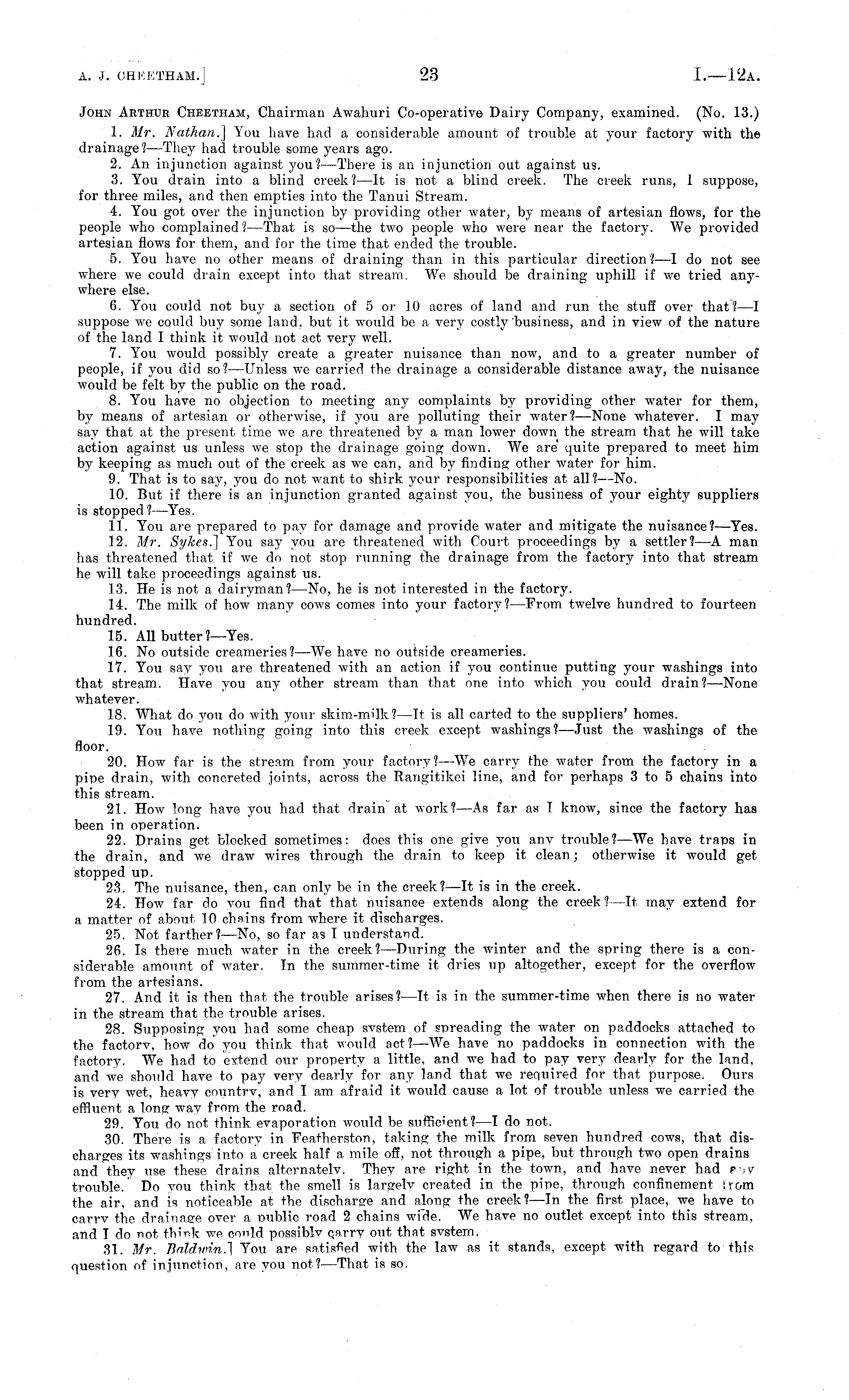John Arthur Cheetham, Chairman Awahuri Co-operative Dairy Company, examined. (No. 13.) 1. Mr. Nathan.] You have had a considerable amount of trouble at your factory with the drainage? —They had trouble some years ago. 2. An injunction against you? —There is an injunction out against us. 3. You drain into a blind creek? —It is not a blind creek. The creek runs, 1 suppose, for three miles, and then empties into the Tanui Stream. 4. You got over the injunction by providing other water, by means of artesian flows, for the people who complained ?—That is so —the two people who were near the factory. We provided artesian flows for them, and for the time that ended the trouble. 5. You have no other means of draining than in this particular direction?—l do not see where we could drain except into that stream. We should be draining uphill if we tried anywhere else. 6. You could not buy a section of 5 or 10 acres of land and run the stuff over that?—l suppose we could buy some land, but it would be a very costly business, and in view of the nature of the land I think it would not act very well. 7. You would possibly create a greater nuisance than now, and to a greater number of people, if you did so? —Unless we carried the drainage a considerable distance away, the nuisance would be felt by the public on the road. 8. You have no objection to meeting any complaints by providing other water for them, by means of artesian or otherwise, if you are polluting their water? —None whatever. I may say that at the present time we are threatened by a man lower down the stream that he will take action against us unless we stop the drainage going down. We are' quite prepared to meet him by keeping as much out of the creek as we can, and by finding other water for him. 9. That is to say, you do not want to shirk your responsibilities at all?— No. 10. But if there is an injunction granted against you, the business of your eighty suppliers is stopped?— Yes. 11. You are prepared to pay for damage and provide water and mitigate the nuisance? —Yes. 12. Mr. Sykes.] You say you are threatened with Court proceedings by a settler? —A man has threatened that if we do not stop running the drainage from the factory into that stream he will take proceedings against us. 13. He is not a dairyman? —No, he is not interested in the factory. 14. The milk of how many cows comes into your factory?— From twelve hundred to fourteen hundred. 15. All butter?— Yes. 16. No outside creameries?—We have no outside creameries. 17. You say you are threatened with an action if you continue putting your washings into that stream. Have you any other stream than that one into which you could drain?— None whatever. 18. What do you do with your skim-milk?—lt is all carted to the suppliers' homes. 19. You have nothing going into this creek except washings? —Just the washings of the floor. 20. How far is the stream from your factory?—We carry the water from the factory in a pipe drain, with concreted joints, across the Rangitikei line, and for perhaps 3 to 5 chains into this stream. 21. How long have you had that drain at work? —As far as I know, since the factory has been in operation. 22. Drains get blocked sometimes: does this one give you any trouble? —We have traps in the drain, and we draw wires through the drain to keep it clean; otherwise it would get stopped up. 23. The nuisance, then, can only be in the creek? —It is in the creek. 24. How far do you find that that nuisance extends along the creek? —It may extend for a matter of about 10 chains from where it discharges. 25. Not farther? —No, so far as I understand. 26. Is there much water in the creek? —During the winter and the spring there is a considerable amount of water. In the summer-time it dries up altogether, except for the overflow from the artesians. 27. And it is then that the trouble arises? —It is in the summer-time when there is no water in the stream that the trouble arises. 28. Supposing you had some cheap system of spreading the water on paddocks attached to the factory, how do you think that would act? —We have no paddocks in connection with the factory. We had to extend our property a little, and we had to pay very dearly for the land, and we should have to pay very dearly for any land that we required for that purpose. Ours is very wet, heavy country, and I am afraid it would cause a lot of trouble unless we carried the effluent a long way from the road. 29. You do not think evaporation would be sufficient? —I do not. 30. There is a factory in Featherston, taking the milk from seven hundred cows, that discharges its washings into a creek half a mile off, not through a pipe, but through two open drains and they use these drains alternately. They are right in the town, and have never had p--,y trouble.' Do you think that the smell is largely created in the pipe, through confinement Irom the air, and is noticeable at the discharge and along the creek?—ln the first place, we have to carry the drainage over a public road 2 chains wfde. We have no outlet except into this stream, and I do not think we could possibly carry out that system. 31. Mr. Baldwin.] You are satisfied with the law as it stands, except with regard to this question of injunction, are you not?— That is so.