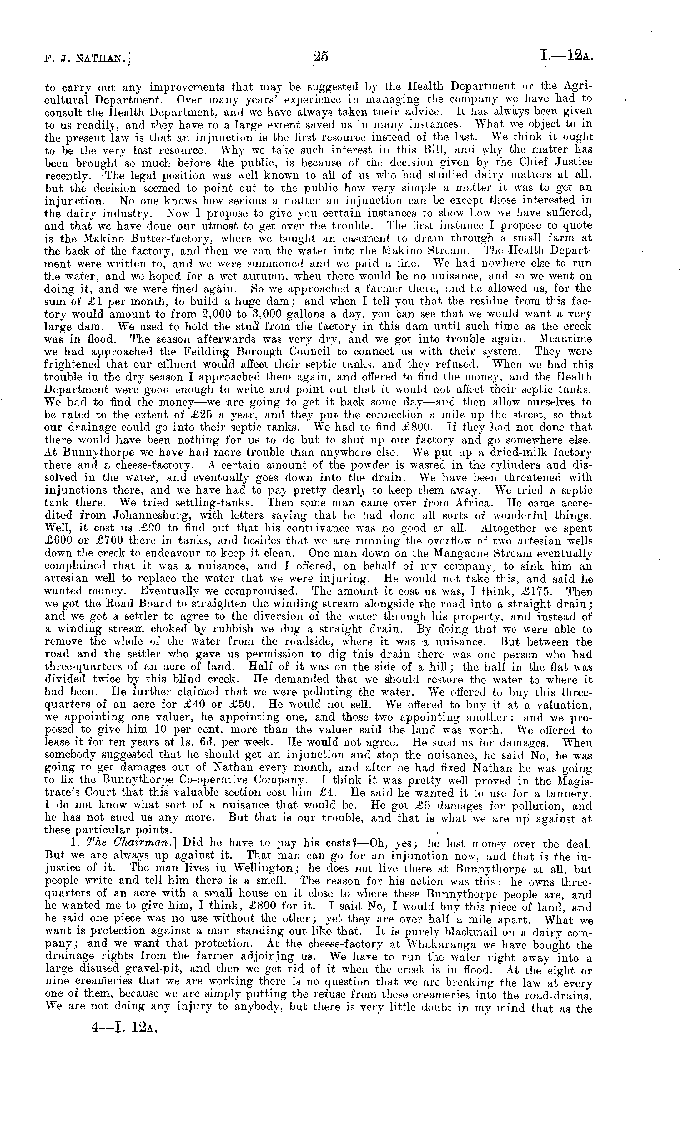 to carry out any improvements that may be suggested by the Health Department or the Agricultural Department. Over many years' experience in managing the company we have had to consult the Health Department, and we have always taken their advice. It has always been given to us readily, and they have to a large extent saved us in many instances. What we object to in the present law is that an injunction is the first resource instead of the last. We think it ought to be the very last resource. Why we take such interest in this Bill, and why the matter has been brought so much before the public, is because of the decision given by the Chief Justice recently. The legal position was well known to all of us who had studied dairy matters at all, but the decision seemed to point out to the public how very simple a matter it was to get an injunction. No one knows how serious a matter an injunction can be except those interested in the dairy industry. Now I propose to give you certain instances to show how we have suffered, and that we have done our utmost to get over the trouble. The first instance I propose to quote is the Makino Butter-factory, where we bought an easement to drain through a small farm at the back of the factory, and then we ran the water into the Makino Stream. The Health Department were written to, and we were summoned and we paid a fine. We had nowhere else to run the water, and we hoped for a wet autumn, when there would be no nuisance, and so we went on doing it, and we were fined again. So we approached a farmer there, and he allowed us, for the sum of £1 per month, to build a huge dam; and when I tell you that the residue from this factory would amount to from 2,000 to 3,000 gallons a day, you can see that we would want a very large dam. We used to hold the stuff from the factory in this dam until such time as the creek was in flood. The season afterwards was very dry, and we got into trouble again. Meantime we had approached the Feilding Borough Council to connect us with their system. They were frightened that our effluent would affect their septic tanks, and they refused. When we had this trouble in the dry season I approached them again, and offered to find the money, and the Health Department were good enough to write and point out that it would not affect their septic tanks. We had to find the money —we are going to get it back some day—and then allow ourselves to be rated to the extent of £25 a year, and they put the connection a mile up the street, so that our drainage could go into their septic tanks. We had to find £800. If they had not done that there would have been nothing for us to do but to shut up our factory and go somewhere else. At Bunnythorpe we have had more trouble than anywhere else. We put up a dried-milk factory there and a cheese-factoi-y. A certain amount of the powder is wasted in the cylinders and dissolved in the water, and eventually goes down into the drain. We have been threatened with injunctions there, and we have had to pay pretty dearly to keep them away. We tried a septic tank there. We tried settling-tanks. Then some man came over from Africa. He came accredited from Johannesburg, with letters saying that he had done all sorts of wonderful things. Well, it cost us £90 to find out that his contrivance was no good at all. Altogether we spent £600 or £700 there in tanks, and besides that we are running the overflow of two artesian wells down the creek to endeavour to keep it clean. One man down on the Mangaone Stream eventually complained that it was a nuisance, and I offered, on behalf of my company, to sink him an artesian well to replace the water that we were injuring. He would not take this, and said he wanted money. Eventually we compromised. The amount it cost us was, I think, £175. Then we got the Road Board to straighten the winding stream alongside the road into a straight drain; and we got a settler to agree to the diversion of the water through his property, and instead of a winding stream choked by rubbish we dug a straight drain. By doing that we were able to remove the whole of the water from the roadside, where it was a nuisance. But between the road and the settler who gave us permission to dig this drain there was one person who had three-quarters of an acre of land. Half of it was on the side of a hill; the half in the flat was divided twice by this blind creek. He demanded that we should restore the water to where it had been. He further claimed that we were polluting the water. We offered to buy this threequarters of an acre for £40 or £50. He would not sell. We offered to buy it at a valuation, we appointing one valuer, he appointing one, and those two appointing another; and we proposed to give him 10 per cent, more than the valuer said the land was worth. We offered to lease it for ten years at Is. 6d. per week. He would not agree. He sued us for damages. When somebody suggested that he should get an injunction and stop the nuisance, he said No, he was going to get damages out of Nathan every month, and after he had fixed Nathan he was going to fix the Bunnythorpe Co-operative Company. I think it was pretty well proved in the Magistrate's Court that this valuable section cost him £4. He said he wanted it to use for a tannery. I do not know what sort of a nuisance that would be. He got £5 damages for pollution, and he has not sued us any more. But that is our trouble, and that is what we are up against at these particular points. 1. The Chairman. .] Did he have to pay his costs? —Oh, yes; he lost money over the deal. But we are always up against it. That man can go for an injunction now, and that is the injustice of it. The man lives in Wellington; he does not live there at Bunnythorpe at all, but people write and tell him there is a smell. The reason for his action was this : he owns threequarters of an acre with a small house on it close to where these Bunnythorpe people are, and he wanted me to 