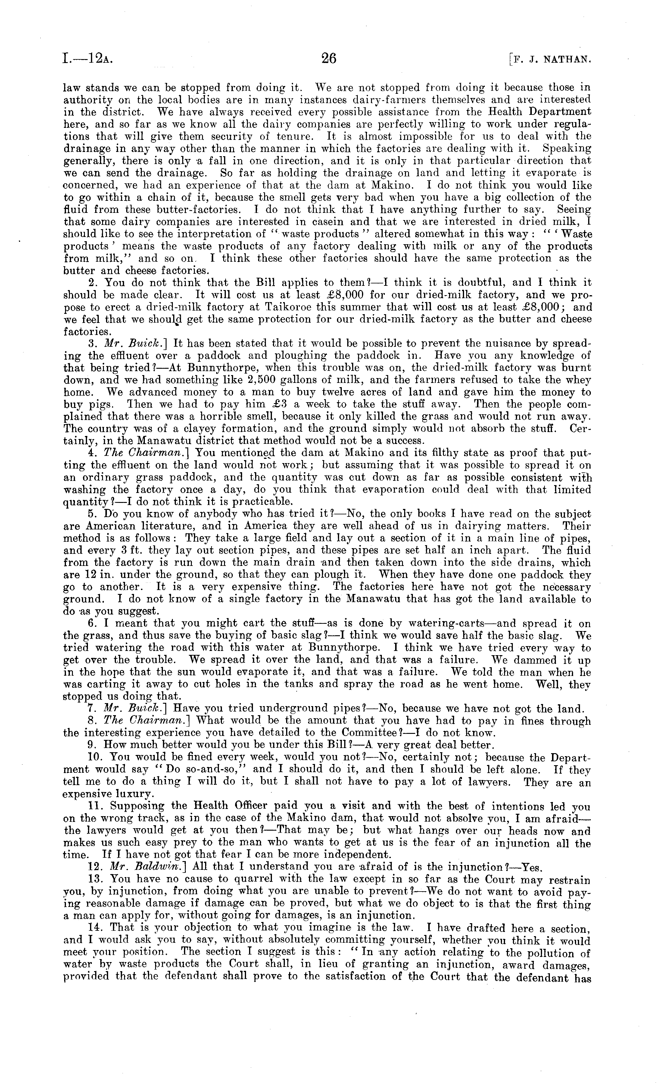 law stands we can be stopped from doing it. We are not stopped from doing it because those in authority on the local bodies are in many instances dairy-farmers themselves and are interested in the district. We have always received every possible assistance from the Health Department here, and so far as we know all the dairy companies are perfectly willing to work under regulations that will give them security of tenure. It is almost impossible for us to deal with the drainage in any way other than the manner in which the factories are dealing with it. Speaking generally, there is only a fall in one direction, and it is only in that particular direction that we can send the drainage. So far as holding the drainage on land and letting it evaporate is concerned, we had an experience of that at the dam at Makino. I do not think you would like to go within a chain of it, because the smell gets very bad when you have a big collection of the fluid from these butter-factories. I do not think that I have anything further to say. Seeing that some dairy companies are interested in casein and that we are interested in dried milk, 1 should like to see the interpretation of "waste products " altered somewhat in this way : " ' Waste products ' means the waste products of any factory dealing with milk or any of the products from milk," and so on I think these other factories should have the same protection as the butter and cheese factories. 2. You do not think that the Bill applies to them? —I think it is doubtful, and I think it should be made clear. It will cost us at least £8,000 for our dried-milk factory, and we propose to erect a dried-milk factory at Taikoroe this summer that will cost us at least £8,000; and we feel that we should get the same protection for our dried-milk factory as the butter and cheese factories. 3. Mr. Buick.] It has been stated that it would be possible to prevent the nuisance by spreading the effluent over a paddock and ploughing the paddock in. Have you any knowledge of that being tried? —At Bunnythorpe, when this trouble was on, the dried-milk factory was burnt down, and we had something like 2,500 gallons of milk, and the farmers refused to take the whey home. We advanced money to a man to buy twelve acres of land and gave him the money to buy pigs. Then we had to pay him £3 a week to take the stuff away. Then the people complained that there was a horrible smell, because it only killed the grass and would not run away. The country was of a clayey formation, and the ground simply would not absorb the stuff. Certainly, in the Manawatu district that method would not be a success. 4. The Chairman.] You mentioned the dam at Makino and its filthy state as proof that putting the effluent on the land would not work; but assuming that it was possible to spread it on an ordinary grass paddock, and the quantity was cut down as far as possible consistent with washing the factory once a day, do you think that evaporation could deal with that limited quantity ?—I do not think it is practicable. 5. Do you know of anybody who has tried it?—No, the only books I have read on the subject are American literature, and in America they are well ahead of us in dairying matters. Their method is as follows : They take a large field and lay out a section of it in a main line of pipes, and every 3 ft. they lay out section pipes, and these pipes are set half an inch apart. The fluid from the factory is run down the main drain 'and then taken down into the side drains, which are 12 in. under the ground, so that they can plough it. When they have done one paddock they go to another. It is a very expensive thing. The factories here have not got the necessary ground. I do not know of a single factory in the Manawatu that has got the land available to do as you suggest. 6. I meant that you might cart the stuff —as is done by watering-carts—and spread it on the grass, and thus save the buying of basic slag?—l think we would save half the basic slag. We tried watering the road with this water at Bunnythorpe. I think we have tried every way to get over the trouble. We spread it over the land, and that was a failure. We dammed it up in the hope that the sun would evaporate it, and that was a failure. We told the man when he was carting it away to cut holes in the tanks and spray the road as he went home. Well, they stopped us doing that. 7. Mr. Buick.] Have you tried underground pipes?—No, because we have not got the land. 8. The Chairman.] What would be the amount that you have had to pay in fines through the interesting experience you have detailed to the Committee?—l do not know. 9. How much better would you be under this Bill? —A very great deal better. 10. You would be fined every week, would you not? —No, certainly not; because the Department would say "Do so-and-so," and I should do it, and then I should be left alone. If they tell me to do a thing I will do it, but I shall not have to pay a lot of lawyers. They are an expensive luxury. 11. Supposing the Health Officer paid you a visit and with the best of intentions led you on the wrong track, as in the case of the Makino dam, that would not absolve you, I am afraid — the lawyers would get at you then? —That may be; but what hangs over our heads now and makes us such easy prey to the man who wants to get at us is the fear of an injunction all the time. If I have not got that fear I can be more independent. 12. Mr. Baldwin.] All that I understand you are afraid of is the injunction?— Yes. 13. You have no cause to quarrel with the law except in so far as the Court may restrain you, by injunction, from doing what you are unable to prevent?—We do not want to avoid paying reasonable damage if damage can be proved, but what we do object to is that the first thing a man can apply for, without going for damages, is an injunction. 14. That is your objection to what you imagine is the law. I have drafted here a section, and 