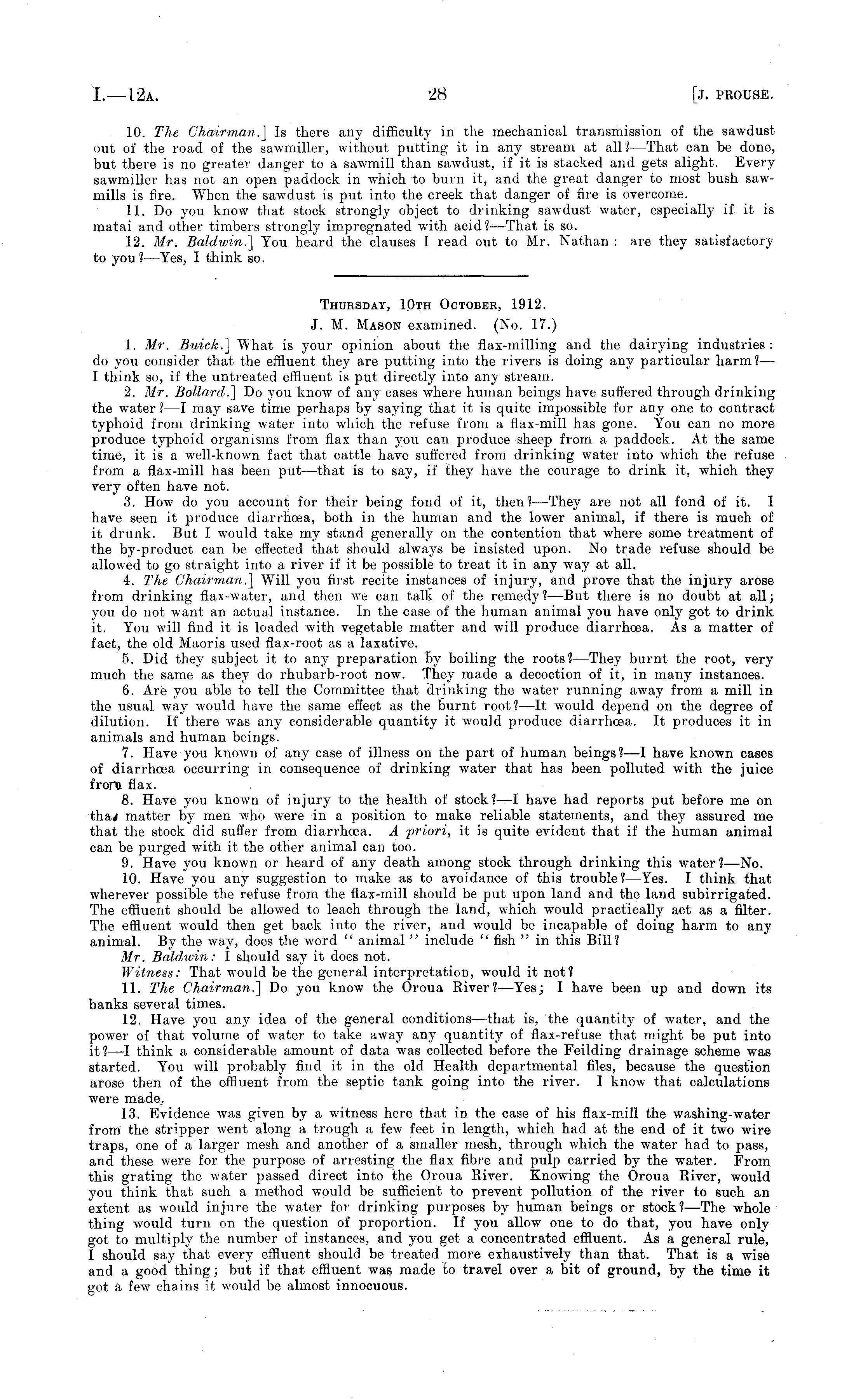 Thursday, 10th October, 1912. J. M. Mason examined. (No. 17.) 1. Mr. Buick.] What is your opinion about the flax-milling and the dairying industries: do you consider that the effluent they are putting into the rivers is doing any particular harm?— I think so, if the untreated effluent is put directly into any stream. 2. Mr. Bollard,] Do you know of any cases where human beings have suffered through drinking the water ? —I may save time perhaps by saying that it is quite impossible for any one to contract typhoid from drinking water into which the refuse from a flax-mill has gone. You can no more produce typhoid organisms from flax than you can produce sheep from a paddock. At the same time, it is a well-known fact that cattle have suffered from drinking water into which the refuse from a flax-mill has been put —that is to say, if they have the courage to drink it, which they very often have not. 3. How do you account for their being fond of it, then? —They are not all fond of it. I have seen it produce diarrhoea, both in the human and the lower animal, if there is much of it drunk. But I would take my stand generally on the contention that where some treatment of the by-product can be effected that should always be insisted upon. No trade refuse should be allowed to go straight into a river if it be possible to treat it in any way at all. 4. The Chairman.] Will you first recite instances of injury, and prove that the injury arose from drinking flax-water, and then we can talk of the remedy?— But there is no doubt at all; you do not want an actual instance. In the case of the human animal you have only got to drink it. You will find it is loaded with vegetable matter and will produce diarrhoea. As a matter of fact, the old Maoris used flax-root as a laxative. 5. Did they subject it to any preparation by boiling the roots? —They burnt the root, very much the same as they do rhubarb-root now. They made a decoction of it, in many instances. 6. Are you able to tell the Committee that drinking the water running away from a mill in the usual way would have the same effect as the burnt root? —It would depend on the degree of dilution. If there was any considerable quantity it would produce diarrhoea. It produces it in animals and human beings. 7. Have you known of any case of illness on the part of human beings?—l have known cases of diarrhoea occurring in consequence of drinking water that has been polluted with the juice from flax. 8. Have you known of injury to the health of stock ?—I have had reports put before me on matter by men who were in a position to make reliable statements, and they assured me that the stock did suffer from diarrhoea. A priori, it is quite evident that if the human animal can be purged with it the other animal can too. 9. Have you known or heard of any death among stock through drinking this water? —No. 10. Have you any suggestion to make as to avoidance of this trouble? —Yes. I think that wherever possible the refuse from the flax-mill should be put upon land and the land subirrigated. The effluent should be allowed to leach through the land, which would practically act as a filter. The effluent would then get back into the river, and would be incapable of doing harm to any animal. By the way, does the word " animal " include " fish "in this Bill? Mr. Baldwin: I should say it does not. Witness: That would be the general interpretation, would it not? 11. The Chairman.] Do you know the Oroua River? —Yes; I have been up and down its banks several times. 12. Have you any idea of the general conditions—that is, the quantity of water, and the power of that volume of water to take away any quantity of flax-refuse that might be put into it? —I think a considerable amount of data was collected before the Feilding drainage scheme was started. You will probably find it in the old Health departmental files, because the question arose then of the effluent from the septic tank going into the river. I know that calculations were made. 13. Evidence was given by a witness here that in the case of his flax-mill the washing-water from the stripper went along a trough a few feet in length, which had at the end of it two wire traps, one of a larger mesh and another of a smaller mesh, through which the water had to pass, and these were for the purpose of arresting the flax fibre and pulp carried by the water. From this grating the water passed direct into the Oroua River. Knowing the Oroua River, would you think that such a method would be sufficient to prevent pollution of the river to such an extent as would injure the water for drinking purposes by human beings or stock?— The whole thing would turn on the question of proportion. If you allow one to do that, you have only got to multiply the number of instances, and you get a concentrated effluent. As a general rule, I should say that every effluent should be treated more exhaustively than that. That is a wise and a good thing; but if that effluent was made to travel over a bit of ground, by the time it got a few chains it would be almost innocuous.