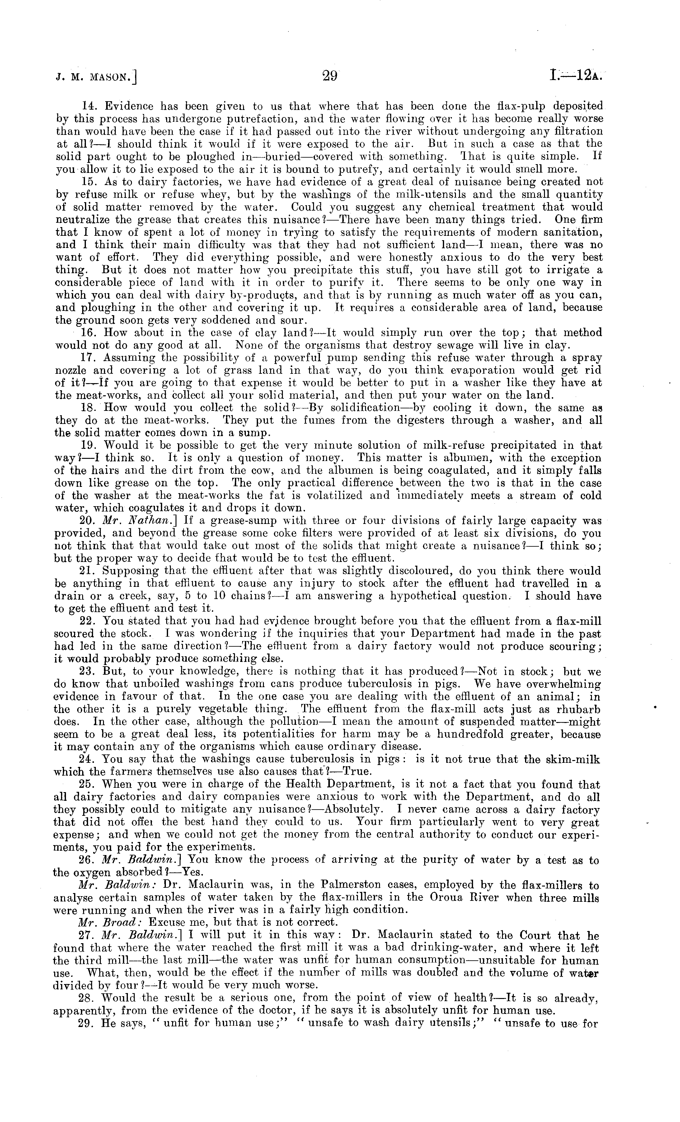 14. Evidence has been given to us that where that has been done the flax-pulp deposited by this process has undergone putrefaction, and the water flowing over it has become really worse than would have been the case if it had passed out into the river without undergoing any filtration at all?—I should think it would if it were exposed to the air. But in such a case as that the solid part ought to be ploughed in—buried —covered with something. That is quite simple. If you allow it to lie exposed to the air it is bound to putrefy, and certainly it would smell more. 15. As to dairy factories, we have had evidence of a great deal of nuisance being created not by refuse milk or refuse whey, but by the washings of the milk-utensils and the small quantity of solid matter removed by the water. Could you suggest any chemical treatment that would neutralize the grease that creates this nuisance? —There have been many things tried. One firm that I know of spent a lot of money in trying to satisfy the requirements of modern sanitation, and I think their main difficulty was that they had not sufficient land—l mean, there was no want of effort. They did everything possible, and were honestly anxious to do the very best thing. But it does not matter how you precipitate this stuff, you have still got to irrigate a considerable piece of land with it, in order to purify- it. There seems to be only one way in which you can deal with dairy by-products, and that is by running as much water off as you can, and ploughing in the other and covering it up. It requires a considerable area of land, because the ground soon gets very soddened and sour. 16. How about in the case of clay land?—lt would simply run over the top; that method would not do any good at all. None of the organisms that destroy sewage will live in clay. 17. Assuming the possibility of a powerful pump sending this refuse water through a spray nozzle and covering a lot of grass land in that way, do you think evaporation would get rid of it?—lf you are going to that expense it would be better to put in a washer like they have at the meat-works, and collect all your solid material, and then put your water on the land. 18. How would you collect the solid? —By solidification —by cooling it down, the same as they do at the meat-works. They put the fumes from the digesters through a washer, and all the solid matter comes down in a sump. 19. Would it be possible to get the very minute solution of milk-refuse precipitated in that way?—l think so. It is only a question of money. This matter is albumen, with the exception of the hairs and the dirt from the cow, and the albumen is being coagulated, and it simply falls down like grease on the top. The only practical difference between the two is that in the case of the washer at the meat-works the fat is volatilized and immediately meets a stream of cold water, which coagulates it and drops it down. 20. Mr. Nathan,] If a grease-sump with three or four divisions of fairly large capacity was provided, and beyond the grease some coke filters were provided of at least six divisions, do you not think that that would take out most of the solids that might create a nuisance? —I think so; but the proper way to decide that would be to test the effluent. 21. Supposing that the effluent after that was slightly discoloured, do you think there would be anything in that effluent to cause any injury to stock after the effluent had travelled in a drain or a creek, say, sto 10 chains? —I am answering a hypothetical question. I should have to get the effluent and test it. 22. You stated that you had had evidence brought before you that the effluent from a flax-mill scoured the stock. I was wondering if the inquiries that your Department had made in the past had led in the same direction ?—The effluent from a dairy factory would not produce scouring; it would probably produce something else. 23. But, to your knowledge, there is nothing that it has produced?— Not in stock; but we do know that unboiled washings from cans produce tuberculosis in pigs. We have overwhelming evidence in favour of that. In the one case you are dealing with the effluent of an animal; in the other it is a purely vegetable thing. The effluent from the flax-mill acts just as rhubarb does. In the other case, although the pollution—l mean the amount of suspended matter —might seem to be a great deal less, its potentialities for harm may be a hundredfold greater, because it may contain any r of the organisms which cause ordinary disease. 24. You say that the washings cause tuberculosis in pigs : is it not true that the skim-milk which the farmers themselves use also causes that ?—True. 25. When you were in charge of the Health Department, is it not a fact that you found that all dairy factories and dairy companies were anxious to work with the Department, and do all they possibly could to mitigate any nuisance? —Absolutely. I never came across a dairy factory that did not offei the best hand they could to us. Your firm particularly went to very great expense; and when we could not get the money from the central authority to conduct our experiments, you paid for the experiments. 26. Mr. Baldwin.] You know the process of arriving at the purity of water by a test as to the oxygen absorbed? —Yes. Mr. Baldwin,: Dr. Maclaurin was, in the Palmerston cases, employed by the flax-millers to analyse certain samples of water taken by the flax-millers in the Oroua River when three mills were running and when the river was in a fairly high condition. Mr. Broad: Excuse me, but that is not correct. 27. Mr. Baldwin.] I will put it in this way : Dr. Maclaurin stated to the Court that he found that where the water reached the first mill it was a bad drinking-water, and where it left the third mill —the last mill —the water was unfit for human consumption—unsuitable for human use. What, then, would be the effect if the number of mill
