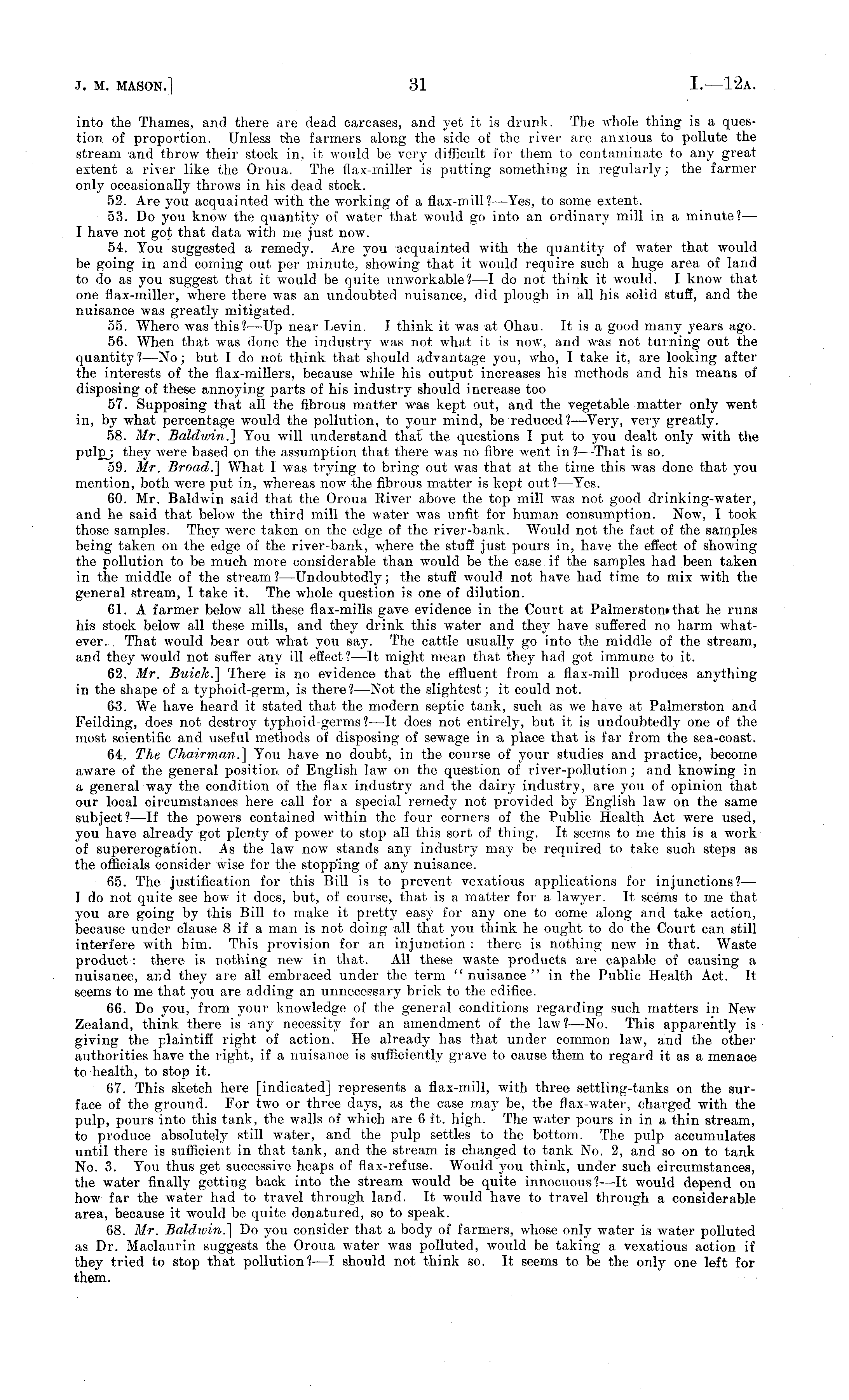 into the Thames, and there are dead carcases, and yet it is drunk. The whole thing is a question of proportion. Unless the farmers along the side of the river are anxious to pollute the stream and throw their stock in, it would be very difficult for them to contaminate to any great extent a river like the Oroua. The flax-miller is putting something in regularly; the farmer only occasionally throws in his dead stock. 52. Are you acquainted with the working of a flax-mill? —Yes, to some extent. 53. Do you know the quantity of water that would go into an ordinary mill in a minute? — I have not got that data with me just now. 54. You suggested a remedy. Are you acquainted with the quantity of water that would be going in and coming out per minute, showing that it would require such a huge area of land to do as you suggest that it would be quite unworkable? —I do not think it would. I know that one flax-miller, where there was an undoubted nuisance, did plough in all his solid stuff, and the nuisance was greatly mitigated. 55. Where was this? —Up near Levin. I think it was at Ohau. It is a good many years ago. 56. When that was done the industry was not what it is now, and was not turning out the quantity? —No; but I do not think that should advantage you, who, I take it, are looking after the interests of the flax-millers, because while his output increases his methods and his means of disposing of these annoying parts of his industry should increase too 57. Supposing that all the fibrous matter was kept out, and the vegetable matter only went in, by what percentage would the pollution, to your mind, be reduced? —Very, very greatly. 58. Mr. Baldwin.] You will understand that the questions I put to you dealt only with the pulpj they were based on the assumption that there was no fibre went in ?—-That is so. 59. Mr. Broad.] What I was trying to bring out was that at the time this was done that you mention, both were put in, whereas now the fibrous matter is kept out ? —Yes. 60. Mr. Baldwin said that the Oroua River above the top mill was not good drinking-water, and he said that below the third mill the water was unfit for human consumption. Now, I took those samples. The}- were taken on the edge of the river-bank. Would not the fact of the samples being taken on the edge of the river-bank, where the stuff just pours in, have the effect of showing the pollution to be much more considerable than would be the case if the samples had been taken in the middle of the stream? —Undoubtedly; the stuff would not have had time to mix with the general stream, I take it. The whole question is one of dilution. 61. A farmer below all these flax-mills gave evidence in the Court at Palmerstom that he runs his stock below all these mills, and they drink this water and they have suffered no harm whatever. , That would bear out what you say. The cattle usually go into the middle of the stream, and they would not suffer any ill effect? —It might mean that they had got immune to it. 62. Mr. Buick.] There is no evidence that the effluent from a flax-mill produces anything in the shape of a typhoid-germ, is there?— Not the slightest; it could not. 63. We have heard it stated that the modern septic ta.nk, such as we have at Palmerston and Feilding, does not destroy typhoid-germs? —It does not entirely, but it is undoubtedly one of the most scientific and useful methods of disposing of sewage in a place that is far from the sea-coast. 64. The Chairman.] You have no doubt, in the course of your studies and practice, become aware of the general position of English law on the question of river-pollution ; and knowing in a general way the condition of the flax industry and the dairy industry, are you of opinion that our local circumstances here call for a special remedy not provided by English law on the same subject?—lf the powers contained within the four corners of the Public Health Act were used, you have already got plenty of power to stop all this sort of thing. It seems to me this is a work of supererogation. As the law now stands any industry may be required to take such steps as the officials consider wise for the stopping of any nuisance. 65. The justification for this Bill is to prevent vexatious applications for injunctions?— Ido not quite see how it does, but, of course, that is a matter for a lawyer. It seems to me that you are going by this Bill to make it pretty easy for any one to come along and take action, because under clause 8 if a man is not doing all that you think he ought to do the Court can still interfere with him. This provision for an injunction : there is nothing new in that. Waste product: there is nothing new in that. All these waste products are capable of causing a nuisance, and they are all embraced under the term "nuisance" in the Public Health Act. It seems to me that you are adding an unnecessary brick to the edifice. 66. Do you, from your knowledge of the general conditions regarding such matters in New Zealand, think there is any necessity for an amendment of the law?— No. This apparently is giving the plaintiff right of action. He already has that under common law, and the other authorities have the right, if a nuisance is sufficiently grave to cause them to regard it as a menace to health, to stop it. 67. This sketch here [indicated] represents a flax-mill, with three settling-tanks on the surface of the ground. For two or three days, as the case may be, the flax-water, charged with the pulp, pours into this tank, the walls of which are 6 ft. high. The water pours in in a thin stream, to produce absolutely still water, and the pulp settles to the bottom. The pulp accumulates until there is sufficient in that tank, and the stream is changed to tank No. 2, and so on to tank No. 3. You thus get successive heaps of flax-refuse. Would you think, under such circumstances, the water finally getting back into the stream would be quite innocuous? —It would d