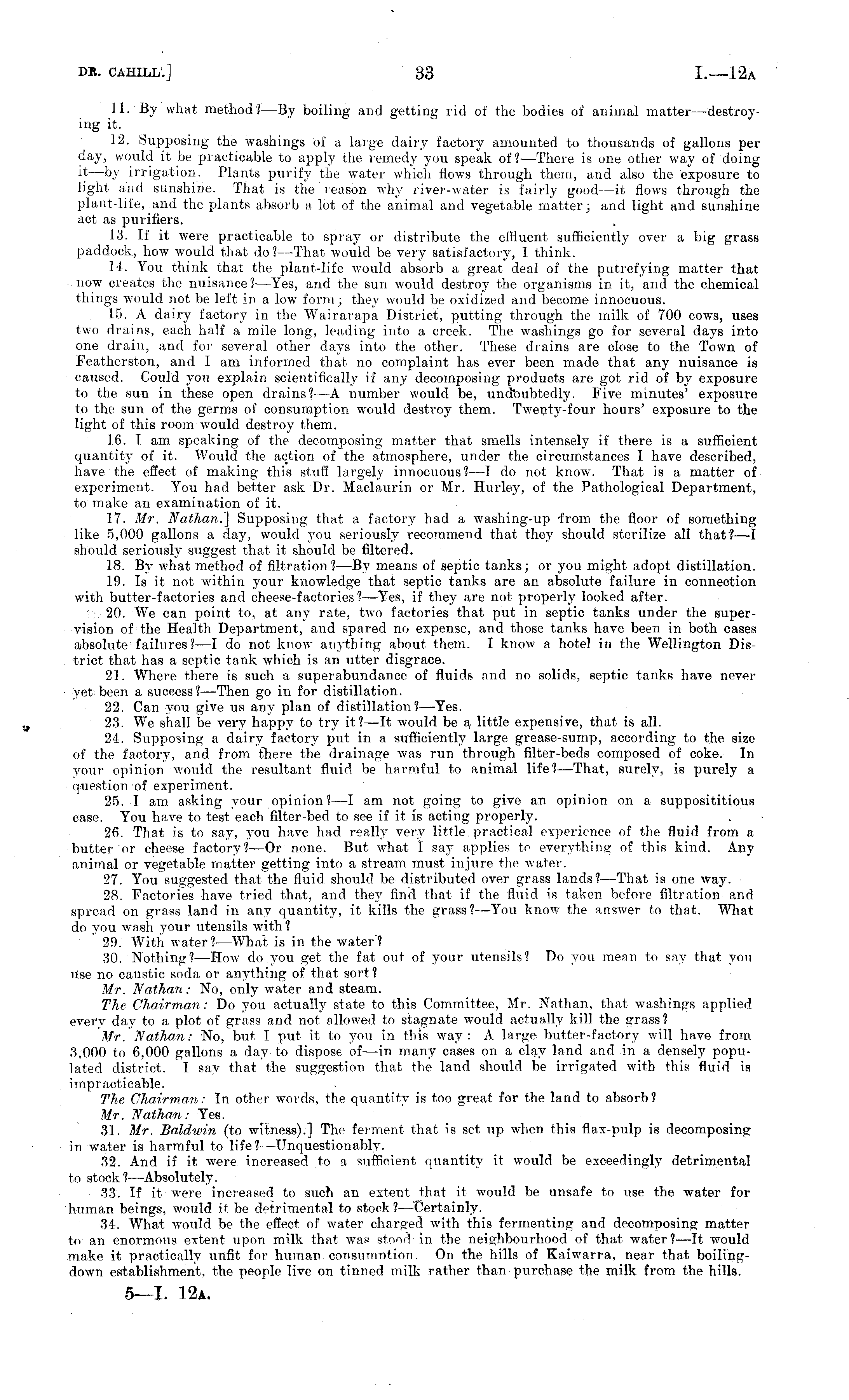 11. By what method? —By boiling and getting rid of the bodies of animal matter —destroying it. 12. Supposing the washings of a large dairy factory amounted to thousands of gallons per day, would it be practicable to apply the remedy you speak of? —There is one other way of doing it—by irrigation. Plants purify the water which flows through them, and also the exposure to light and sunshine. That is the reason why river-water is fairly good—it flows through the plant-life, and the plants absorb a lot of the animal and vegetable matter; and light and sunshine act as purifiers. 13. If it were practicable to spray or distribute the effluent sufficiently over a big grass paddock, how would that do?— That would be very satisfactory, I think. 14. You think that the plant-life would absorb a great deal of the putrefying matter that now creates the nuisance?— Yes, and the sun would destroy the organisms in it, and the chemical things would not be left in a low form; they would be oxidized and become innocuous. 15. A dairy factory in the Wairarapa District, putting through the milk of 700 cows, uses two drains, each half a mile long, leading into a creek. The washings go for several days into one drain, and for several other days into the other. These drains are close to the Town of Featherston, and I am informed that no complaint has ever been made that any nuisance is caused. Could you explain scientifically if any decomposing products are got rid of by exposure to the sun in these open drains?-—A number would be, undoubtedly. Five minutes' exposure to the sun of the germs of consumption would destroy them. Twenty-four hours' exposure to the light of this room would destroy them. 16. I am speaking of the decomposing matter that smells intensely if there is a sufficient quantity of it. Would the action of the atmosphere, under the circumstances I have described, have the effect of making this stuff largely innocuous ?—I do not know. That is a matter of experiment. You had better ask Dr. Maclaurin or Mr. Hurley, of the Pathological Department, to make an examination of it. 17. Mr. Nathan,] Supposing that a factory had a washing-up from the floor of something like 5,000 gallons a day, would you seriously recommend that they should sterilize all that?—l should seriously suggest that it should be filtered. 18. By what method of filtration? —By means of septic tanks; or you might adopt distillation. 19. Is it not within your knowledge that septic tanks are an absolute failure in connection with butter-factories and cheese-factories? —Yes, if they are not properly looked after. 20. We can point to, at any rate, two factories that put in septic tanks under the supervision of the Health Department, and spared no expense, and those tanks have been in both cases absolute failures? —I do not know anything about them. I know a hotel in the Wellington District that has a septic tank which is an utter disgrace. 21. Where there is such a superabundance of fluids and no solids, septic tanks have never yet been a success?— Then go in for distillation. 22. Can you give us any plan of distillation?— Yes. 23. We shall be very happy to try it?—lt would be a little expensive, that is all. 24. Supposing a dairy factory put in a sufficiently large grease-sump, according to the size of the factory, and from there the drainage was run through filter-beds composed of coke. In your opinion would the resultant fluid be harmful to animal life?— That, surely, is purely a question of experiment. 25. I am asking your opinion?—l am not going to give an opinion on a supposititious case. You have to test each filter-bed to see if it is acting properly. 26. That is to say, you have had really very little practical experience of the fluid from a butter or cheese factory?—Or none. But what I say applies to everything of this kind. Any animal or vegetable matter getting into a stream must injure the water. 27. You suggested that the fluid should be distributed over grass lands?— That is one way. 28. Factories have tried that, and they find that if the fluid is taken before filtration and spread on grass land in any quantity, it kills the grass?— You know the answer to that. What do you wash your utensils with ? " 29. With water? —What is in the water'? 30. Nothing?— How do you get the fat out of your utensils? Do you mean to say that you use no caustic soda or anything of that sort? Mr. Nathan: No, only water and steam. The Chairman: Do you actually state to this Committee, Mr. Nathan, that washings applied every day to a plot of grass and not allowed to stagnate would actually kill the grass? Mr. Nathan: No, but I put it to you in this way: A large butter-factory will have from 3,000 to 6,000 gallons a day to dispose of—in many cases on a clay land and in a densely populated district. I say that the suggestion that the land should be irrigated with this fluid is impracticable. The Chairman: In other words, the quantity is too great for the land to absorb? Mr. Nathan: Yes. 31. Mr. Baldwin (to witness).] The ferment that is set up when this flax-pulp is decomposing in water is harmful to life? -Unquestionably. 32. And if it were increased to a sufficient quantity it would be exceedingly detrimental to stock? —Absolutely. 33. If it were increased to such an extent that it would be unsafe to use the water for human beings, would it be detrimental to stock? —Certainly. 34. AVhat would be the effect of water charged with this fermenting and decomposing matter to an enormous extent upon milk that was stood in the neighbourhood of that water?—lt would make it practically unfit for human consumption. On the hills of Kaiwarra, near that boilingdown establishment, the people live on tinned milk rather than purchase the milk from the hills.