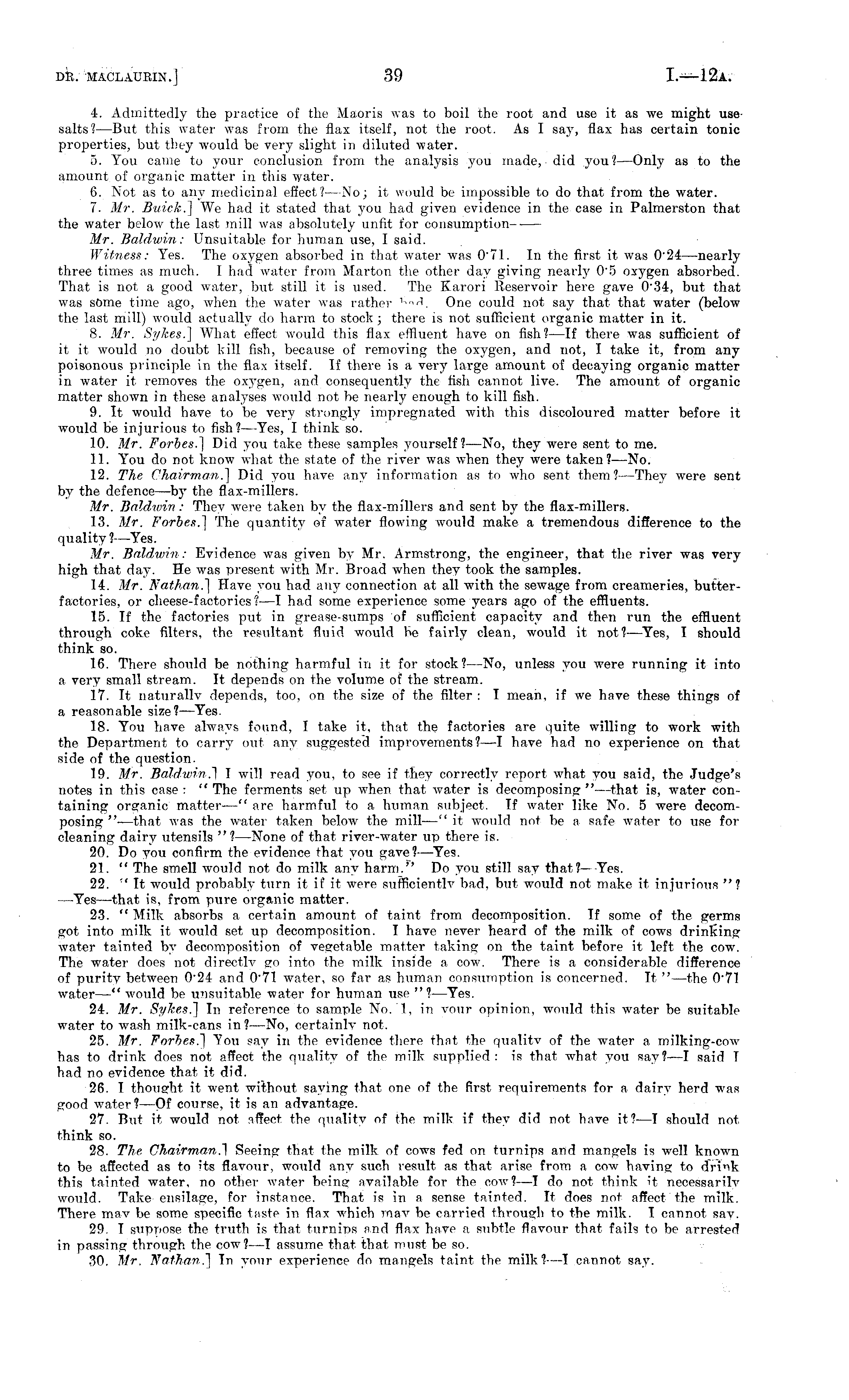 4. Admittedly the practice of the Maoris was to boil the root and use it as we might usesalts? —But this water was from the flax itself, not the root. As I say, flax has certain tonic properties, but they would be very slight in diluted water. 5. You came to your conclusion from the analysis you made, did you?— Only as to the amount of organic matter in this water. 6. Not as to any medicinal effect? —No; it would be impossible to do that from the water. 7. Mr. Buick.] We had it stated that you had given evidence in the case in Palmerston that the water below the last mill was absolutely unfit for consumption Mr. Baldwin: Unsuitable for human use, I said. Witness: Yes. The oxygen absorbed in that water was 0"71. In the first it was o'24—nearly three times as much. I had water from Marton the other day giving nearly 0"5 oxygen absorbed. That is not a good water, but still it is used. The Karori Reservoir here gave 034, but that was some time ago, when the water was rather '-"■"!. One could not say that that water (below the last mill) would actually do harm to stock ; there is not sufficient organic matter in it. 8. Mr. Sykes.] What effect would this flax effluent have on fish?—lf there was sufficient of it it would no doubt kill fish, because of removing the oxygen, and not, I take it, from any poisonous principle in the flax itself. If there is a very large amount of decaying organic matter in water it removes the ox3*gen, and consequently the fish cannot live. The amount of organic matter shown in these analyses would not be nearly enough to kill fish. 9. It would have to be very strongly impregnated with this discoloured matter before it would be injurious to fish?— Yes, I think so. 10. Mr. Forbes.] Did you take these samples yourself? —No, they were sent to me. 11. You do not know what the state of the river was when they were taken? —No. 12. The Chairman.] Did you have any information as to who sent them? —They were sent by the defence—by the flax-millers. Mr. Baldwin: They were taken by the flax-millers and sent by the flax-millers. 13. Mr. Forbes.] The quantity of water flowing would make a tremendous difference to the quality?— Yes. Mr. Baldwin: Evidence was given by Mr. Armstrong, the engineer, that the river was very high that day. He was present with Mr. Broad when they took the samples. 14. Mr. Nathan.] Have you had any connection at all with the sewage from creameries, butterfactories, or cheese-factories ?—I had some experience some years ago of the effluents. 15. If the factories put in grease-sumps of sufficient capacity and then run the effluent through coke filters, the resultant fluid would be fairly clean, would it not?— Yes, I should think so. 16. There should be nothing harmful in it for stock? —No, unless you were running it into a very small stream. It depends on the volume of the stream. 17. It naturally depends, too, on the size of the filter : I mean, if we have these things of a reasonable size? —Yes. 18. You have always found, I take it, that the factories are quite willing to work with the Department to carry out any suggested improvements?—l have had no experience on that side of the question. 19. Mr. Baldwin,] I will read you, to see if they correctly report what you said, the Judge's notes in this case : " The ferments set up when that water is decomposing " —that is, water containing organic matter —" are harmful to a human subject. If water like No. 5 were decomposing " —that was the water taken below the mill—"it would not be a safe water to use for cleaning dairy utensils "? —None of that river-water up there is. 20. Do you confirm the evidence that you gave? —Yes. 21. " The smell would not do milk any harm." Do you still say that?— Yes. 22. "It would probably turn it if it were sufficiently bad, but would not make it injurious "1 —Yes—that is, from pure organic matter. 23. " Milk absorbs a certain amount of taint from decomposition. If some of the germs got into milk it would set up decomposition. I have never heard of the milk of cows drinking water tainted by decomposition of vegetable matter taking on the taint before it left the cow. The water does not directly go into the milk inside a cow. There is a considerable difference of purity between 024 and o'7l water, so far as human consumption is concerned. It " —the o'7l water —" would be unsuitable water for human use "1 —Yes. 24. Mr. Sykes.] In reference to sample No. 1, in your opinion, would this water be suitable water to wash milk-cans in ?—No, certainly not. 25. Mr. Forbes.] You say in the evidence there that the quality of the water a milking-cow has to drink does not affect the quality of the milk supplied : is that what you say?—l said T had no evidence that it did. 26. I thought it went without saying that one of the first requirements for a dairy herd was good water? —Of course, it is an advantage. 27. But it would not affect the quality of the milk if they did not have it? —I should not think so. 28. The, Chairman.] Seeing that the milk of cows fed on turnips and mangels is well known to be affected as to its flavour, would any such result as that arise from a cow having to drink this tainted water, no other water being available for the cow? —I do not think it necessarily would. Take ensilage, for instance. That is in a sense tainted. It does not affect the milk. There may be some specific taste in flax which may be carried through to the milk. I cannot say. 29. I suppose the truth is that turnips and flax have a subtle flavour that fails to be arrested in passing through the cow? —I assume that that must be so. 30. Mr. Nathan.] Tn your experience do mangels taint the milk? —T cannot say.