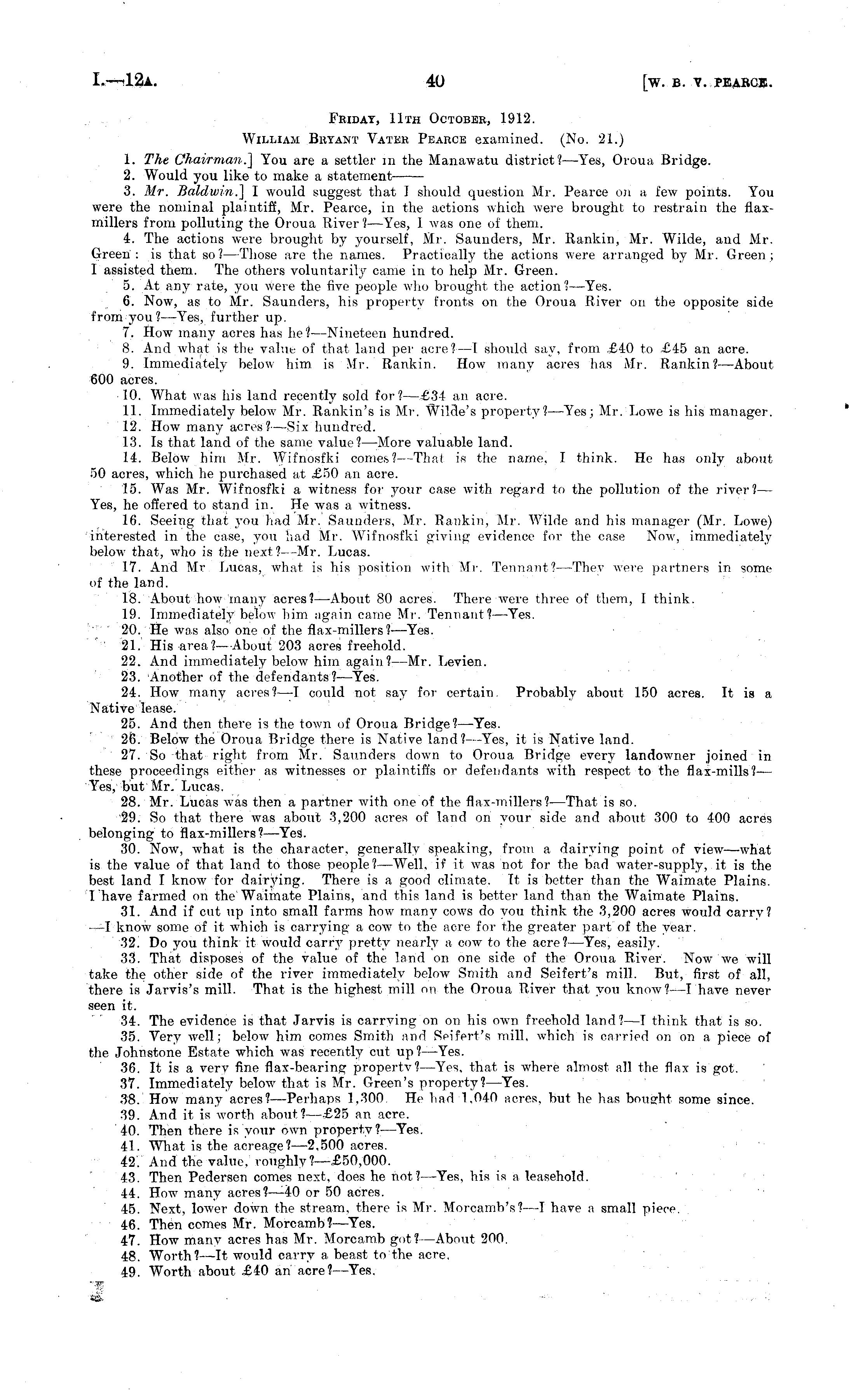 Friday, 11th October, 1912. William Bryant Vater Pearce examined. (No. 21.) 1. The Chairman,] You are a settler in the Manawatu district? —Yes, Oroua Bridge. 2. Would you like to make a statements 3. Mr. Baldwin.] I would suggest that I should question Mr. Pearce on a few points. You were the nominal plaintiff, Mr. Pearce, in the actions which were brought to restrain the flaxmillers from polluting the Oroua River ? —Yes, 1 was one of them. 4. The actions were brought by yourself, Mr. Saunders, Mr. Rankin, Mr. Wilde, and Mr. Green: is that so? —Those are the names. Practically the actions were arranged by Mr. Green; I assisted them. The others voluntarily came in to help Mr. Green. 5. At any rate, you were the five people who brought the action?— Yes. 6. Now, as to Mr. Saunders, his property fronts on the Oroua River on the opposite side from you?— Yes, further up. 7. How many acres has he? —Nineteen hundred. 8. And what is the value of that land per acre? —I should say, from £40 to £45 an acre. 9. Immediately below him is Mr. Rankin. How many acres has Mr. Rankin? —About, 600 acres. 10. What was his land recently sold for?—£34 an acre. 11. Immediately below Mr. Rankin's is Mr. Wilde's property? —Yes; Mr. Lowe is his manager. 12. How many acres?— Six hundred. 13. Is that land of the same value? —More valuable land. 14. Below him Mr. Wifnosfki comes? —That is the name, I think. He has only about 50 acres, which he purchased at £50 an acre. 15. Was Mr. Wifnosfki a witness for your case with regard to the pollution of the river? — Yes, he offered to stand in. He was a witness. 16. Seeing that you had Mr. Saunders, Mr. Rankin, Mr. Wilde and his manager (Mr. Lowe) interested in the case, you had Mr. Wifnosfki giving evidence for the case Now, immediately below that, who is the next?— Mr. Lucas. 17. And Mr Lucas, what is his position with Mr. Tennant?—They were partners in some of the land. 18. About how many- acres? —About 80 acres. There were three of them, [ think. 19. Immediately below him again came Mr. Tennant?—Yes. 20. He was also one of the flax-millers? —Yes. 21. His area? —About 203 acres freehold. 22. And immediately below him again?— Mr. Levien. 23. Another of the defendants?— Yes. 24. How many acres?—l could not say for certain. Probably about 150 acres. It is a Native lease. 25. And then there is the town of Oroua Bridge?— Yes. 26. Below the Oroua Bridge there is Native land? —Yes, it is Native land. 27. So that right from Mr. Saunders down to Oroua Bridge every landowner joined in these proceedings either as witnesses or plaintiffs or defendants with respect to the flax-mills? — Yes, but Mr. Lucas. 28. Mr. Lucas was then a partner with one of the flax-millers? —That is so. '29. So that there was about 3,200 acres of land on your side and about 300 to 400 acres belonging to flax-millers? —Yes. 30. Now, what is the character, generally speaking, from a dairying point of view—what is the value of that land to those people?— Well, if it was not for the bad water-supply, it is the best land I know for dairying. There is a good climate. It is better than the Waimate Plains. I have farmed on the Waimate Plains, and this land is better land than the Waimate Plains. 31. And if cut up into small farms how many cows do you think the 3,200 acres would carry? —I know some of it which is carrying a cow to the acre for the greater part of the year. 32. Do you think it would carry pretty nearly a cow to the acre?— Yes, easily. 33. That disposes of the value of the land on one side of the Oroua River. Now we will take the other side of the river immediately below Smith and Seifert's mill. But, first of all, there is Jarvis's mill. That is the highest mill on the Oroua River that you know?—lhave never seen it. 34. The evidence is that Jarvis is carrying on on his own freehold land?—l think that is so. 35. Very well; below him comes Smith and Seifert's mill, which is carried on on a piece of the Johnstone Estate which was recently cut up?— Yes. 36. It is a very fine flax-bearing propertv?—Yes, that is where almost all the flax is got. 37. Immediately below that is Mr. Green's property?— Yes. 38. How many acres? —Perhaps 1,300. He had 1,040 acres, but he has bought some since. 39. And it is worth about? —£25 an acre. 40. Then there is your own property? —Yes. 41. What is the acreage?—2,soo acres. 42. And the value, roughly ?—£50,000. 43. Then Pedersen comes next, does he not? —Yes, his is a leasehold. 44. How many acres? —-40 or 50 acres. 45. Next, lower down the stream, there is Mr. Morcamb's? —I have a small piece. 46. Then comes Mr. Morcamb? —Yes. 47. How many acres has Mr. Morcamb got?— About 200. 48. Worth? —It would carry a beast to the acre, 49. Worth about £40 an acre? —Yes.