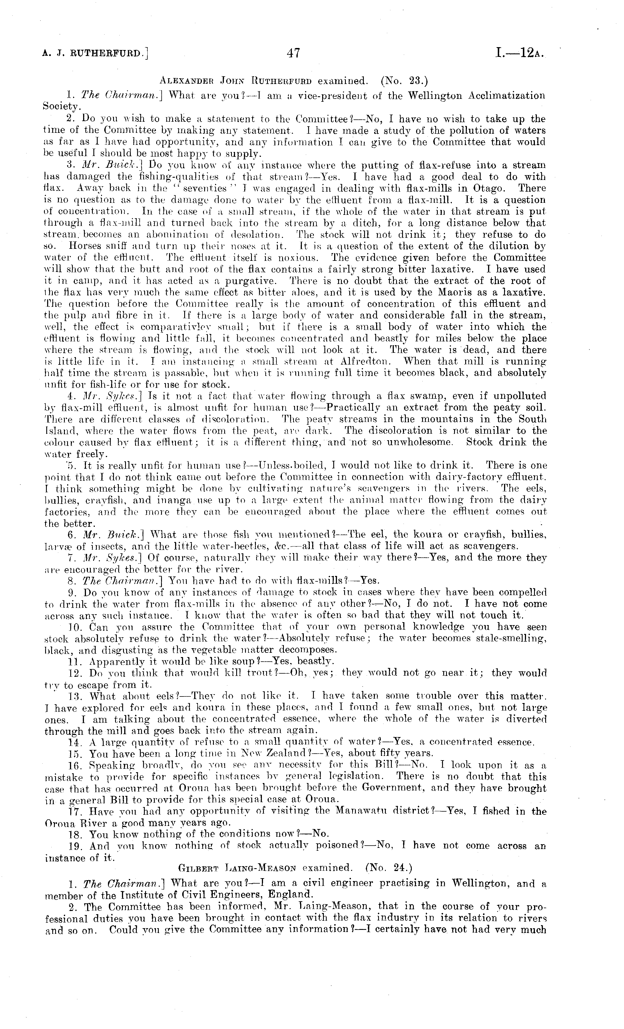 .Alexander John Ruthehfurd examined. (No. 23.) 1. The Chairman.] What are you?—l am a vice-president of the Wellington Acclimatization Society. 2. Do you wish to make a statement to the Committee? —No, I have no wish to take up the time of the Committee by making any statement. I have made a study of the pollution of waters as far as 1 have had opportunity, and any information I can give to the Committee that would be useful 1 should be most happy to supply. 3. Mr. Buick.] Do you know of any instance where the putting of flax-refuse into a stream has damaged the fishing-qualities of that stream?— Yes. I have had a good, deal to do with flax. Away back in the "seventies" 1 was engaged in dealing with flax-mills in Otago. There is no question as to the damage done to water by the effluent from a flax-mill. It is a question of concentration. In the ease of a small stream, if the whole of the water in that stream is put through a flax-mill and turned back into the stream by a ditch, for a long distance below that stream, becomes an abomination of desolation. The stock will not drink it; they refuse to do so. Horses sniff and turn up their noses at it. It is a question of the extent of the dilution by water of the effluent. The effluent itself is noxious. The evidence given before the Committee will show that the butt and root of the flax contains a fairly strong bitter laxative. I have used it in camp, and it has acted as a purgative. There is no doubt that the extract of the root of the flax has very much the same effect as bitter aloes, and it is used by the Maoris as a laxative. The question before the Committee really is the amount of concentration of this effluent and the pulp and fibre in it. If there is a large body of water and considerable fall in the stream, well, the effect is comparativley small; but if there is a small body of water into which the effluent is flowing and little fall, it becomes concentrated and beastly- for miles below the place where the stream is flowing, and the stock will not look at it. The water is dead, and there is little life in it. 1 am instancing a small stream at Alfredton. When that mill is running half time the stream is passable, but when it is running full time it becomes black, and absolutely unfit for fish-life or for use for stock. 4. Mr. Sykes.] Is it not a fact that water flowing through a flax swamp, even if unpolluted by flax-mill effluent, is almost unfit for human use? —Practically an extract from the peaty soil. There are different classes of discoloration. The peaty streams in the mountains in the South Island, where the water flows from the peat, at';' dark. The discoloration is not similar to the colour caused by flax effluent; it is a different thing, and not so unwholesome. Stock drink the water freely. '5. It is really unfit foi human use?— Unless.boiled, I would not like to drink it. There is one point that I do not think came out before the Committee in connection with dairy-factory effluent. I think something might be done by cultivating nature's scavengers in the rivers. The eels, bullies, crayfish, and iuanga use up to a largo extent the animal matter flowing from the dairy factories, and the more they can lie encouraged about the place where the effluent comes out the better. 6. Mr. Buick.] What are those fish you mentioned? —The eel, the koura or crayfish, bullies, larva? of insects, and the little water-beetles, <fee. —all that class of life will act as scavengers. 7. Mr. Sykes.] Of course, naturally they will make their way there?— Yes, and the more they are encouraged the better for the river. 8. The Chairman.] You have had to do with flax-mills? —Yes. 9. Do you know of any instances of damage to stock in cases where they have been compelled to drink the water from flax-mills in the absence of any other?—-No, I do not. I have not come across any such instance. I know that the water is often so bad that they will not touch it. 10. Can you assure the Committee that of your own personal knowledge you have seen stock absolutely refuse to drink the water I—Absolutelyl—Absolutely refuse; the water becomes stale-smelling, black, and disgusting as the vegetable matter decomposes. 11. Apparently it would be like soup?— Yes. beastly. 12. Do you think that would kill trout?—Oh, yes; they would not go near it; they would Irv to escape from it. 13. What about eels? —They do not like it. I have taken some trouble over this matter. I have explored for eels and koura in these places, and I found a few small ones, but not large ones. I am talking about, the concentrated essence, where the whole of the water is diverted through the mill and goes back into the stream again. 14. A large quantity of refuse to a small quantity of water? —-Yes, a concentrated essence. 15. You have been a long time in New Zealand?— Yes, about fifty years. 16. Speaking broadly, do you see any necessity for this Bill?— No. I look upon it as a mistake to provide for specific instances by general legislation. There is no doubt that this case that has occurred at Oroua has been brought before the Government, and they have brought in a general Bill to provide for this special case at Oroua. 17. Have you had any opportunity of visiting the Manawatu district? —Yes, T fished in the Oroua River a good many years ago. 18. You know nothing of the conditions now?— No. 19. And you know nothing of stock actually poisoned?—No, T have not come across an instance of it. Gilbert Laing-Meason examined. (No. 24.) 1. The Chairman.] What are you?—l am a civil engineer practising in Wellington, and a member of the Institute of Civil Engineers, England. 2. The Committee has been informed, Mr. Laing-Meason, that in the course of your professional duties you have been brought in contact with the flax industry in its relation to rivers and so on. Could you give the Committee any information? —I certainly have not had very much