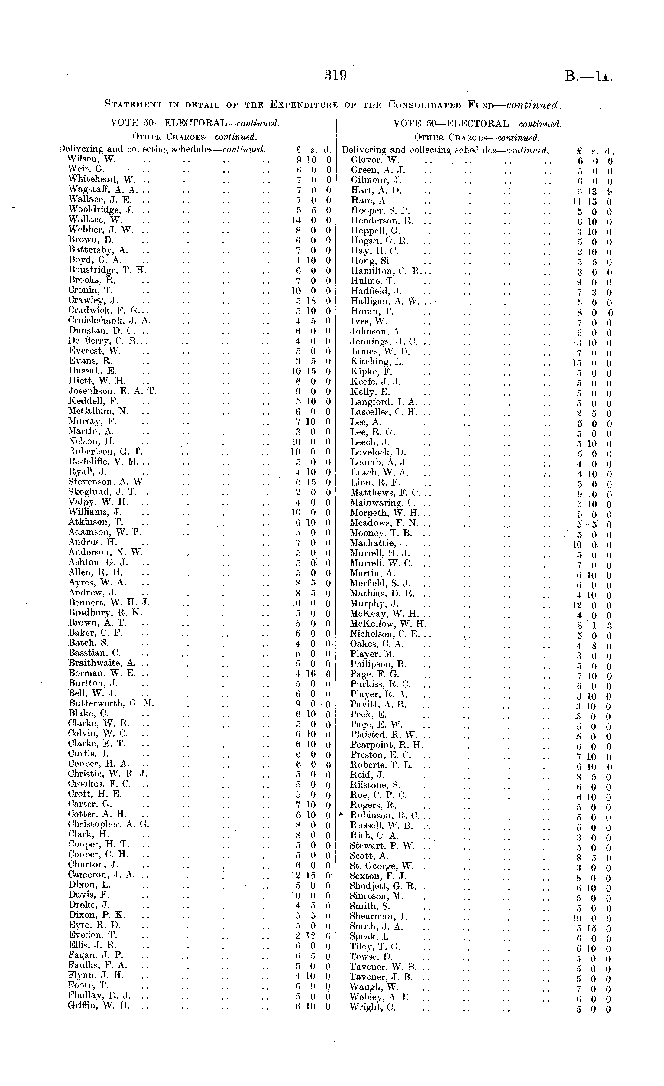 Statement in detail op the Expenditure of the Consolidated Fund— continued. VOTE 50—ELECTORAL -continued. VOTE 50—ELECTORAL— continued. Other Charges— continued. Other Charges — continued. Delivering and collecting schedules — continued. {' s. d. Delivering and collecting schedules— continued. £ s. «1 Wilson, W. .. .. .. .. 010 0 G lover. W. .. .. .. .. 6 0 0 Weir-, G. .. .. .. . . 6 0 0 Green, A. .!. .. .. . . . . 5 0 0 Whitehead, W. .. .. .. . . 7 0 0 Gilmour, J. .. .. .. . . (i 0 0 Wagstaff, A. A. .. .. .. .. 7 0 0 Hart, A. I). .. .. .: .. (i 13 9 Wallace, J. E. .. .. .. .. 7 0 0 Hare, A. .. .. .. .. II 15 0 Wooldridge, J. .. .. .. .. 5 5 0 Hooper, 8. P. .. .. .. .. 5 0 0 Wallace, W. .. .. .. .. MOO Henderson, R. .. .. .. (i 10 0 Webber, J. W. .. .. .. .. 8 0 0 Heppell, G. .. .. .. .. 310 0 Brown, D. .. .. .. .. 6 0 0 Hogan, G. H. .. .. .-> o 0 Battersby, A. .. .. .. .. 7 0 0 Hay, H. C. .. .. .. 210 0 Boyd, G. A. .. .. .. .. I 10 0 Hong, Si .. .. .. 5 5 0 Boustridge, T. li. .. .. .. (i 0 0 Hamilton,!'. R... .. .. .. :! 0 0 Brooks. K. .. .. .. . . 7 0 0 Hulrae, T. .. .. .. .. 9 0 0 Oonin, T. .. .. .. .. 10 0 0 Hadfleld, J. .. .. .. .. 7 3 0 Crawley, J. .. .. .. .. SIS 0 Halligan, A. W. .. ■.. .. .. r> 0 0 Oradwick, F. G... .. .. .. 5 10 0 Koran, T. .. .. .. .. 8 0 0 Oruickshank, .!. A. . . .. . . 4 r> 0 Ives, W. .. .. .. .. 7 0 0 Dunstan, D. ('. .. .. .. .. 6 0 0 Johnson, A. .. .. .. 6 0 0 De Berry, C. R... .. .. .. 4 0 0 Jennings, H. C. .. .. .. .. 310 0 Everest, W. .. .. . . .. 5 0 0 James, W. I). .. .. . . .. 7 0 0 Evans, R. .. .. .. .. 3 5 0 Kitohing, L. .. .. .. . 15 0 0 Hassall, E. .. .. .. .. 10 15 0 Kipke, F. .... 5 0 0 Hiett, W. H. .. .. .. .. 6 0 0 Keefe, J. J. .. .. .. .. 5 0 0 Josephson, E. A. T. .. .. . . 9 0 0 Kelly, K. .. .. . . . . 5 0 0 Keddell, F. .. .. .. .. 510 0 Langford, J. A. .. .. .. .. 5 0 0 McCallum, N. .. .. .. .. 6 0 0 Lasoelles, C. H. .. .. .. 2 5 0 Murray, F. .. .. .. .. 7 10 0 Lee, A. .. .. .. 5 0 0 Martin, A. .. .. .. .. 3 0 0 Lee, R. G. .. .. .. . .' 5 0 0 Nelson, H. .. .. .. .. 10 0 0 Leech,.!. .. .. 510 o Robertson, G. T. .. .. .. 10 0 0 Lovelock. I). .. .. .. 5 0 0 tUdcliffe, V. M. .. .. .. .. 5 0 0 Loomb, A. J. .. .. 4 0 0 Ryall, J. .. .. .. .. 410 0 Leach, W. A. .. .. .. 410 0 Stevenson. A. W. .. .. .. fi 15 0 Linn, R. I<\ .. .. .. .. 5 0 0 Skoglund, J. T. .. .. . . .. 2 0 0 .Matthews, F. ('. .. .. .. ~ 90 0 Valpy, W. H. .. .. .. .. 4 0 0 Mainwaring, C. .. .. (i 10 0 Williams,.!. .. .. .. .. 10 0 0 Morpeth, W. H. .. .. .. .. r> 0 0 Atkinson, T. .. .. , .. .. 610 0 Meadows, F. N. .. .. ... .. 55 0 Adamson, W. P. .. . . .. 5 0 0 Mooney, T. B. .. .. .. . . 5 0 0 Andrtis, H. .. .. .. .. 700 Maohattie, J. .. .. .. 10 0 0 Anderson, N. W. .. . . . . 5 0 0 Murrell, H. J. .... 5 0 0 Ashton, G. J. .. . . .. . . 5 0 0 Murrell, W. C. .. .. 7 0 0 Allen. R. H. .. .. .. .. 5 0 0 Martin, A. .. .. .. 010 0 Ayres, W. A. .. .. .. .. 8 5 0 Merfleld, S. J. .. .. .. .' (i 0 0 Andrew, J. . . .. . . .. 8 5 0 Mathias, D. R. .. .. 410 0 Bennett, W. H. J. .. .. .. 10 0 0 Murphy, J. .. .. . 12 0 0 Bradbury, R. K. .. .. .. 5 0 0 McKeay, W. H. . . . . .. " 4 0 0 Brown, A. T. .. . . .. 5 0 0 McKellow, W. H. .. 81 3 Baker, C. F. .. .. . . . . 5 0 0 Nicholson, C. E. .. .. 5 0 0 Batch, S. .. . . .. .. 4 0 0 Oakes, C. A. .. . . .. .. 4 8 0 Basstian, C. .. .. .. .. 50 0 Player, M. .. .. .. .' 30 0 Braithwaite, A. . . . . .. .. 50 0 Philipson, R. .. .. .. 5 0 0 Borman, W. E. .. .. .. .. 416 6 Page, F. G. .. .. .. .' 710 0 Burtton, J. .. .. .. .. 5 0 0 Pnrkiss, R. C. .. .. 6 0 0 Bell, W. J. .. .. .. . . 6 0 0 Player, R. A. .... 310 () Butterworth, G. M. .. .. .. !) 0 0 Pavitt, A. R. .. .. .. 310 0 Blake, C. .. .. .. .. 610 0 Peek, E. .. .. .. .' 5 0 0 OUrke, W. R. .. . . .. . . 5 0 0 Page, E. W. .. . . . g (j 0 Colvin, W. C. .. .. .. .. 610 0 Plaisted, R. W. .. .. .. " 5 0 0 Clarke, E. T. .. .. .. .. 610 0 Pearpoint, R. H. .. .. .'. 6 0 0 Curtis, J. .. .. .. .. (i 0 0 Preston, E. C. .. . . .. .. 710 0 Cooper, H. A. . . .. .. ... 600 Roberts, T. L. ... . .. ' 6100 Christie, W. R. .T. . . . . . . 5 0 0 Reid, J. .. .. .. .' 8 5 0 Crookes, F. C. .. . . .. .. 50 0 Rilstone, S. . . .. .' 60 0 Croft, H. E. . . . . .. .. 50 0 Roe, C. P. C. .. . . . . " (i 10 0 Carter, G. .. .. .. .. 7100 Rogers, R. .. .. .. .] 5 0 0 Cotter, A. H. .. .. .. .. 610 0 *• Robinson, R. C. ~ .. 5 0 0 Christopher, A. G. . . .. . . 8 0 0 Russell, W. B. .. .. .. 5 0 0 Clark, H. .. . . .. .. 80 0 Rich, C. A. . . . . .. " 30 0 Cooper, H. T. .. .. .. .. 5 0 0 Stewart, P. W. .. .. .. .' 5 0 0 Cooper, C. H. .. .. . . .. 5 0 0 Scott, A. .. . . 8 5 0 Churton, J. .. . . .. . . 6 0 0 St. George, W. .. .. .. .. 3 0 0 Cameron, J. A. .. .. !. .. 12 15 0 Sexton, F. J. .. .. .. " 80 0 Dixon, L. . ... . . ■ . . 5 0 0 Shodjett, G. R. . . .. 610 0 Davis, F. . . .. .. . . 10 0 0 Simpson, M. .. . . . . 5 0 0 Drake, J. .. .. . . .. 4 5 0 Smith, S. . . . . .. " 5 0 0 Dixon, P. K. .. .. .. .. 5 5 0 Shearman, J. .. .. .. .. 10 0 0 Eyre, R. D. .. .. .. .. 50 0 Smith, J. A. .. -, lg n Evedon, T. .. .. .. .. 212 6 Speak, L. .. (i 0 0 Ell'S 'T. R. ■ • .. .. .. 6 0 0 Tiley, T. G. alO 0 Pagan, J. P. .. .. .. .. 6 5 0 Towse. I). .. ~ . 5 0 0 Faulks, F. A. .. . . .. . . 50 0 Tavener, W. B. .... . . " 50 0 Flynn, J. H. .. .. .. .. 410 0 Tavener, J. B. .. .. ' 5 0 0 Foote, T. .. .. . . . . 5 9 0 Waugh, W. .. . . .. 7 0 0 Findlay, I!.. .!. .. .. .. .. 50 0 Webley, A. E. .. 1.600 Griffin, W. H. .. .. .. .. 610 0 Wright, C. ... 5 0 0