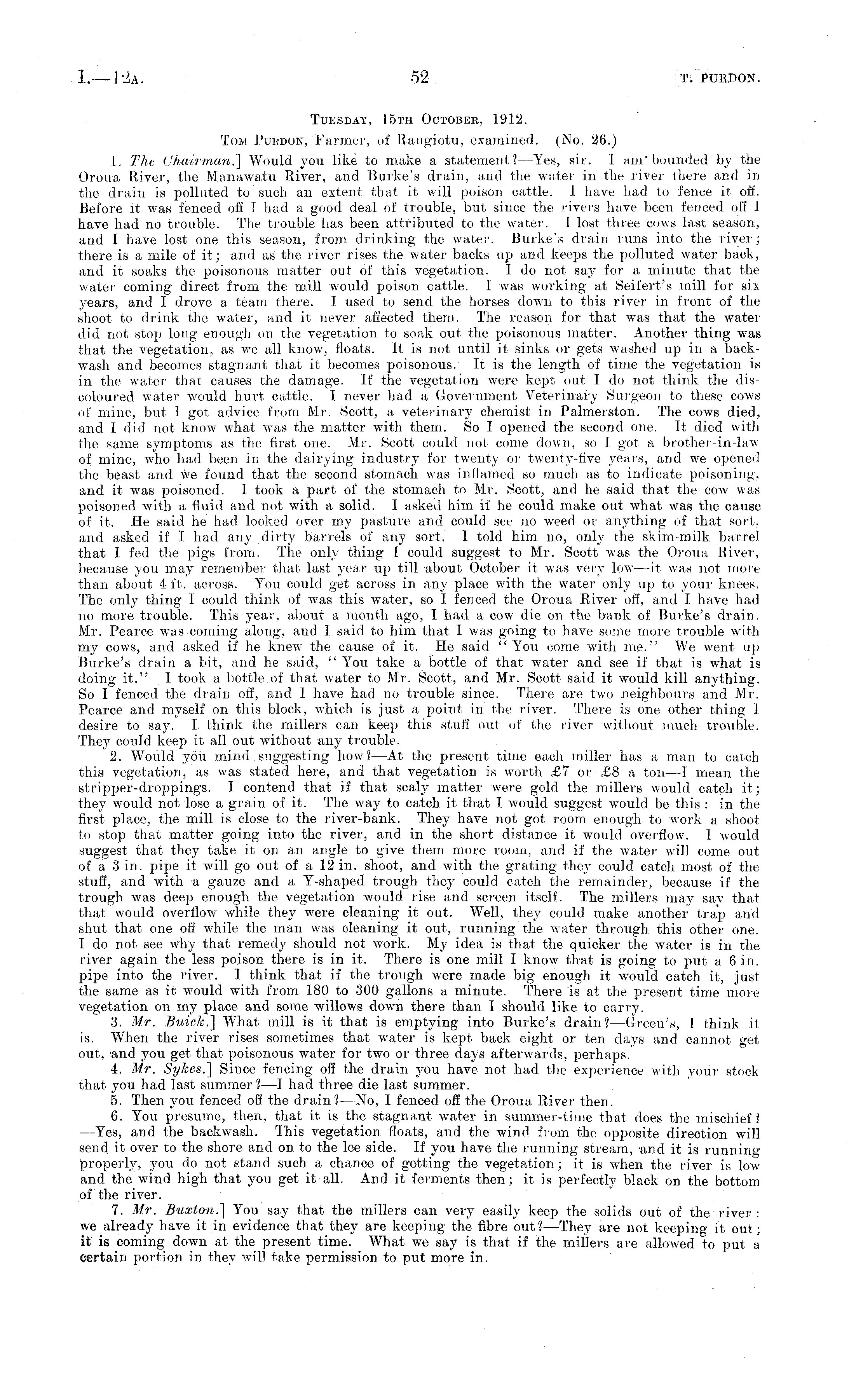Tuesday, 15th October, 1912. Tom Pukdon, Farmer, of Raugiotu, examined. (No. 26.) 1. The Chairman.] Would you like to make a statement?— Yes, sir. I am'bounded by the Oroua River, the Manawatu River, and Burkes drain, and the water in the river there and in the drain is polluted to such an extent that it will poison cattle. I have had to fence it off. Before it was fenced off I had a good deal of trouble, but since the rivers have been fenced off 1 have had no trouble. The trouble has been attributed to the water. 1 lost three cows last season, and I have lost one this season, from drinking the water. Burkes drain runs into the river; there is a mile of it; and as the river rises the water backs up and keeps the polluted water back, and it soaks the poisonous matter out of this vegetation. I do not say for a minute that the water coming direct from the mill would poison cattle. 1 was working at Seifert's mill for six years, and 1 drove a team there. I used to send the horses down to this river in front of the shoot to drink the water, and it never affected them. The reason for that was that the water did not stop long enough on the vegetation to soak out the poisonous matter. Another thing was that the vegetation, as we all know, floats. It is not until it sinks or gets washed up in a backwash and becomes stagnant that it becomes poisonous. It is the length of time the vegetation is in the water that causes the damage. If the vegetation were kept out I do not think the discoloured water would hurt cattle. I never had a Government Veterinary Surgeon to these cows of mine, but 1 got advice from Mr. Scott, a veterinary chemist in Palmerston. The cows died, and I did not know what was the matter with them. So I opened the second one. It died with the same symptoms as the first one. Mr. Scott could not come down, so I got a brother-in-law of mine, wdio had been in the dairying industry- for twenty- or twenty-five years, and we opened the beast and we found that the second stomach was inflamed so much as to indicate poisoning, and it was poisoned. I took a part of the stomach to Mr. Scott, and he said that the cow was poisoned with a fluid and not with a solid. I asked him if he could make out what was the cause of it. He said he had looked over my pasture and could see no weed or anything of that sort, and asked if I had any dirty barrels of any sort. 1 told him no, only the skim-milk barrel that I fed the pigs from. The only thing I could suggest to Mr. Scott was the Oroua River, because you may remember that last year up till about October it was very low —it was not more than about 4 ft. across. You could get across in any T place with the water only up to your knees. The only thing I could think of was this water, so I fenced the Oroua River off, and I have had no more trouble. This year, about a month ago, I had a cow die on the bank of Burkes drain. Mr. Pearce was coming along, and I said to him that I was going to have some more trouble with my cows, and asked if he knew the cause of it. He said " You come with me." We went up Burkes drain a bit, and he said, " Y r ou take a bottle of that water and see if that is what is doing it." I took, a bottle of that water to Mr. Scott, and Mr. Scott said it would kill anything. So I fenced the drain off, and I have had no trouble since. There are two neighbours and Mr. Pearce and myself on this block, which is just a point in the river. There is one other thing 1 desire to say. I think the millers can keep this stuff out of the river without much trouble. They could keep it all out without any trouble. 2. Would you mind suggesting how?—At the present time each miller has a man to catch this vegetation, as was stated here, and that vegetation is worth £7 or £8 a ton —I mean the stripper-droppings. I contend that if that scaly matter were gold the millers would catch it; they would not lose a grain of it. The way to catch it that I would suggest would be this :in the first place, the mill is close to the river-bank. They have not got room enough to work a shoot to stop that matter going into the river, and in the short distance it would overflow-. I would suggest that they take it on an angle to give them more room, and if the water will come out of a 3 in. pipe it will go out of a 12 in. shoot, and with the grating they could catch most of the stuff, and with a gauze and a Y-shaped trough they could catch the remainder, because if the trough was deep enough the vegetation would rise and screen itself. The millers may say that that would overflow while they were cleaning it out. Well, they could make another trap and shut that one off while the man was cleaning it out, running the water through this other one. I do not see why that remedy should not work. My idea is that the quicker the water is in the river again the less poison there is in it. There is one mill I know that is going to put a 6 in. pipe into the river. I think that if the trough were made big enough it would catch it, just the same as it would with from 180 to 300 gallons a minute. There is at the present time more vegetation on my place and some willows down there than I should like to carry. 3. Mr. Buick.] What mill is it that is emptying into Burkes drain? —Green's, I think it is. When the river rises sometimes that water is kept back eight or ten days and cannot get out, and you get that poisonous water for two or three days afterwards, perhaps. 4. Mr. Sykes.] Since fencing off the drain you have not had the experience with your stock that you had last summer? —I had three die last summer. 5. Then you fenced off the drain?—No, I fenced off the Oroua River then. 6. You presume, then, that it is the stagnant water in summer-time that does the mischief? —Yes, and the backwash. This vegetation floats, and the wind from the opposite direction will send it over to the shore and on to the lee side. If you have the running stream, and it is running properly, you do 