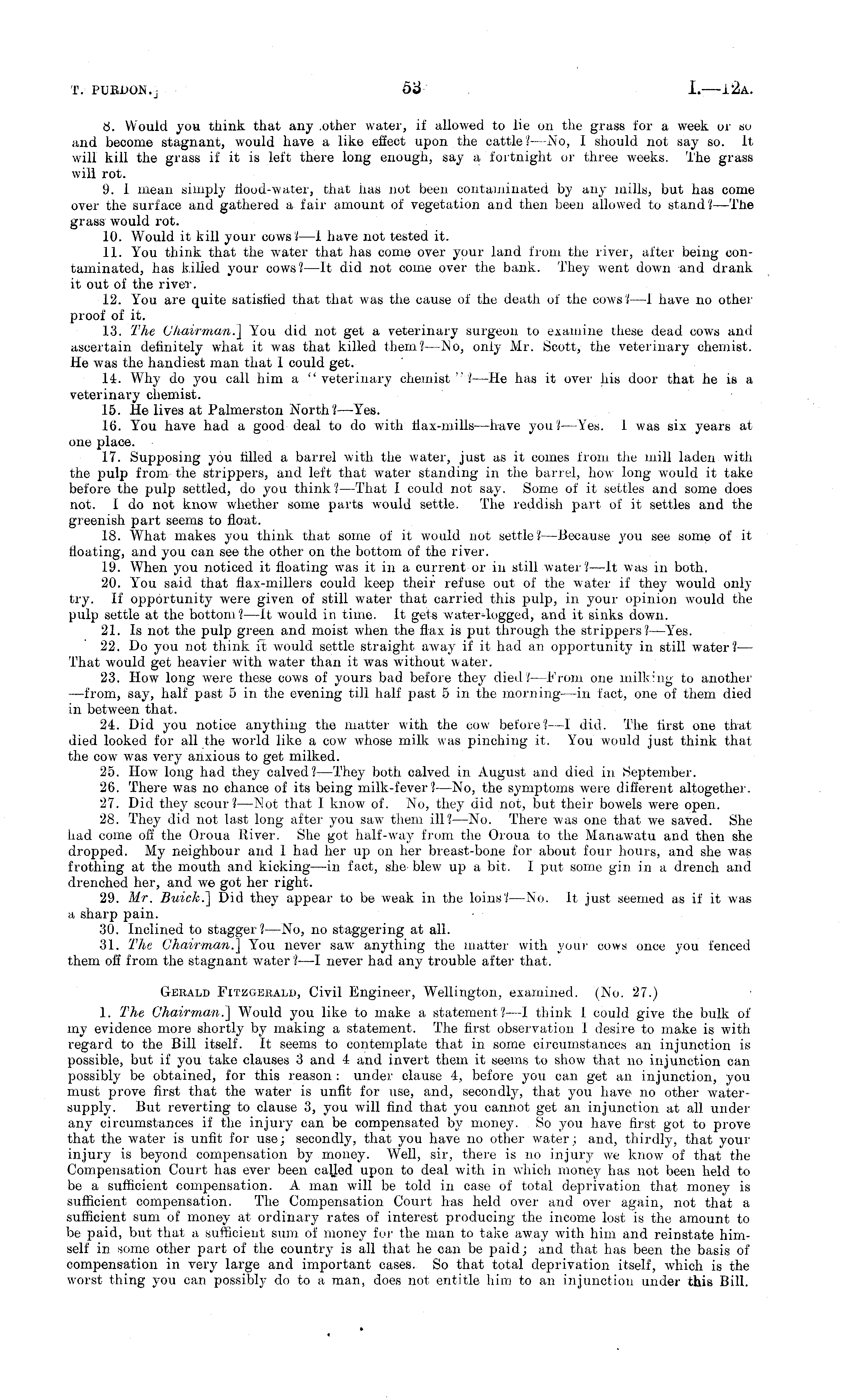 8. Would you think that any .other water, if allowed to lie on the grass for a week or so and become stagnant, would have a like effect upon the cattle? —No, I should not say so. It will kill the grass if it is left there long enough, say a fortnight or three weeks. The grass will rot. 9. I mean simply fiood-waler, that has not been contaminated by any mills, but has come over the surface and gathered a fair amount of vegetation and then been allowed to stand? —The grass would rot. 10. Would it kill your cows? —1 have not tested it. 11. You think that the water that has come over your land from the river, after being contaminated, has killed your cows? —It did not come over the bank. They went down and drank it out of the river. 12. You are quite satisfied that that was the cause of the death of the cows? —1 have no other proof of it. 13. The Chairman.] You did not get a veterinary surgeon to examine these dead cows and ascertain definitely what it was that killed them? —Mo, only Mr. Scott, the veterinary chemist. He was the handiest man that I could get. 14. Why do you call him a "veterinary chemist"?—He has it over his door that he is a veterinary chemist. 15. He lives at Palmerston North? —Yes. 16. You have had a good deal to do with fiax-mills —have you? —Yes. 1 was six years at one place. 17. Supposing you filled a barrel with the water, just as it comes from the mill laden with the pulp from the strippers, and left that water standing in the barrel, how long would it take before the pulp settled, do you think ? —That I could not say. Some of it settles and some does not. Ido not know whether some parts would settle. The reddish part of it settles and the greenish part seems to float. 18. What makes you think that some of it would not settle? —Because you see some of it floating, and you can see the other on the bottom of the river. 19. When you noticed it floating was it in a current or in still water? —It was in both. 20. You said that flax-millers could keep their refuse out of the water if they would onlytry. If opportunity were given of still water that carried this pulp, in your opinion would the pulp settle at the bottom?—lt would in time. It gets water-logged, and it sinks down. 21. Is not the pulp green and moist when the flax is put through the strippers? —Yes. 22. Do you not think it would settle straight away if it had an opportunity in still water? — That would get heavier with water than it was without water. 23. How long were these cows of yours bad before they died? —From one milking to another —from, say, half past 5 in the evening till half past 5 in the morning—in fact, one of them died in between that. 24. Did you notice anything the matter with the cow before? —I did. The first one that died looked for all the world like a cow whose milk was pinching it. You would just think that the cow was very anxious to get milked. 25. How long had they calved? —They both calved in August and died in. September. 26. There was no chance of its being milk-fever? —No, the symptoms were different altogether. 27. Did they/ scour? —Mot that I know of. No, they did not, but their bowels were open. 28. They did not last long after you saw them ill?— No. There was one that we saved. She had come off the Oroua River. She got half-way from the Oroua to the Manawatu and then she dropped. My neighbour and 1 had her up on her breast-bone for about four hours, and she was frothing at the mouth and kicking—in fact, she blew up a bit. I put some gin in a drench and drenched her, and we got her right. 29. Mr. Buick.] Did they appear to be weak in the loins?— No. It just seemed as if it was a sharp pain. 30. Inclined to stagger? —No, no staggering at all. 31. The Chairman.] You never saw r anything the matter with your cows once you fenced them off from the stagnant water ?—I never had any trouble after that. Gerald Fitzgerald, Civil Engineer, Wellington, examined. (No. 27.) 1. The Chairman.] Would you like to make a statement? —I think I could give the bulk of my evidence more shortly by making a statement. The first observation I desire to make is with regard to the Bill itself. It seems to contemplate that in some circumstances an injunction is possible, but if you take clauses 3 and 4 and invert them it seems to show that no injunction can possibly be obtained, for this reason : under clause 4, before you can get an injunction, you must prove first that the water is unfit for use, and, secondly, that you have no other watersupply. But reverting to clause 3, you will find that you cannot get an injunction at all under any circumstances if the injury- can be compensated by- money. So you have first got to prove that the water is unfit for use; secondly, that you have no other w r ater; and, thirdly, that your injury is beyond compensation by money. Well, sir, there is no injury we know of that the Compensation Court has ever been called upon to deal with in which money has not been held to be a sufficient compensation. A man will be told in case of total deprivation that money is sufficient compensation. The Compensation Court has held over and over again, not that a sufficient sum of money at ordinary rates of interest producing the income lost is the amount to be paid, but that a sufficient sum of money for the man to take away with him and reinstate himself in some other part of the country is all that he can be paid; and that has been the basis of compensation in very large and important cases. So that total deprivation itself, which is the worst thing you can possibly do to a man, does not entitle him to an injunction under this Bill.