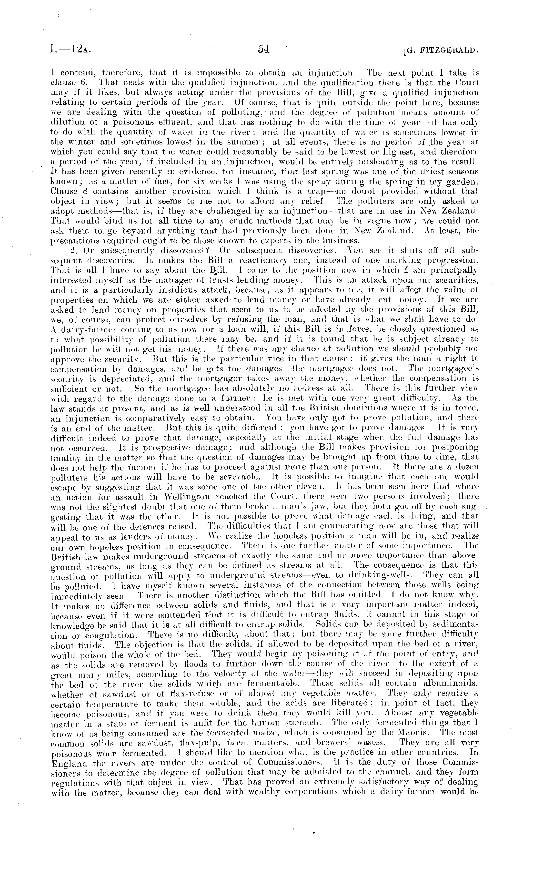 I contend, therefore, that it is impossible to obtain an injunction. The next point J take is clause 6. That deals with the qualified injunction, and the qualification there is that the Court may if it likes, but always acting under the provisions of the Bill, give a qualified injunction relating to certain periods of the year. Of course, that is quite outside the point here, because we are dealing with the question of polluting,- and the degree of pollution means amount of dilution of a poisonous efliuent, and tiiat lias nothing to do with the time of year —it has only to do with the quantity of water in the river; and the quantity of water is sometimes lowest in the winter and sometimes lowest in the summer; at all events, there is no period of the year at which you could say that the water could reasonably be said to be lowest or highest, and therefore a period of the year, if included in an injunction, would be entirely misleading as to the result. It lias been given recently in evidence, for instance, that last spring was one of the driest seasons known; as a matter of fact, for sis weeks I was using the spray during the spring in my garden. Clause 8 contains another provision which 1 think is a trap —no doubt provided without that object in view; but it seems to me not to afford any relief. The polluters are only asked to adopt methods— that is, if the)' are challenged by an injunction—that are in use in New Zealand. That would bind us for all time to any crude methods that may be in vogue now ; we could not ask them to go beyond anything that had previously been done in .New Zealand. At least, the precautions required ought to be those known to experts in the business. 2. Or subsequently discovered? —Or subsequent discoveries. Ton see it shuts off all subsequent discoveries. It makes the Bill a reactionary one, instead of one marking progression. That is all 1 have to say about the Bill. I. conn , to the position now in which lam principally interested myself as the manager of trusts lending money. This is an attack upon our securities, and it is a particularly insidious attack, because, as it appears to me, it will affegt the value of properties on which we are either asked to lend money or have already lent money. If we are asked to lend money on properties that seem to us to be affected by the provisions of this Bill. we, of course, can protect ourselves by refusing the loan, ami that is what we shall have to do. A dairy-farmer coming to us now for a loan will, if this Bill is in force, lie closely questioned as to what possibility of pollution there may be, and if it is found that lie is subject already to pollution lie will not get his money. If there was any chance of pollution we should probably not approve the security. But this is the particular vice in that clause :it gives the man a right to compensation by damages, and he gets the damages —the mortgagee does not. The mortgagees security is depreciated, and the mortgagor takes away the money, whether the compensation is sufficient or not. So the mortgagee has absolutely no redress at all. There is this further view with regard to the damage done to a farmer :he is met with one very great difficulty. As the law stands at present, and as is well understood in all the British dominions where it is in force, an injunction is comparatively easy to obtain. You have only got to prove pollution, and there is an end of the matter. But this is quite different : you have got to prove damages. It is very difficult indeed to prove that damage, especially at the initial stage when the full damage has not occurred. It is prospective damage; and although the Bill makes provision for postponing finality in the matter so that the question of damages may be brought up from time to time, thai does not help the farmer if lie lias to proceed against more than one person. Ef there are a dozen polluters his actions will have to be severable. It is possible to imagine that each one would escape by suggesting that ii was some one of the oilier eleven. It has been seen here that where an action for assault in Wellington readied the Court, there were two persons involved; there was not the slightest doubt that one of them broke a man's jaw, but they both got off by each suggesting that it was the other. It is not possible to prove what damage eacli is doing, ami that will be one of the defences raised. The difficulties that lam enumerating now are those that will appeal to us as lenders of money. We realize the hopeless position a man will be in, and realize our own hopeless position in consequence. There is one further matter of some importance, 'the British law makes underground streams of exactly the same and no more importance than aboveground streams, as long as they can be defined as streams at all. The consequence is that this question of pollution will applj to underground streams —even to drinking-wells. They can all be polluted. I have myself known several instances of the connection between those wells being immediately seen. There is another distinction which the Bill has omitted—l do not know why. It makes no difference between solids ami fluids, and that is a very important matter indeed, ■because even if it were contended that it is difficult to entrap Huids. it cannot in this stage of knowledge be said that it is at all difficult to entrap solids Solids can be deposited by sedimentation or coagulation. There is no difficulty about that; bin there may be some further difficulty about fluids. The objection is that the solids, if allowed to be deposited upon the bed of a river, would poison the whole of the bed. They would begin by poisoning it at the point of entry, ami as the solids are removed by floods to further down the course of the river—to the extent of a great many miles, according to the velocity of the water —they will succeed in depositing upon the bed of the river the solids which are fermentable. T