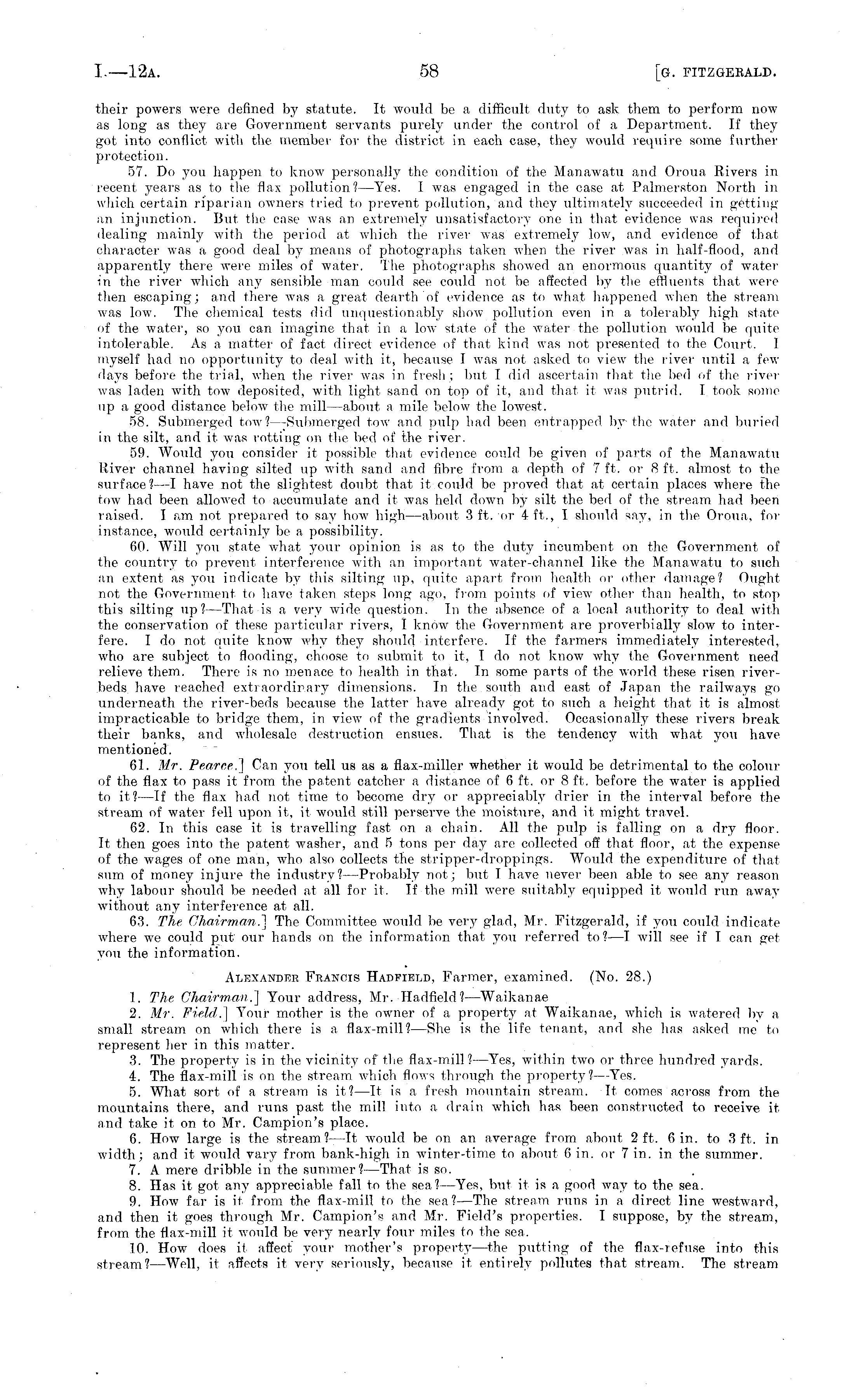 their powers were defined by statute. It would be a difficult duty to ask them to perform now as long as they are Government servants purely under the control of a Department. If they got into conflict with the member for the district in each case, they n-ould require some further protection. 57. Do you happen to know personally the condition of the Manawatu and Oroua, Rivers in recent years as to the flax pollution?— Yes. I was engaged in the case at Palmerston North in which certain riparian owners tried to prevent pollution, and they ultimately- succeeded in getting an injunction. But. the case was an extremely- unsatisfactory one in that evidence was required dealing mainly? with the period at which the river was extremely low, and evidence of that character was a good deal by means of photographs taken when the river was in half-flood, and apparently there were miles of water. The photographs showed an enormous quantity- of water in the river which any- sensible man could see could not be affected by- the effluents that were then escaping; and there was a great dearth of evidence as to what happened when the stream was low. The chemical tests did unquestionably show 7 pollution even in a tolerably high state of the water, so you can imagine that in a low state of the water the pollution would be quite intolerable. As a matter of fact direct evidence of that kind was not presented to the Court. 1 myself had no opportunity? to deal with it, because I was not asked to view the river until a few days before the trial, when the river was in fresh ; but I did ascertain that the bed of the river was laden with tow deposited, with light sand on top of it, and that it was putrid. I took some up a good distance below? the mill—about a mile below the lowest. 58. Submerged tow?— Submerged tow and pulp had been entrapped by the water and buried in the silt, and it was rotting on the bed of the river. 59. Would you consider it possible that evidence could be given of parts of the Manawatu River channel having silted up with sand and fibre from a depth of 7 ft. or 8 ft. almost to the surface? —I have not, the slightest doubt that it could be proved that at certain places where the tow had been allowed to accumulate and it was held down by silt the bed of the stream had been raised. lam not prepared to say how high—about 3 ft. or 4 ft., I should say, in the Oroua, for instance, would certainly be a possibility. 60. Will you state what your opinion is as to the duty? incumbent on the Government of the country? to prevent interference with an important water-channel like the Manawatu to such an extent as y?ou indicate by? this silting up, quite apart from health or other damage? Ought not the Government to have taken steps long ago, from points of view other than health, to stop this silting up?— That is a, very? wide question. In the absence of a local authority? to deal with the conservation of these particular rivers, I know the Government are proverbially? slow to interfere. I do not quite know why they? should interfere. If the farmers immediately interested, who are subject to flooding, choose to submit to it, I do not know why the Government need relieve them. There is no menace to health in that. In some parts of the world these risen riverbeds have reached extraordinary dimensions. In the south and east of Japan the railways go underneath the river-beds because the latter have already got, to such a height that it is almost impracticable to bridge them, in view of the gradients involved. Occasionally? these rivers break their banks, and wholesale destruction ensues. That is the tendency with what y?ou have mentioned. 61. Mr. Pearce.] Can you tell us as a flax-miller whether it would be detrimental to the colour of the flax to pass it from the patent catcher a distance of 6 ft. or 8 ft. before the water is applied to it?—Tf the flax had not time to become dry or appreciably? drier in the interval before the stream of water fell upon it, it would still perserve the moisture, and it might travel. 62. In this case it is travelling fast on a chain. All the pulp is falling on a dry floor. It then goes into the patent washer, and 5 tons per day are collected off that floor, at the expense of the wages of one man, who also collects the stripper-droppings. Would the expenditure of that sum of money injure the industry??— Probably not; but I have never been able to see any reason why labour should be needed at all for it. If the mill were suitably? equipped it would run away without any interference at all. 63. The Chairman,] The Committee would be very? glad, Mr. Fitzgerald, if y?ou could indicate w?here we could put our hands on the information that you referred to?—I will see if I can get you the information. Alexander Francis Hadpield, Farmer, examined. (No. 28.) 1. The Chairman.] Your address, Mr. Hadfield?—Waikanae 2. Mr. Field,] Your mother is the owner of a, property at Waikanae, which is watered by a small stream on which there is a flax-mill? —She is the life tenant, and she has asked me to represent her in this matter. 3. The property is in the vicinity- of the flax-mill? —Yes, within two or three hundred yards. 4. The flax-mill is on the stream which flows through the property?— Yes. 5. What sort of a stream is it?—Tt is a fresh mountain stream. Tt comes across from the mountains there, and runs past the mill into a drain which has been constructed to receive it and take it, on to Mr. Campion's place. 6. How large is the stream?—lt would be on an average from about 2 ft. 6 in. to 3 ft. in width; and it would vary from bank-high in winter-time to about 6 in. or 7 in. in the summer. 7. A mere dribble in the summer? —That is so. 8. Has it got any? appreciable fall to the sea? —Yes, but it is a good way? to the sea. 9. How far is it from the flax-mill to the sea?— The stream runs in a direct line westward, and then it goes through Mr. Campion's and Mr. Field
