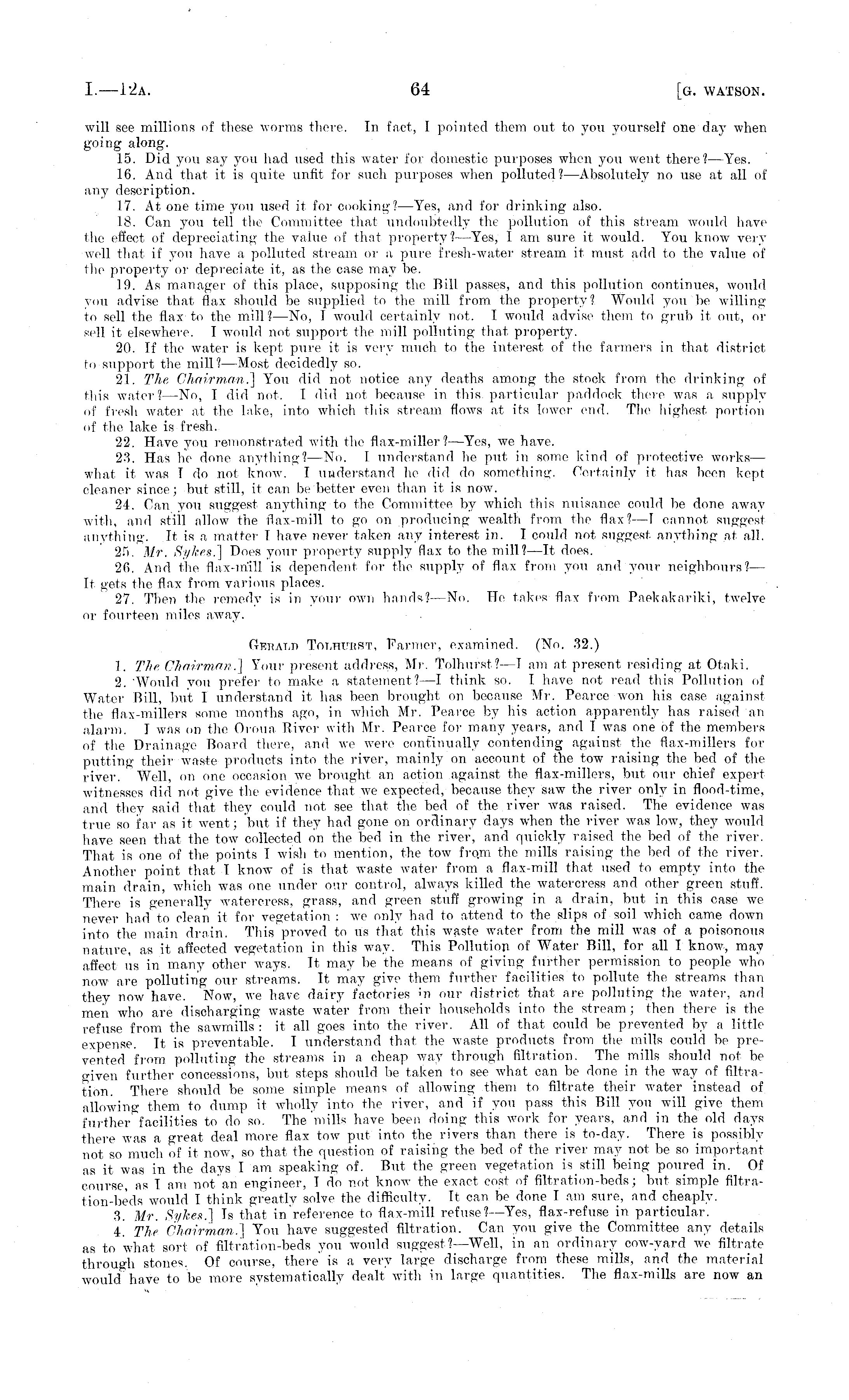 will see millions of these worms there. In fact, I pointed them out to you yourself one day when going along. 15. Did you say you had used this water for domestic purposes when you went there? —Yes. 16. And that it, is quite unfit for such purposes when polluted?— Absolutely no use at all of any- description. 17. At one time you used it for cooking/—Yes, and for drinking also. 18. Can you tell the Committee that undoubtedly the pollution of this stream would have the effect of depreciating the value of that property? —Yes, J am sure it would. You know very well that if you have a polluted stream or a, pure fresh-water stream it must add to the value of the property or depreciate it, as the case may be. 19. As manager of this place, supposing the Bill passes, and this pollution continues, would you advise that, flax should be supplied to the mill from the property? Would you be willing to sill the flax to the mill?—No, I would certainly not. I would advise them to grub it out, or sell it elsewhere. I would not support the mill polluting that, property. 20. If the water is kept pure it is very much to the interest of the farmers in that, district, to support the mill? —Most decidedly so. 21. The Chairman.] You did not notice any deaths among the stock from the drinking of this water? —No, I did not. I did not because in this particular paddock there was a supply <d' fresh water at the Like, into which this stream flows at its lower end. The highest portion of the lake is fresh. 22. Have you remonstrated with the flax-miller? —Yes, we have. 23. Has he done anything? —No. I understand he put in some kind of protective works— what it was I do not know. T understand he did do something. Certainly? it has been kept cleaner since; but still, it can lie better even than it is now. 24. Can you suggest anything to the Committee by which this nuisance could lie done away with, and still allow the flax-mil] to go on producing wealth from the flax?— l cannot suggest anything. It is a matter T have never taken any interest in. I could not suggest anything at all. 25. Mr. Sykes.] Does your property supply flax to the mill? —It does. 26. And the flax-mill is dependent for the supply of flax from you and your neighbours?— It gets the flax from various places. 27. Then the remedy is in your own hands?— No. He takes flax from Paekakariki, twelve oi' fourteen miles away. Gerald Tolhurst, Farmer, examined. (No. 32.) 1. The Chairman.] Your present address, Mr. Tolhurst? —I am at present residing at Otaki. 2. Would you prefer to make a statement? —I think so. I have not read this Pollution of Witter Bill, but I understand it has been brought on because Mr. Pearce won his case against the flax-millers some months ago, in which Mr. Pearce by his action apparently? has raised an alarm. I was on the Oroua River with Mr. Pearce for many years, and I was one of the members of the Drainage- Hoard there, and we were continually contending against the flax-millers for putting their waste products into the river, mainly? on account of the tow raising the bed of the river. Well, on one occasion we brought an action against the flax-millers, but our chief expert witnesses did not give the evidence that we expected, because they saw the river only in flood-time, and they said that they could not see that the bed of the river was raised. The evidence was true so far as it went; but if they had gone on ordinary days when the river was low, they would have seen that the tow collected on the bed in the river, and quickly raised the bed of the river. That is one of the points I wish to mention, the tow from the mills raising the bed of the river. Another point that I know of is that waste water from a flax-mill that used to empty into the main drain, which was one under our control, always killed the watercress and other green stuff. There is generally watercress, grass, and green stuff growing in a drain, but in this case we never had to clean it for vegetation : we only had to attend to the slips of soil which came down into the main drain. This proved to us that this waste water from the mill was of a poisonous nature, as it affected vegetation in this way. This Pollution of Water Bill, for all I know, may affect us in many other ways. It may be the means of giving further permission to people who now are polluting our streams. Tt may give them further facilities to pollute the streams than they now have. Now, we have dairy factories in our district that are polluting the water, and men who are discharging waste water from their households into the stream; then there is the refuse from the sawmills: it all goes into the river. All of that could be prevented by a little expense. It is preventable. I understand that the waste products from the mills could be prevented from polluting the streams in a cheap way through filtration. The mills should not be given further concessions, but steps should be taken to see what can be done in the way of filtration. There should be some simple means of allowing them to filtrate their water instead of allowing them to dump it wholly into the river, and if you pass this Bill you will give them further facilities to do so. The mills have been doing this work for years, and in the old days there was a great deal more flax tow put into the rivers than there is to-day. There is possibly not so much of it now, so that the question of raising the bed of the river may not be so important as it was in the days I am speaking of. But the green vegetation is still being poured in. Of course, as I am not an engineer, T do not know the exact cost of filtration-beds; but simple filtra-tion-beds would I think greatly? solve the difficulty. Tt can be done lam sure, and cheaply. 3. Mr. Sykes.] Is that in reference to flax-mill refuse? —Yes, flax-refuse in particular. 4. The Chairman.] You have suggested filtration. Can you give the Committee any- details as to what sort of fi