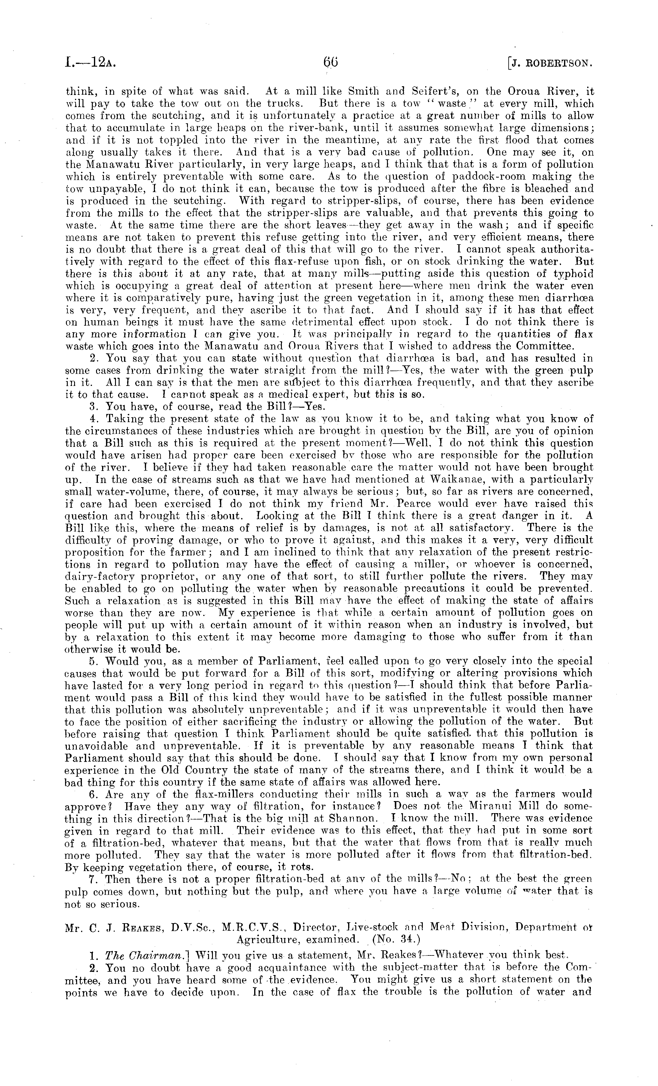 think, in spite of what was said. At a mill like Smith and Seifert's, on the Oroua River, it will pay to take the tow out on the trucks. But there is a tow? "waste" at every mill, which comes from the scutching, and it is unfortunately a practice at a great number of mills to allow that to accumulate in large heaps on the river-bank, until it assumes somewhat large dimensions; and if it is not toppled into the river in the meantime, at any rate the first flood that comes along usually takes it there. And that is a very bad cause of pollution. One may see it, on the Manawatu River particularly, in very large heaps, and I think that that is a form of pollution which is entirely? preventable with some care. As to the question of paddock-room making the low unpayable, I do not think it can, because the tow is produced after the fibre is bleached and is produced in the scutching. With regard to stripper-slips, of course, there has been evidence from the mills to the effect that the stripper-slips are valuable, and that prevents this going to waste. At the same time there are the short leaves—they get away in the wash; and if specific means are not taken to prevent this refuse getting into the river, and very efficient means, there is no doubt that there is a great deal of this that will go to the river. I cannot speak authoritatively with regard to the effect of this flax-refuse upon fish, or on stock drinking the water. But there is this about it at any rate, that at many mills—putting aside this question of typhoid which is occupying a great deal of attention at present here —where men drink the water even where it is comparatively pure, having just the green vegetation in it, among these men diarrhoea is very, very frequent, and they ascribe it to that fact. And I should say if it has that effect on human beings it must have the same detrimental effect upon stock. I do not think there is any more information I can give you. It was principally in regard to the quantities of flax waste which goes into the Manawatu and Oroua Rivers that I wished to address the Committee. 2. You say that you can state without question that diarrhoea is bad, and has resulted in some cases from drinking the water straight from the mill?— Yes, the water with the green pulp in it. All I can say is that the men are subject to this diarrhoea frequently?, and that they? ascribe it to that cause. I cannot speak as a medical expert, but this is so. 3. You have, of course, read the Bill?— Yes. 4. Taking the present state of the law as y?ou know? it to be, and taking what you know of the circumstances of these industries which are brought in question by the Bill, are you of opinion that a Bill such as this is required at the present moment?— Well, I do not think this question would have arisen had proper care been exercised by those who are responsible for the pollution of the river. I believe if they had taken reasonable care the matter would not have been brought up. In the case of streams such as that we have had mentioned at Waikanae, with a particularly small water-volume, there, of course, it may always be serious; but, so far as rivers are concerned, if care had been exercised I do not think my? friend Mr. Pearce would ever have raised this question and brought this about. Looking at the Bill I think there is a great danger in it. A Bill like this, where the means of relief is by damages, is not at all satisfactory. There is the difficulty of proving damage, or who to prove it against, and this makes it a very, very difficult proposition for the farmer; and I am inclined to think that any relaxation of the present restrictions in regard to pollution may have the effect of causing a miller, or whoever is concerned, dairy-factory proprietor, or any one of that sort, to still further pollute the rivers. They may? be enabled to go on polluting the water when by reasonable precautions it could be prevented. Such a relaxation as is suggested in this Bill may have the effect of making the state of affairs worse than they are now. My experience is that while a certain amount of pollution goes on people will put up with a certain amount of it within reason when an industry is involved, but by a relaxation to this extent it may become more damaging to those who suffer from it than otherwise it would be. 5. Would you, as a member of Parliament, feel called upon to go very closely into the special causes that would be put forward for a Bill of this sort, modify?ing or altering provisions which have lasted for a very long period in regard to this question?—l should think that before Parliament w?ould pass a Bill of this kind they would have to be satisfied in the fullest possible manner that this pollution was absolutely unpreventable; and if it was uupreventable it would then have to face the position of either sacrificing the industry or allowing the pollution of the water. But before raising that question I think. Parliament should be quite satisfied, that this pollution is unavoidable and unpreventable. If it is preventable by? any reasonable means I think that Parliament should say that this should be done. I should say that I know from my own personal experience in the Old Country the state of many? of the streams there, and I think it would be a bad thing for this country if the same state of affairs was allowed here. 6. Are any of the flax-millers conducting their mills in such a way? as the farmers w?ould approve? Have they any w?ay of filtration, for instance? Does not the Miranui Mill do something in this direction? —That is the big mill at Shannon. I know the mill. There was evidence given in regard to that mill. Their evidence was to this effect, that they had put in some sort of a filtration-bed, whatever that means, but that the water that flows from that is really much more polluted. They say that the w?ater is more polluted after it flow?s from that filtration-bed. By keeping vegetation there, 