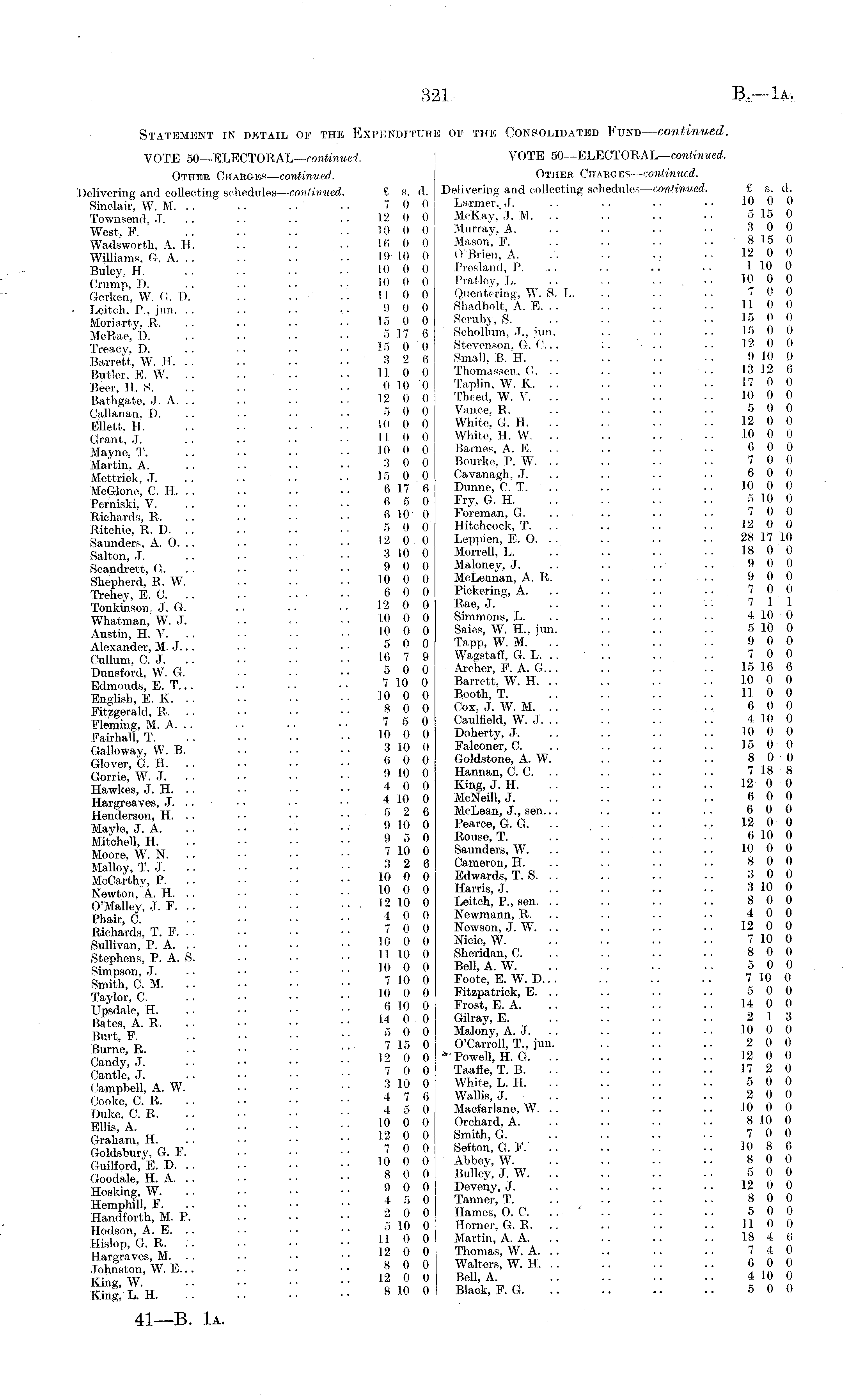 Statement in detail of the Expenditure of the Consolidated Fund — continued. VOTE 50—ELECTOR &L—continued. VOTE 50—ELECTORAL— continued. Other Charges— continued. Other Charges— continued. Delivering and collecting schedules— continued. i s. d. \ Delivering and collecting schedules— continued. £ s. d. Sinclair, W. M. .. .. ..' ■• 70 0 Larmer,.J. .. .. .. ■■ .10 0 0 Townsend, .1 12 0 0 McKay, J. M £*« 2 West, F. .. 10 0 0 Murray. A 3 0 0 Wadsworth, A. H. .. .. .. Hi 0 0 Mason, F. .. .. .. .. >« J Williams, (J. A 1910 0 O'Brien, A. .. .. ... .. 12 0 Bulev H .. 10 0 0 Presland, P. .. .. .. •■ I 10 0 (Wμ,,]) " " 10 0 0 Pratley, 1 10, 0 0 Gerken, W. G. D. 11 0 0 Quentering, W. S. 1 7 0 0 Leitoh, P., jun 9 0 0 Shadbolt, A. E » » Moriarty.R 15 0 0 Scruby, S. 5 0 0 Mcßae D ■• •■ Sl7 6 Scholium, J., urn. .. .. .. 15 0 0 Trcacv' I) ..15 0 0 Stevenson, G. C... .. .. .. 1? 0 0 Barrett, W. H. " '.'. ~ .. ' 3 2 6 Small, B. H 910 0 Butler'E W . •• .. 11 0 0 Thom.issen, G. .. .. .. ■.. 13 U o Beer H. S .. ■• •• 010 0 TapHn, W. K. .. .. .. •• 17 no Bathgate J. A. :. 12 0 0 Thc-ed, W. V 10 0 0 Callanan. D 5 0 0 Vance, R 6 0 0 BJlett h •■ Hi 0 0 1 White, G. H 12 0 0 Grant 3. " 110 ()! White, H. W 10 0 0 Vlavne T .. ..1000 Barnes, A. E. .. .. .. . . 600 Martin. A. '.'. 3 0 0 Bourke P W 7 0 0 Mettrick, J 15 0.0 Cavanagh, J > 0 0 McGlonc, C. H 617 6 Dunne, C. r ! 10 0 0 Pcrniski, V » 5 0 Fry, G. H. 510 0 Richards, R (i 10 0 Foreman, G 7 0 0 Ritchie, R. I) 50 0 Hitchcock, T 12 0 0 Saunders, A. 0 12 0 0 Leppien, E. O 28 1/ 10 Saltan, J 310 0 Morrell, L .. .. 18 0 0 Scandrett, G 9 0 0 Maloney, J 9 0 0 Shepherd, R. W. 10 0 0 McLennan, A. R. 9 0 0 Trehey, E. C. .. 6 0 0 Pickering, A .. 0 0 Tonkinson. J. G. 12 0 0 Rae, J. 7 1 1 Whatman, W.J. 10 0 0 Simmons, E. 410 0 Austin H V .. •• •■ 10 0 0 Sales, W. H., jun. .. .. .. 510 0 Alexander', m. J..': 3 0 0 Tapp W. M 9 0 0 Cullum, C. J 16 7 9 Wagstaff G L 70 0 Dnnrford, W. G. 5 0 0 Archer, FA G 15 16 6 Edmonds B. T 710 0 Barrett W. H 10 0 0 English E X ■ ■ ■ ■• 10 0 0 Booth, T. .. .. .. .. 11 0 0 ttraldK I: SOO Cox J. W.M 6 0 0 Fleming, M. A 7 5 0 Caulneld W. .7 4 10.0 Fairhall T 10 0 0 Dohorty, J 0 0 0 Galloway, W. B. 310 0 Falconer, C 15 0 0 Glover G H . • • • ■ ■ 6 0 0 Goldstone, A. W. 8 0 0 GomeWT '.'. . . 910 0 Hannan.CC 718 8 Hawkes J H " ' 4 0 0 King, J. H 12 0 0 Hargreaves, J 410 0 McNeill, J 6 0 0 Henderson, H 5 2 6 McLean J. sen ■Wavle T A • • ■ • • • 910 0 Pearce, G. G. .. ... .. .. 12 0 0 Shell H '.'. ..950 Rouse, T 610 0 Moore WN '.'. ■ ■ • • 710 0 Saunders W 10 0 0 Mallov T J ■ • • • • • 3 2 6 Cameron, H. .. . . .. .. 8 0 0 Shy! P. :: 10 0 0 Edwards! T. S 3 00 Newton,"A. H. . . 10 0 0 Hams, J. 310 0 O'Mallev, J. F 12 10 0 Leiteh, P., sen 8 0 0 Pbair.C. .. 4 ° ° S eWmam Vw 19 n n Richards, T. T. ' ° ° Newson, J. W 12 0 0 Sullivan P A •• .. 10 0 0 Nieio, W. .. .. ... •• 710 0 Stephens P. A. si '■ ■■ ■■ HW 0 Sheridan, C 800 Simwon I •■ 10 0 0 Bell, A. W 50 0 Smith CM " ' ■• ■• 10 0 Foote,E.W.D 710 0 C " .. 10 0 0 Fitzpatrick, E 50 0 upffie,H. :: :: .. :: «ie; l i ? \ Bates, A. R. •• U ° ° ?^ ay t in n n Rllrt t? ..500 Malony, A. J. . . .. .. -. 10 0 0 R " ■■ ■• 715 0 O'Carroll, T., jun 2 0 0 Sv j' " •■ 12 00 U Powell, H. G 12 0 0 OanSeJ '.'. ' ■■ 7° ° j Taaffe, T. B 17 2 0 Campbell' A W'' " •• ■• 310 0 White, L. H 5 0 0 vZ C R •• 47 6 J Wallis J 20 0 n , 7< d 4 5 0 Macfarlane, W. .. .. .. .. .10 0 0 U ke. 1,. K. .. • • • • • • l() 0 0 Orchard, A 810 0 Crahara H " "■ '■ ■■■ 12 0 0 Smith, G 70 0 GolSrv G P." •• ■• 70 0 Sefton, G. F. 10 8 6 cl ford ED ': .. ■• 10 0 0 Abbey, W 80 0 ISeI :: 80 0 Bulleyij.W 50 0 Hoskine W ■■ •• 9 0 0 Deveny, J. .. .. .. .. 12 0 0 HemS c " ■■ •■ 45 0 Tanner, T 80 0 SftiP.' 200 Hames,O.C. .. ' .. .. 50 0 HoHfwm A F •• ■• i> 10 0 Homer, G. R. .. .. .. .. 11 0 0 HklonG R •• 11 0 0 Martin, A. A 18 4 6 HareSves M '.'. " '■'■ ■■ 12 0 0 Thomas, W. A 74 0 Tohnston WE " " ■■ 8 0 0 Walters, W. H 6 0 0 KinVw 18 0 0 Bell, A 410 0 KngL'H :: :: .. ho o bhrg. .. .. .. 500