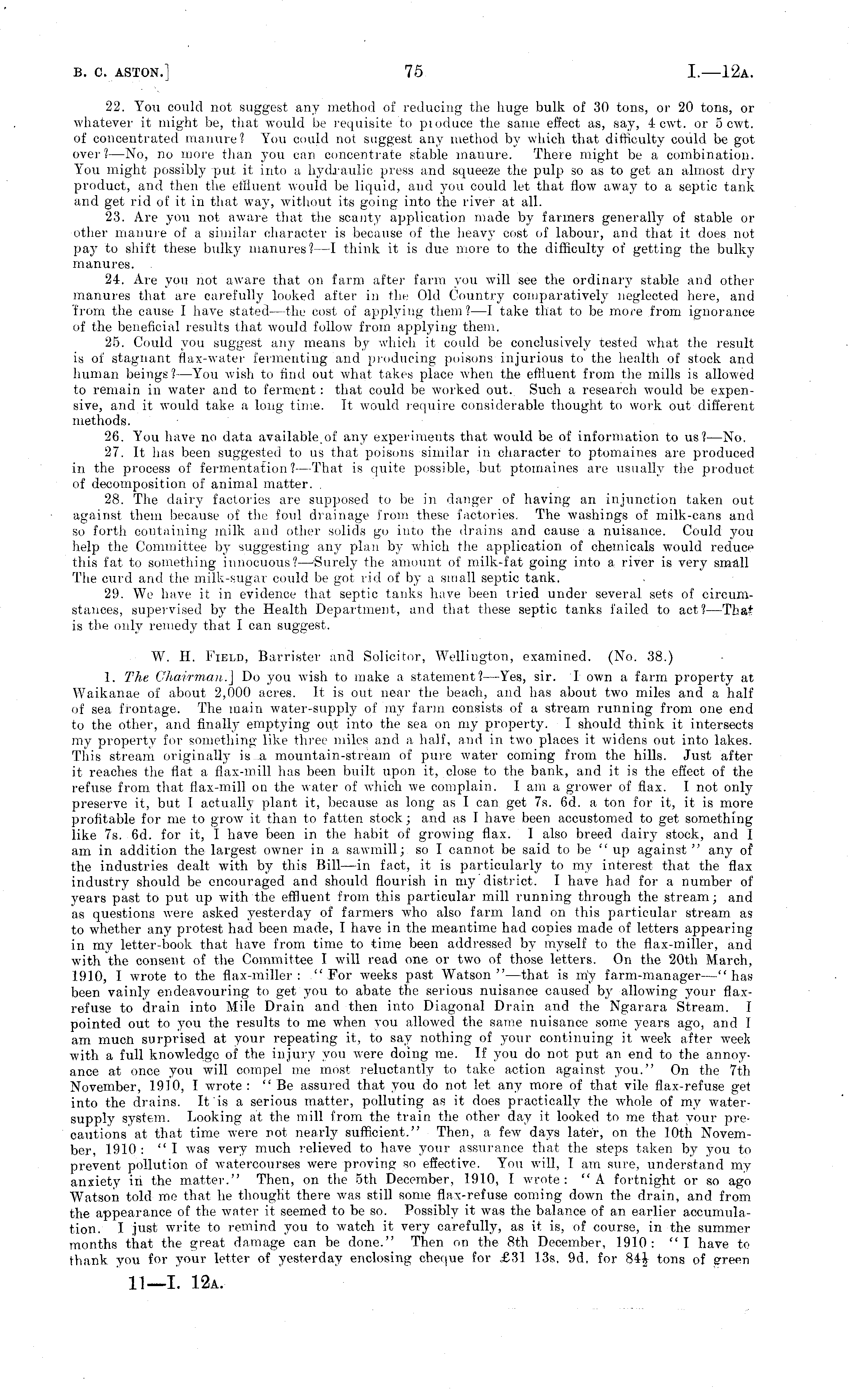 22. You could not suggest any method of reducing the huge bulk of 30 tons, or 20 tons, or whatever it might be, that would be requisite to pioduce the same effect as, say, 4 cwt. or 5 cwt. of concentrated manure? You could not suggest any method by which that difficulty could be got over? —No, no more than you can concentrate stable manure. There might be a combination. You might possibly- put it into a hydraulic press and squeeze the pulp so as to get an almost dryproduct, and then the effluent would be liquid, and you could let that flow away to a septic tank and get rid of it in that way, without its going into the river at all. 23. Are you not aware that the scanty- application made by? farmers generally of stable or other manure of a similar character is because of the heavy cost of labour, and that it does not pay to shift these bulky manures?—l think it is due more to the difficulty of getting the bulky manures. 24. Are you not aware that on farm after farm you will see the ordinary stable and other manures that are carefully- looked after in the Old Country comparatively neglected here, and 'from the cause I have stated —the cost of applying them? —I take that to be more from ignorance of the beneficial results that would follow from applying them. 25. Could you suggest any means by which it could be conclusively tested what the result is of stagnant flax-water fermenting and producing poisons injurious to the health of stock and human beings? —You wish to find out what takes place when the effluent from the mills is allowed to remain in water and to ferment : that could be worked out. Such a research would be expensive, and it would take a long time. It would require considerable thought to work out different methods. 26. You have no data available.of any experiments that would be of information to us? —No. 27. It has been suggested to us that poisons similar in character to ptomaines are produced in. the process of fermentation ? —That is quite possible, but ptomaines are usually the product of decomposition of animal matter. . 28. The dairy factories are supposed to be in clanger of having an injunction taken out against them because of the foul drainage from these factories. The washings of milk-cans and so forth containing milk and other solids go into the drains and cause a nuisance. Could y?ou help the Committee by suggesting tiny? plan by? which the application of chemicals would reduce this fat to something innocuous? —Surely the amount of milk-fat going into a river is very small The curd and the milk-sugar could be got rid of by a small septic tank. 29. We have it in evidence that septic tanks have been tried under several sets of circumstances, supervised by the Health Department, and that these septic tanks failed to act? —Tfaa* is the only remedy that I. can suggest. W. H. Field, Barrister and Solicitor, Wellington, examined. (No. 38.) 1. The Chairman.] Do y?ou wish to make a statement? —Yes, sir. I own a farm property at Waikanae of about 2,000 acres. It is out near the beach, and has about two miles and a half of sea frontage. The main water-supply of my farm consists of a stream running from one end to the other, and finally- empty?ing out into the sea on my property. I should think it intersects my property for something like three miles and a half, and in two places it widens out into lakes. This stream originally- is a mountain-stream of pure water coming from the hills. Just after it reaches the flat a flax-mill has been built upon it, close to the bank, and it, is the effect of the refuse from that flax-mill on the water of which we complain. lam a grower of flax. I not only? preserve it, but I actually plant it, because as long as I can get 7s. 6d. a ton for it, it is more profitable for me to grow it than to fatten stock; and as I have been accustomed to get something like 7s. 6d. for it, I have been in the habit of growing flax. I also breed dairy stock, and I am in addition the largest owner in a sawmill; so I cannot be said to be " up against " any of the industries dealt with by? this Bill—in fact, it is particularly to my? interest that the flax industry should be encouraged and should flourish in my distinct. I have had for a number of years past to put up with the effluent from this particular mill running through the stream; and as questions were asked yesterday of farmers who also farm land on this particular stream as to whether any protest had been made, I have in the meantime had copies made of letters appearing in my letter-book that have from time to time been addressed by myself to the flax-miller, and with the consent of the Committee I will read one or two of those letters. On the 20th March, 1910, I wrote to the flax-miller: "For w?eeks past Watson" —that is my farm-manager—"has been vainly endeavouring to get you to abate the serious nuisance caused by allowing your flaxrefuse to drain into Mile Drain and then into Diagonal Drain and the Ngarara Stream. I pointed out to you the results to me when you allowed the same nuisance some years ago, and I am mucti surprised at your repeating it, to say nothing of your continuing it week after week with a full knowledge of the injury you were doing me. If you do not put an end to the annoyance at once you will compel me most reluctantly to take action against you." On the 7th November, 1910, I w?rote : "Be assured that you do not let any more of that vile flax-refuse get into the drains. It is a serious matter, polluting as it does practically the whole of my watersupply system. Looking at the mill from the train the other day it looked to me that your precautions at that time were not, nearly sufficient." Then, a few days later, on the 10th November, 1910 : " I was very much relieved to have your assurance that the steps taken by you to prevent pollution of watercourses were proving so effective. You will, I am sure, understand my anxiety in the matter." Then, on the st