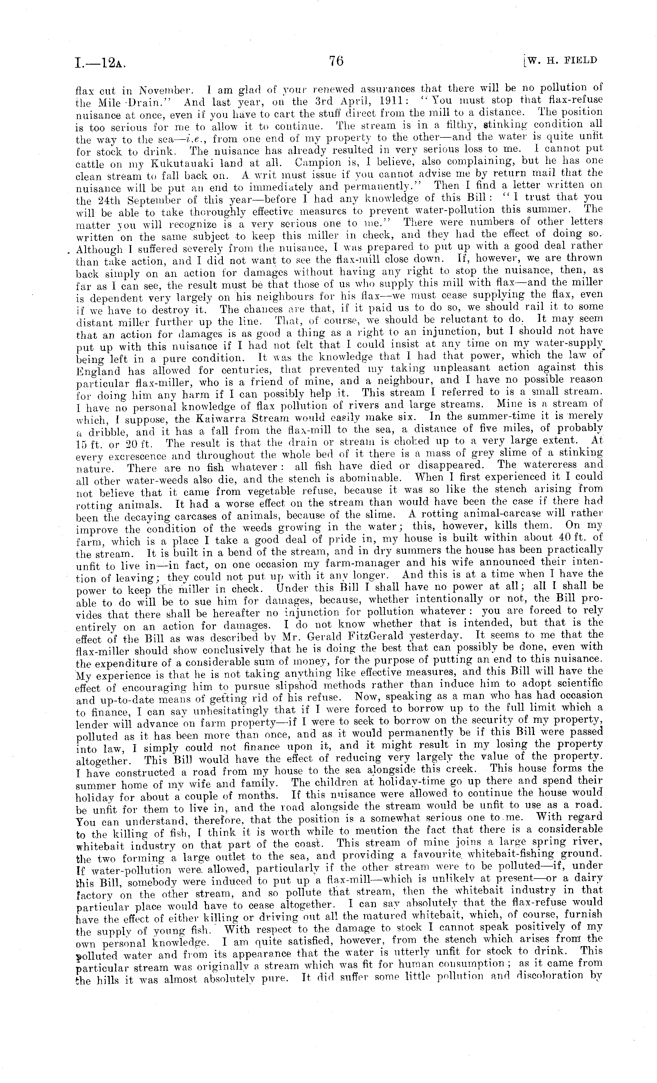 flax cut in November. 1 am glad of your renewed assurances that there will be no pollution of the Mile Drain." And last year, on the 3rd April, 1911: "You must stop that flax-refuse nuisance at once, even if you have to cart the stuff direct from the mill to a distance. The position is too serious for me to 'allow it to continue. The stream is in a filthy, stinking; condition all the way to the sea — i.e., from one end of my property to the other —and the water is quite unlit for stock to drink. The nuisance has already resulted in very .serious loss to me. 1 cannot put cattle on my Kukutauaki land at all. Campion is, 1 believe, also complaining, but he has one clean stream to fall back on. A writ must issue if you cannot advise me by return mail that the nuisance will be put an end to immediately and permanently." Then I find a letter written on the 24th September of this year —before I had any knowledge of this Bill: "I trust that you will be able to take thoroughly effective measures to prevent water-pollution this summer. The matter you will recognize is a very serious one to me." There were numbers of other letters written on the same subject to keep this miller in check, and they had the effect of doing so. Although I suffered severely from the nuisance, 1 was prepared to put up with a good deal rather than take action, and I did not want to see the flax-mill close down. If, however,_ we are thrown back simply on an action for damages without having any right to stop the nuisance, then, as far as I can see, the result must be that those of us who supply this mill with flax—and the miller is dependent very largely on his neighbours for his (lax—we must cease supplying the flax, even if we have to destroy "it.* The chances sue that, if it paid us to do so, we should rail it to some distant miller further up the line. That, of course, we should be reluctant to do. It may seem that an action for damages is as good a thing as a right to an injunction, but 1 should not have put up with this nuisance if I had not felt that I could insist at any time on my water-supply_ being left in a pure condition. It was the knowledge that I had that power, which the law of England lias allowed for centuries, that prevented my taking unpleasant action against this particular flax-miller, who is a friend of mine, and a neighbour, and I have no possible reason for doing him any harm if I can possibly help it. This stream I referred to is a small stream. I have no personal knowledge of flax pollution of rivers and large streams. Mine is a stream of which, I suppose, the Kaiwarra Stream would easily make six. In the summer-time it is merely a dribble, and it has a fall from the flax-mill to the sea, a distance of five miles, of probably 15 ft. or 20 ft. The result is that the drain or stream is choired up to a very large extent. At every excrescence and throughout the whole bed of it there is a mass of grey slime of a stinking nature. There are no fish whatever : all fish have died or disappeared. The watercress and all other water-weeds also die, and the stench is abominable. When I first experienced it I could not believe that it came from vegetable refuse, because it was so like the stench arising from rotting animals. It had a worse effect on the stream than would have been the case if there had been the decaying carcases of animals, because of the slime. A rotting animal-carcase will rather improve the condition of the weeds growing in the water; this, however, kills them. On my farm, which is a place I take a good deal of pride in, my house is built within about 40 ft. of the stream. It is built in a bend of the stream, and in dry summers the house has been practically unfit to live in—-in fact, on one occasion my farm-manager and his wife announced their intention of leaving; they could not put up with it any longer. And this is at a time when I have the power to keep the miller in check. Under this Bill I shall have no power at all; all I shall be able to do will be to sue him for damages, because, whether intentionally or not, the Bill provides that there shall be hereafter no injunction for pollution whatever : you are forced to rely entirely on an action for damages. I do not know whether that is intended, but that is the effect of the Bill as was described by Mr. Gerald FitzGerald yesterday. It seems to me that the flax-miller should show conclusively that he is doing the best that can possibly be done, even with the expenditure of a considerable sum of money, for the purpose of putting an end to this nuisance. My experience is that he is not taking anything like effective measures, and this Bill will have the effect of encouraging him to pursue slipshod methods rather than induce him to adopt scientific and up-to-date means of getting rid of his refuse. Now, speaking as a man who has had occasion to finance I can say unhesitatingly that if I were forced to borrow up to the full limit which a lender will advance 'on farm property—if I were to seek to borrow on the security of my property, polluted as it has been more than once, and as it would permanently be if this Bill were passed into law, I simply could not finance upon it, and it might result in my losing the property altogether This Bill would have the effect of reducing very largely the value of the property. I have constructed a road from my house to the sea alongside this creek. This house forms the summer home of my wife and family. The children at holiday-time go up there and spend their holiday for about a couple of month's. If this nuisance were allowed to continue the house would be unfit for them to live in, and the road alongside the stream would be unfit to use as a road. You can understand, therefore, that the position is a somewhat serious one to me. With regard to the killing of fish, I think it is worth while to mention the fact that there is a considerable whitebait industry on that part of the coast. This st