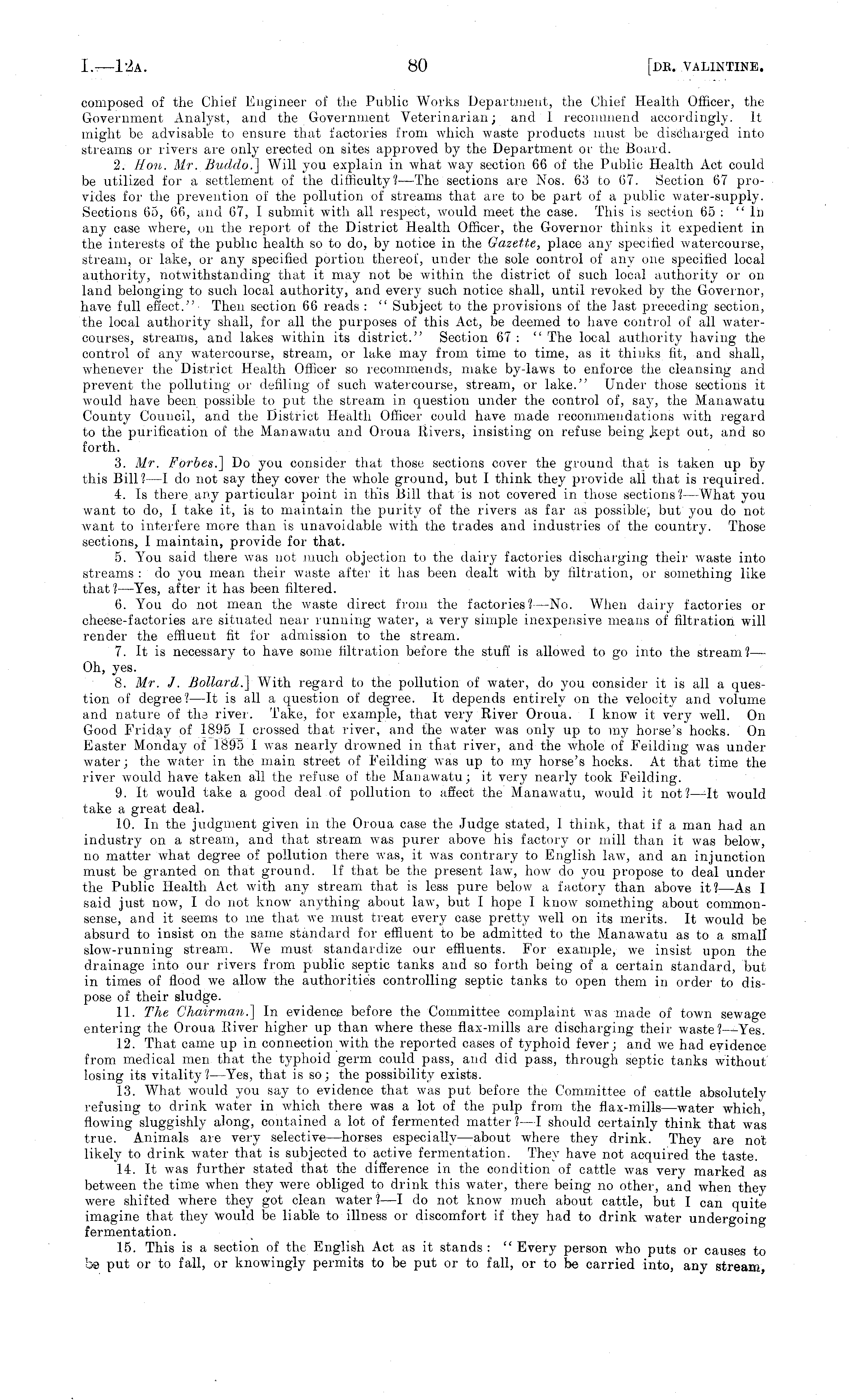composed of the Chief Engineer of the Public Works Department, the Chief Health Officer, the Government Analyst, and the Government Veterinarian; and 1 recommend accordingly. It might be advisable to ensure that factories from which waste products must be discharged into streams or rivers are only erected on sites approved by the Department or the Board. 2. Hon. Mr. Buddo.] Will you explain in what way section 66 of the Public Health Act could be utilized for a settlement of the difficulty?— The sections are Nos. 63 to 67. Section 67 provides for the prevention of the pollution of streams that are to be part of a public water-supply. Sections 65, 66, and 67, 1 submit with all respect, would meet the case. This is section 65 :" In any case where, on the report of the District Health Officer, the Governor thinks it expedient in the interests of the public health so to do, by notice in the Gazette, place any specified watercourse, stream, or lake, or any specified portion thereof, under the sole control of any one specified local authority, notwithstanding that it may not be within the district of such local authority or on land belonging to such local authority, and every such notice shall, until revoked by? the Governor, have full effect." Then section 66 reads : " Subject to the provisions of the last preceding section, the local authority shall, for all the purposes of this Act, be deemed to have control of all watercourses, streams, and lakes within its district." Section 67 : " The local authority having the control of any watercourse, stream, or lake may from time to time, as it thinks fit, and shall, whenever the District Health Officer so recommends, make by-laws to enforce the cleansing and prevent the polluting or defiling of such watercourse, stream, or lake." Under those sections it would have been possible to put the stream in question under the control of, say, the Manawatu County Council, and the District Health Officer could have made recommendations with regard to the purification of the Manawatu and Oroua Rivers, insisting on refuse being kept out, and so forth. 3. Mr. Forbes.] Do you consider that those sections cover the ground that is taken up by this Bill? —I do not say they cover the whole ground, but I think they provide all that is required. 4. Is there any particular point in this Bill that is not covered in those sections? —What you want to do, I. take it, is to maintain the purity of the rivers as far as possible, but you do not want to interfere more than is unavoidable with the trades and industries of the country. Those sections, 1 maintain, provide for that. 5. You said there was not much objection to the dairy? factories discharging their waste into streams : do you mean their waste after it has been dealt with by filtration, or something like that ?—Yes, after it has been filtered. 6. You do not mean the waste direct from the factories? —No. When dairy factories or cheese-factories are situated near running water, a very simple inexpensive means of filtration will render the effluent fit for admission to the stream. 7. It is necessary to have some filtration before the stuff is allowed to go into the stream?— Oh, yes. 8. Mr. J. Bollard.] With regard to the pollution of water, do you consider it is all a question of degree? —It is all a question of degree. It depends entirely on the velocity and volume and nature of the river. Take, for example, that very River Oroua. I know it very well. On Good Friday of 1895 I crossed that river, and the water was only up to my horse's hocks. On Easter Monday of 1895 I was nearly drowned in that river, and the whole of Feilding was under water; the water in the main street of Feilding was up to my horse's hocks. At that time the river would have taken all the refuse of the Manawatu; it very nearly took Feilding. 9. It would take a good deal of pollution to affect the Manawatu, would it not? —It would take a great deal. 10. In the judgment given in the Oroua case the Judge stated, 1 think, that if a man had an industry on a stream, and that stream was purer above his factory? or mill than it was below, no matter what degree of pollution there was, it was contrary to English law, and an injunction must be granted on that ground. If that be the present law, how? do you propose to deal under the Public Health Act with any stream that is less pure below a factory than above it?—As I said just now, I do not know anything about law, but I hope I know something about commonsense, and it seems to me that we must treat every case pretty- well on its merits. It would be absurd to insist on the same standard for effluent to be admitted to the Manawatu as to a small" slow-running stream. We must standardize our effluents. For example, we insist upon the drainage into our rivers from public septic tanks and so forth being of a certain standard, but in times of flood we allow the authorities controlling septic tanks to open them in order to dispose of their sludge. 11. The Chairman.] In evidence before the Committee complaint was made of town sewage entering the Oroua River higher up than where these flax-mills are discharging their waste?— Yes. 12. That came up in connection with the reported cases of typhoid fever; and we had evidence from medical men that the typhoid germ could pass, and did pass, through septic tanks without losing its vitality?— Yes, that is so; the possibility? exists. 13. What would you say to evidence that was put before the Committee of cattle absolutely refusing to drink water in which there was a lot of the pulp from the flax-mills —water which, flowing sluggishly along, contained a lot of fermented matter? —I should certainly think that was true. Animals are very selective—horses especially—about where they drink. They are not likely to drink, water that is subjected to active fermentation. They have not acquired the taste. 14. It was further stated that the difference in the c