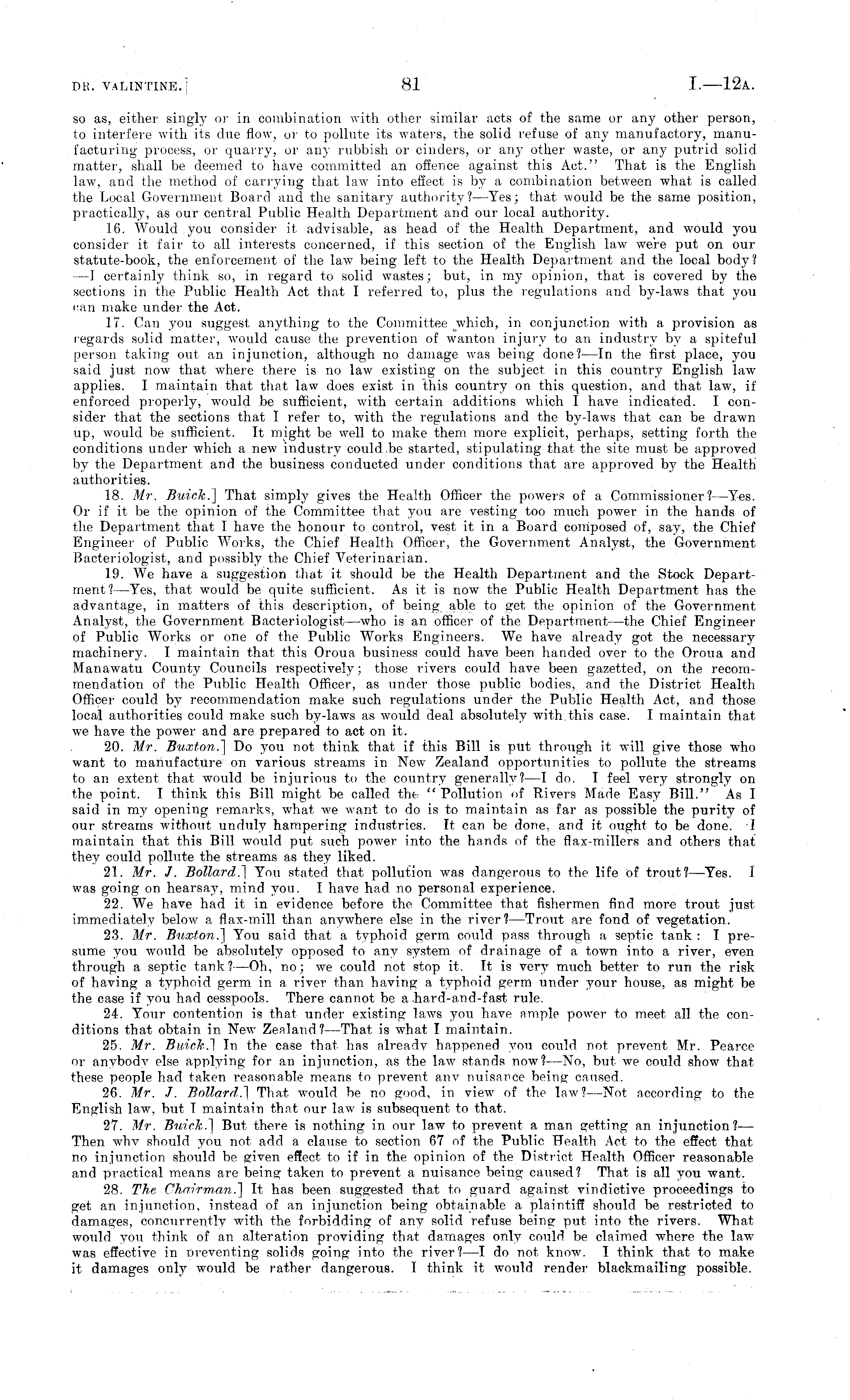 so as, either singly or in combination with other similar acts of the same or any? other person, to interfere with its due flow, or to pollute its waters, the solid refuse of any? manufactory, manufacturing process, or quarry, or any rubbish or cinders, or any other waste, or any putrid solid matter, shall be deemed to have committed an offence against this Act." That is the English law, and the method of carrying that law into effect is by a combination between what is called the Local Government Board and the sanitary authority?? —Yes; that would be the same position, practically, as our central Public Health Department and our local authority. 16. Would you consider it advisable, as head of the Health Department, and w?ould you consider it fair to all interests concerned, if this section of the English law were put on our statute-book, the enforcement of the law- being left to the Health Department and the local body ? —I certainly? think so, in regard to solid w-astes; but, in my? opinion, that is covered by the sections in the Public Health Act that I referred to, plus the regulations and by-law?s that you can make under the Act. 17. Can you suggest anything to the Committee w?hich, in conjunction with a provision as regards solid matter, would cause the prevention of wanton injury to an industry by a spiteful person taking out an injunction, although no damage was being done? —In the first place, you said just now that where there is no law existing on the subject in this country English law applies. I maintain that that law does exist in this country on this question, and that law?, if enforced properly, would be sufficient, with certain additions which I, have indicated. I consider that the sections that I refer to, with the regulations and the by-law?s that can be drawn up, would be sufficient. It might be well to make them more explicit, perhaps, setting forth the conditions under which a new industry could be started, stipulating that the site must be approved by the Department and the business conducted under conditions that are approved by? the Health authorities. 18. Mr. Buick.] That simply gives the Health Officer the powers of a Commissioner? —Yes. Or if it be the opinion of the Committee that you are vesting too much power in the hands of the Department that I have the honour to control, vest it in a Board composed of, say, the Chief Engineer of Public Works, the Chief Health Officer, the Government Analyst, the Government Bacteriologist, and possibly the Chief Veterinarian. 19. We have a suggestion that it should be the Health Department and the Stock Department?— Yes, that would be quite sufficient. As it is now the Public Health Department has the advantage, in matters of this description, of being able to get the opinion of the Government Analyst, the Government Bacteriologist—w?ho is an officer of the Department—the Chief Engineer of Public Works or one of the Public Works Engineers. We have already got the necessary machinery. I maintain that this Oroua business could have been handed over to the Oroua and Manawatu County? Councils respectively?; those rivers could have been gazetted, on the recommendation of the Public Health Officer, as under those public bodies, and the District Health Officer could by recommendation make such regulations under the Public Health Act, and those local authorities could make such by-laws as would deal absolutely with, this case. I maintain that we have the pow?er and are prepared to act on it. 20. Mr. Buxton,] Do you not think that if this Bill is put through it will give those who want to manufacture on various streams in New Zealand opportunities to pollute the streams to an extent that would be injurious to the country generally?—l do. I feel very strongly on the point. I think this Bill might be called the " Pollution of Rivers Made Easy Bill." As I said in my opening remarks, what w?e w?ant to do is to maintain as far as possible the purity of our streams w?ithout unduly? hampering industries. It can be done, and it ought to be done. I maintain that this Bill would put such power into the hands of the flax-millers and others that they could pollute the streams as they liked. 21. Mr. J. Bollard.] You stated that pollution was dangerous to the life of trout?— Yes. I was going on hearsay, mind you. I have had no personal experience. 22. We have had it in evidence before the Committee that fishermen find more trout just immediately below? a flax-mill than anywhere else in the river?— Trout are fond of vegetation. 23. Mr. Buxton.] You said that a typhoid germ could pass through a septic tank : I presume you would be absolutely opposed to any system of drainage of a town into a river, even through a septic tank?—Oh, no; we could not stop it. It is very much better to run the risk of having a typhoid germ in a river than having a typhoid germ under your house, as might be the case if y?ou had cesspools. There cannot be a hard-and-fast rule. 24. Your contention is that under existing law?s you have ample power to meet all the conditions that obtain in New Zealand? —That is what I maintain. 25. Mr. Buick,] In the case that has already happened you could not prevent Mr. Pearce or anybody else applying for an injunction, as the law stands now?—No, but we could show that these people had taken reasonable means to prevent any nuisance being caused. 26. Mr. J. Bollard.] That would be no good, in view of the law? —Not according to the English law?, but I maintain that our law is subsequent to that. 27. Mr. Buick.] But there is nothing in our law to prevent a man getting an injunction?— Then why should you not add a clause to section 67 of the Public Health Act to the effect that, no injunction should be given effect to if in the opinion of the District Health Officer reasonable and practical means are being taken to prevent a nuisance being caused? That is all you want. 28. The Chairman.] It has been suggested t