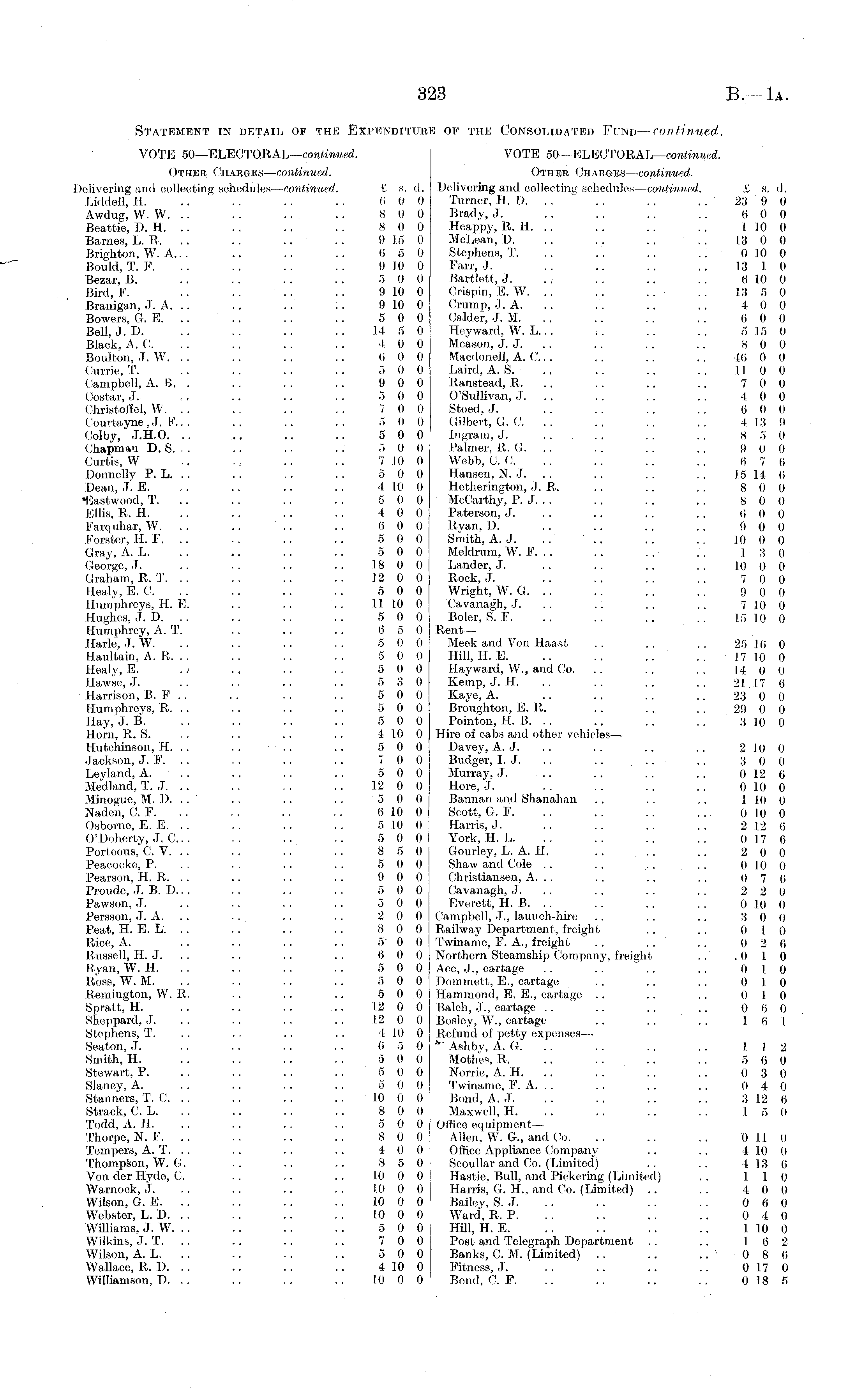 Statement in detail of the Expenditure of the Consolidated Fund — continued. VOTE 50—ELECTORAL— continued. VOTE 50—ELECTORAL— continued. Other Chaeobs — continued. Other Charges— continued. Delivering and collecting schedules— continued. t a. d. Delivering and collecting schedules— continued. X, s. d. Liddell, H. .. .. . . . . 6 0 0 Turner, H. D. .. .. .. .. 23 9 0 Awdug, W. W. .. .. ... .. 800 Brady, J. .. .. .. .. 600 Beattie, I). H. .. . . .. .. 8 0 0 Heappy, R. H. .. .. .. . . 1 10 0 Barnes, L. R. .. .. .. .. 915 0 McLean, D. .. .. .. .. 13 0 0 Brighton, W. A... .. .. .. (i r> 0 Stephens, T. .. .. .. . . 010 0 Hould, T. V. .. .. .. .. 9 10 0 Farr, J. .. .. .. .. 13 1 0 Bezar, B. .. .. .. .. r> 0 0 Bartlett, J. . . . . .. . . 610 0 Bird, F. .. .. .. .. 910 0 Crispin, E. W. .. .. .. .. 13 r> 0 Branigan, J. A. .. . . .. .. 910 0 Crump, J. A. .. .. .. 4 0 0 Bowers, G. 15. .. .. .. .. 5 0 0 Calder, J. M. .. .. .. .. 6 0 0 Bell, J. D. .. .. .. .. 14 r> 0 Heyward, W. L... .. .. .. 5 15 0 Black, A. C. .. .. .. .. 4 0 0 Meason, J. J. .. .. .. 8 0 (I Boulton, J. W. .. .. .. .. 6 0 0 MacdonelL A. C... .. .. .. 4(5 0 0 (iurrie, T. . . .. . . ... 500 Laird, A. S. .. .. .. . . 1100 Campbell, A. 13. . . . . . .. 0 0 0 Ranstead, R. . . .. .. .. 7 0 0 Costar, J. ~ .. .. .. •"> 0 0 O'Sullivan, J. .. .. .. .. 4 0 0 Christoffel, W. .. .. .. . . 7 0 0 Stood, J. .. . . . . .. 6 0 0 Courtayne.J. V.. . .. .. .. ."> 0 0 Gilbert, G. C. .. .. .. .. 413 9 Colby, J.H.O. .. .. .. .. 5 0 0 Ingram, J. .. .. .. .. 8 5 0 Chapman D. S. . .. .. .. 5 0 0 Palmer, R. G. .. .. .. .. 0 0 0 Curtis, W .. ~ .. .. 7 10 0 Webb, C. C. .. .. .. .. 6 7 6 Donnelly P. L. .. . . ~ .. 5 0 0 Hansen, N. J. .. .. .. . . 1.5 14 (i Dean, J. E. ~ .. .. .. 4 10 0 Hetherington, J. R. .. .. .. 8 0 0 T. .. .. . . .. 5 0 0 McCarthy, P. J. .. .. .. .. S 0 0 Ellis, R. H. . . . . .. .. 4 0 0 Paterson, J. .. .. .. .. 6 0 0 Farquhar, W. .. .. .. .. 6 0 0 Ryan, D. . . .. .. .. 9 0 0 Forster, H. F. .. .. .. .. 5 0 0 Smith, A. J. .. .. .. .. 10 0 0 Cray, A. L. .. .. .. .. 5 0 0 Meldrum, W. F. . . . . . . . . 13 0 George, J. .. .. .. .. 18 0 0 Lander, J. .. .. .. .. 10 0 0 Graham, R. T. .. .. .. .. 12 0 0 Rock, J. .. .. .. .. 7 0 0 llealy. E. ('. .. .. .. .. 5 0 0 Wright, W. G. .. .. .. .. 9 0 0 Humphreys, H. E. .. .. .. 11 10 0 Cavanagh, J. .. .. .. .. 710 0 Hughes, J. D. .. .. .. .. 50 0 Boler, S. F. .. .. .. .. 15 10 0 Humphrey, A. T. . . .. .. 6 5 0 Rent— Efarle, J. W. .. .. .. .. 5 0 0 Meek and Yon Haast .. .. .. 25 16 0 Haultain, A. R. .. .. .. .. 5 0 0 Hill, H. E. .. .. .. .. 17 10 0 Healy, E. .. . , .. .. 5 0 0 Hayward, W., and Co. .. .. .. H 0 0 Hawse, J. .. .. .. .. 5 .3 0 Kemp, J. H. .. .. .. .. 21 17 6 Harrison, B. F . . . . . . . . 5 0 0 Kaye, A. .. .. .. .. 23 0 0 I [umphreys, R. . . .. .. .. 5 0 0 Broughton, E. R. . . . . .. 29 0 0 Hay, J. B. .. .. .. .. 5 0 0 Pointon, H. B. .. .. .. .. 3 10 0 Horn, R. S. .. .. .. .. 4 10 0 Hire of cabs and other vehicles— Hutchinson, H. .. .. .. .. 5 0 0 Davey, A. J. .. .. .. .. 2 10 0 Jackson, J. F. .. .. .. .. 7 0 0 Budger, I. J. .. .. .. 3 0 0 Leyland, A. .. .. . . . . 5 0 0 Murray, J. .. .. .. .. 012 6 Medland, T. J. .. . . .. .. 12 0 0 Hore, J. .. . . .. .. 010 0 Minogue, M. 1). .. .. . . . . 5 0 0 Barman and Shanaharj .. .. .. 1 10 0 Naden, C. F. .. .. .. .. 6 1.0 0 Scott, G. F. .. .. .. .. 0 10 0 Osborne, E. E. .. .. .. .. 5 10 0 Harris, J. .. .. .. .. 2 12 6 O'Doherty, J. C... .. .. .. r> 0 0 York, H. L. .. .. .. .. 0 17 6 Porteous, C. V. . . . . . . . . 8 5 0 Gourley, L. A. H. . . .. .. 2 0 0 Peacooke, P. . . .. .. .. 5 0 0 Shaw and Cole .. .. .. .. 0 10 0 Pearson, H. R. . . .. . . . . 9 0 0 Christiansen, A. . . .. .. . . 0 7 6 Proude, J. B. D... . . . . . . 5 0 0 Cavanagh, J. .. .. .. 2 2 0 Pawson, J. .. .. . . . . 5 0 0 Everett, H. B. . . . . .. .. 0 10 0 Porsson, J. A. . . . . . . 2 0 0 Campbell, J., launch-hire .. .. .. 3 0 0 Peat, H. E. L. . . . . .. .. 8 0 0 Railway Department, freight . . .. 0 10 Rice, A. . . . . .. .. 5 0 0 Twiname, F. A., freight . . .. .. 0 2 6 Russell, H. J. .. .. .. .. 6 0 0 Northern Steamship Company, freight .. .0 10 Ryan, W. H. .. .. . . .. 5 0 0 Ace, J., cartage . . .. . . .. 0 10 Ross, W. M. . . . . . . .. 5 0 0 Dommett, E., cartage .. .. .. 0)0 Remington, W. R. . . . . . . 5 0 0 Hammond, E. E., cartage .. . . .. Oil) Spratt, H. .. .. .. .. 1.2 0 0 Balch, J., cartage . . .. .. .. 0 6 0 Sheppard, J. .. .. .. .. 12 0 0 Bosley, W., cartage .. .. .. 16 1 Stephens,! , . .. .. .. .. 4 10 0 Refund of petty expenses— Seaton, J. .. .. .. .. 6 5 o** Ashby, A. G. .. .. .. .. 112 Smith, H. .. .. .. .. 5 0 0 Mothes, R. .. .. .. . . 5 6 0 Stewart, P. . . . . . . ..500 Norrie, A. H. .. ~ 030 Slaney, A. .. .. .. .. 5 0 0 Twiname, F. A. .. . . . . . . 0 4 0 Stann'ers, T. (,'. .... . . .. 10 0 0 Bond, A. J. . . .. .. . . 312 6 Strack, C. L. .. .. . . .. 8 0 0 Maxwell, H. .. .. .. . . 15 0 Todd, A. H. . . . . .. .. 5 0 0 Office equipmentThorpe, N. F. .. .. .. .. 8 0 0 Allen, W. G., and Co. .. .. .. 011 0 Tempers, A. T. .. .. .. .. 4 0 0 Office Appliance Company .. .. 410 0 Thompson, W. (i. .. .. .. 8 5 0 Scoullar and Co. (Limited) .. .. 4 13 6 Yon der Hyde, C. .. .. .. 10 0 0 Hastie, Bull, and Pickering (Limited) . . 110 Warnook, ,t. .. .. .. .. 10 0 0 Harris, G. H.. and Co. (Limited) .. .. 40 0 Wilson, G. E. .. . . .. .. 10 0 0 | Bailey, S. J. .. .. .. . . 0 6 0 Webster, L. D. .. .. .. .. 10 0 0 I Ward, R. P. . . .. . . .. 0 4 0 Williams, J. W. .. .. . . . . 5 0 0 Hill, H. E. . . .. .. .. 1 10 0 Wilkins, J. T. .. .. .. .. 7 0 0 Post and Telegraph Department .. .. 16 2 Wilson, A. L. .. .. . . .. 5 0 0 Banks, C. M. (Limited) .. .. .. '' 0 8 6 Wallace, R. D. .. .. .. .. 410 0 Fitness, J. .. .. .. 017 0 Williamson, D. .. .. .. .. 10 0 0 Bond, C. F. .. .. .. ~ 0 18 5