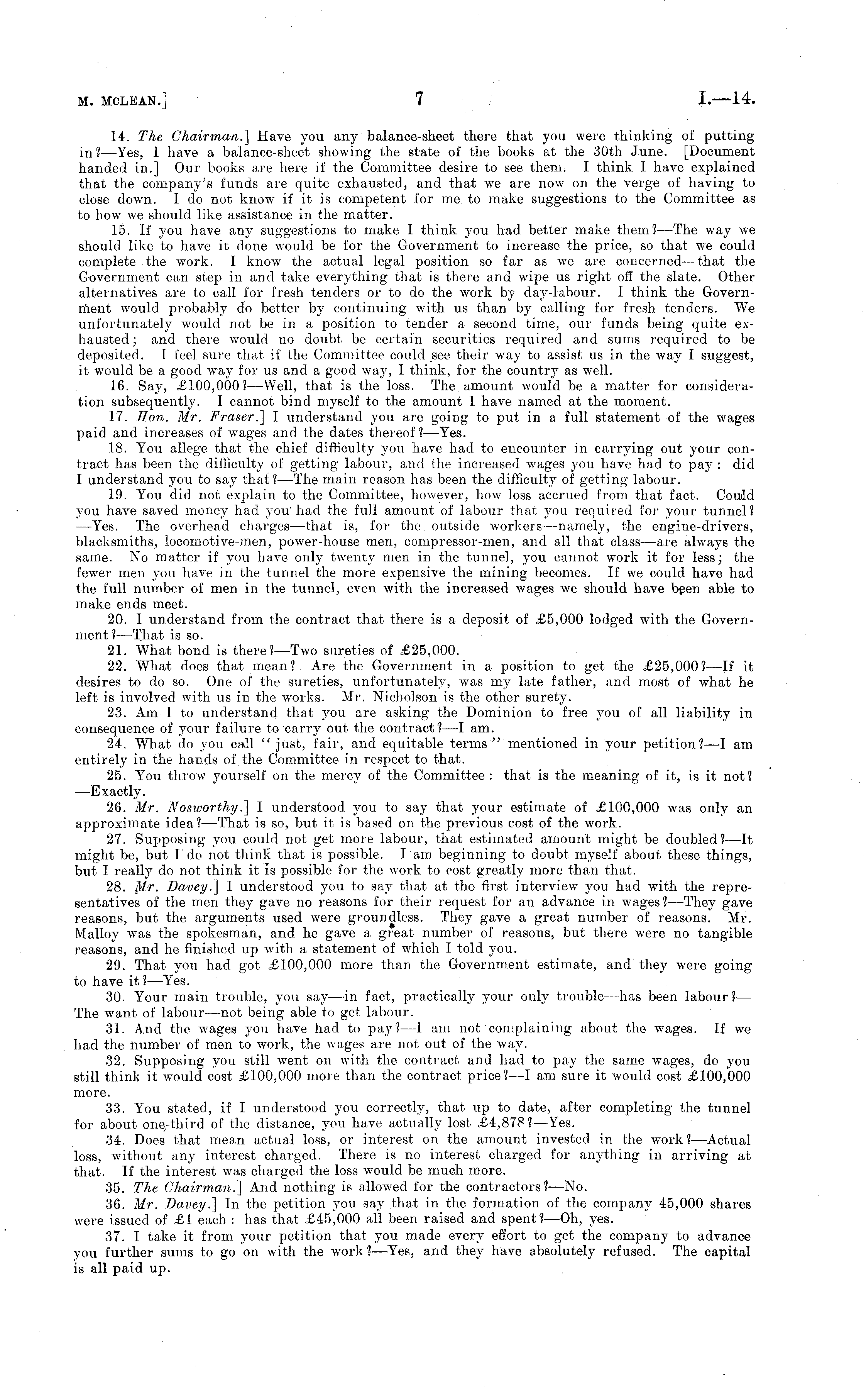 14. The Chairman.] Have you any balance-sheet there that you were thinking of putting in? —Yes, I have a balance-sheet showing the state of the books at the 30th June. [Document handed in.] Our books are here if the Committee desire to see them. I think I have explained that the company's funds are quite exhausted, and that we are now on the verge of having to close down. I do not know if it is competent for me to make suggestions to the Committee as to how we should like assistance in the matter. 15. If you have anj' suggestions to make I think you had better make them? —The way we should like to have it done would be for the Government to increase the price, so that we could complete the work. I know the actual legal position so far as we are concerned —that the Government can step in and take everything that is there and wipe us right off the slate. Other alternatives are to call for fresh tenders or to do the work by day-labour. 1 think the Government would probably do better by continuing with us than by calling for fresh tenders. We unfortunately would not be in a position to tender a second time, our funds being quite exhausted; and there would no doubt be certain securities required and sums required to be deposited. I feel sure that if the Committee could see their way to assist us in the way I suggest, it would be a good way for us and a good way, I think, for the country as well. 16. Say, £100,000? —Well, that is the loss. The amount would be a matter for consideration subsequently. I cannot bind myself to the amount I have named at the moment. 17. Hon. Mr. Fraser.] I understand you are going to put in a full statement of the wages paid and increases of wages and the dates thereof? —Yes. 18. You allege that the chief difficulty you have had to encounter in carrying out your contract has been the difficulty of getting labour, and the increased wages you have had to pay : did I understand you to say that?— The main reason has been the difficulty of getting labour. 19. You did not explain to the Committee, however, how loss accrued from that fact. Could you have saved money had you' had the full amount of labour that, you required for your tunnel? —Yes. The overhead charges—that is, for the outside workers —namely, the engine-drivers, blacksmiths, locomotive-men, power-house men, compressor-men, and all that class —are always the same. No matter if you have only twenty men in the tunnel, you cannot work it for less; the fewer men you have in the tunnel the more expensive the mining becomes. If we could have had the full number of men in the tunnel, even with the increased wages we should have been able to make ends meet. 20. I understand from the contract that there is a deposit of £5,000 lodged with the Government? —That is so. 21. What bond is there?— Two sureties of £25,000. 22. What does that mean? Are the Government in a position to get the £25,000? —If it desires to do so. One of the sureties, unfortunately, was my late father, and most of what he left is involved with us in the works. Mr. Nicholson is the other surety. 23. Am I to understand that you are asking the Dominion to free you of all liability in consequence of your failure to carry out the contract?—l am. 24. What do you call " just, fair, and equitable terms " mentioned in your petition?—l am entirely in the hands of the Committee in respect to that. 25. You throw yourself on the mercy of the Committee : that is the meaning of it, is it not? —Exactly. 26. Mr. Nosworthy.~] I understood you to say that your estimate of £100,000 was only an approximate idea ? —That is so, but it is based on the previous cost of the work. 27. Supposing you could not get more labour, that estimated amount might be doubled?—lt might be, but I'do not think that is possible. lam beginning to doubt myself about these things, but I really do not think it is possible for the work to cost greatly more than that. 28. Mr. Davey.\ I understood you to say that at the first interview you had with the representatives of the men they gave no reasons for their request for an advance in wages?— They gave reasons, but the arguments used were groundless. They gave a great number of reasons. Mr. Malloy was the spokesman, and he gave a great number of reasons, but there were no tangible reasons, and he finished up with a statement of which I told you. 29. That you had got £100,000 more than the Government estimate, and they were going to have it? —Yes. 30. Your main trouble, you say —in fact, practically your only trouble —has been labour?— The want of labour—not being able to get labour. 31. And the wages you have had to pay?—l am not complaining about the wages. If we had the number of men to work, the wages are not out of the way. 32. Supposing you still went on with the contract and had to pay the same wages, do you still think it would cost £100,000 more than the contract price?—l am sure it would cost £100,000 more. 33. You stated, if I understood you correctly, that up to date, after completing the tunnel for about one,-third of the distance, you have actually lost £4,878? —Yes. 34. Does that mean actual loss, or interest on the amount invested in the work?— Actual loss, without any interest charged. There is no interest charged for anything in arriving at that. If the interest was charged the loss would be much more. 35. The And nothing is allowed for the contractors? —No. 36. Mr. Davey .] In the petition you say that in the formation of the company 45,000 shares were issued of £1 each : has that £45,000 all been raised and spent?—Oh, yes. 37. I take it from your petition that you made every effort to get the company to advance you further sums to go on with the work? —Yes, and they have absolutely refused. The capital is all paid up.