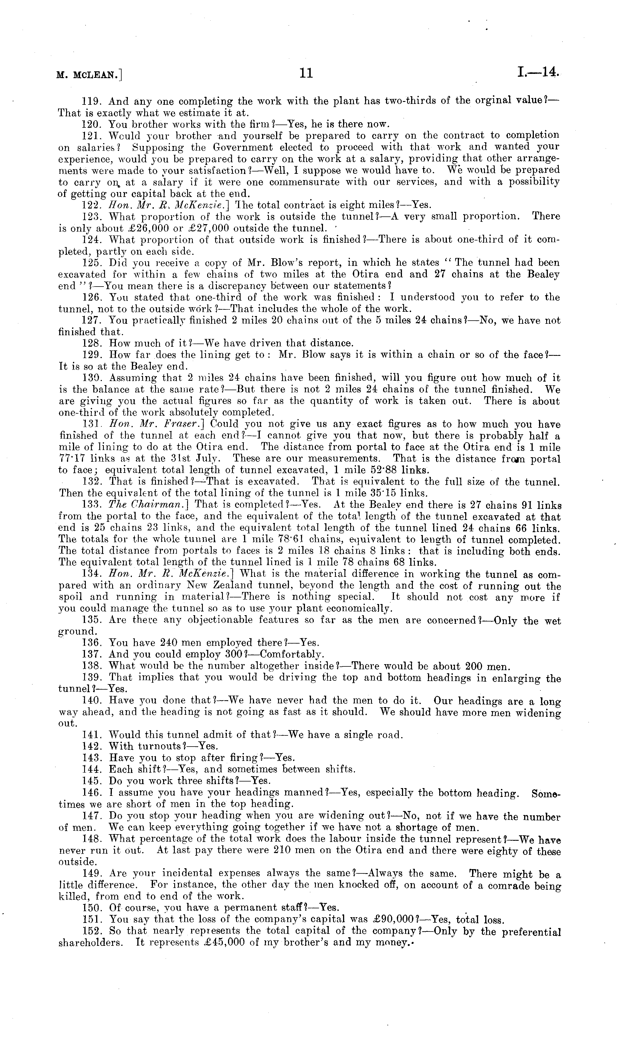 119. And any one completing the work with the plant has two-thirds of the orginal value? — That is exactly what we estimate it at. 120. You brother works with the firm?— Yes, he is there now. 121. Would your brother and yourself be prepared to carry on the contract to completion on salaries, ? Supposing the Government elected to proceed with that work and wanted your experience, would you be prepared to carry on the work at a salary, providing that other arrangements were made to your satisfaction?— Well, I suppose we would have to. We would be prepared to carry on, at a salary if it were one commensurate with our services, and with a possibility of getting our capital back at the end. 122. Hon. Mr. B, McKenzie.] The total contract is eight miles? —Yes. 123. What proportion of the work is outside the tunnel? —A very small proportion. There is only about £26,000 or £27,000 outside the tunnel. ' 124. What proportion of that outside work is finished? —There is about one-third of it completed, partly on each side. 125. Did you receive a cop) 7 of Mr. Blow's report, in which he states " The tunnel had been excavated for within a few chains of two miles at the Otira end and 27 chains at the Bealey end "? —You mean there is a discrepancy between our statements? 126. You stated that one-third of the work was finished : I understood you to refer to the tunnel, not to the outside work ?—That includes the whole of the work. 127. You practically finished 2 miles 20 chains out of the 5 miles 24 chains?—No, we have not finished that. 128. How much of it?—We have driven that distance. 129. How far does the lining get to : Mr. Blow says it is within a chain or so of the face? — It is so at the Bealey end. 130. Assuming that 2 miles 24 chains have been finished, will you figure out how much of it is the balance at the same rate?— But there is not 2 miles 24 chains of the tunnel finished. We are giving you the actual figures so far as the quantity of work is taken out. There is about one-third of the work absolutely completed. 131. Hon. Mr. Fraser.] Could you not give us any exact figures as to how much you have finished of the tunnel at each end I —l cannot give you that now, but there is probably half a mile of lining to do at the Otira end. The distance from portal to face at the Otira end is 1 mile 7717 links as at the 31st July. These are our measurements. That is the distance from portal to face; equivalent total length of tunnel excavated, 1 mile 5288 links. 132. That is finished? —-That is excavated. That is equivalent to the full size of the tunnel. Then the equivalent of the total lining of the tunnel is 1 mile 3515 links. 133. The Chairman.] That is completed?— Yes. At the Bealey end there is 27 chains 91 links from the portal to the face, and the equivalent of the tota! length of the tunnel excavated at that end is 25 chains 23 links, and the equivalent total length of the tunnel lined 24 chains 66 links. The totals for the whole tunnel are 1 mile 78'6l chains, equivalent to length of tunnel completed. The total distance from portals to faces is 2 miles 18 chains 8 links : that is including both ends. The equivalent total length of the tunnel lined is 1 mile 78 chains 68 links. 134. Hon. Mr. 11. McKenzie.] What is the material difference in working the tunnel as compared with an ordinary New Zealand tunnel, beyond the length and the cost of running out the spoil and running in material?— There is nothing special. It should not cost any more if you could manage the tunnel so as to use your plant economically. 135. Are theve any objectionable features so far as the men are concerned?— Only the wet ground. 136. You have 240 men employed there? —Yes. 137. And you could employ 300?— Comfortably. 138. What would be the number altogether inside? —There would be about 200 men. 139. That implies that you would be driving the top and bottom headings in enlarging the tunnel? —Yes. 140. Have you done that?—We have never had the men to do it. Our headings are a long way ahead, and the heading is not going as fast as it should. We should have more men widening out. 141. Would this tunnel admit of that?—We have a single road. 142. With turnouts? —Yes. 143. Have you to stop after firing? —Yes. 144. Each shift? —Yes, and sometimes between shifts. 145. Do you work three shifts? —Yes. 146. I assume you have your headings manned?— Yes, especially the bottom heading. Sometimes we are short of men in the top heading. 147. Do you stop your heading when you are widening out?—No, not if we have the number of men. We can keep everything going together if we have not a shortage of men. 148. What percentage of the total work does the labour inside the tunnel represent?—We have never run it out. At last pay there were 210 men on the Otira end and there were eighty of these outside. 149. Are your incidental expenses always the same?— Always the same. There might be a little difference. For instance, the other day the men knocked off, on account of a comrade being killed, from end to end of the work. 150. Of course, you have a permanent staff?— Yes. 151. You say that the loss of the company's capital was £90,000? —Yes, total loss. 152. So that nearly represents the total capital of the company?— Only by the preferential shareholders. It represents £45,000 of my brother's and my money.-
