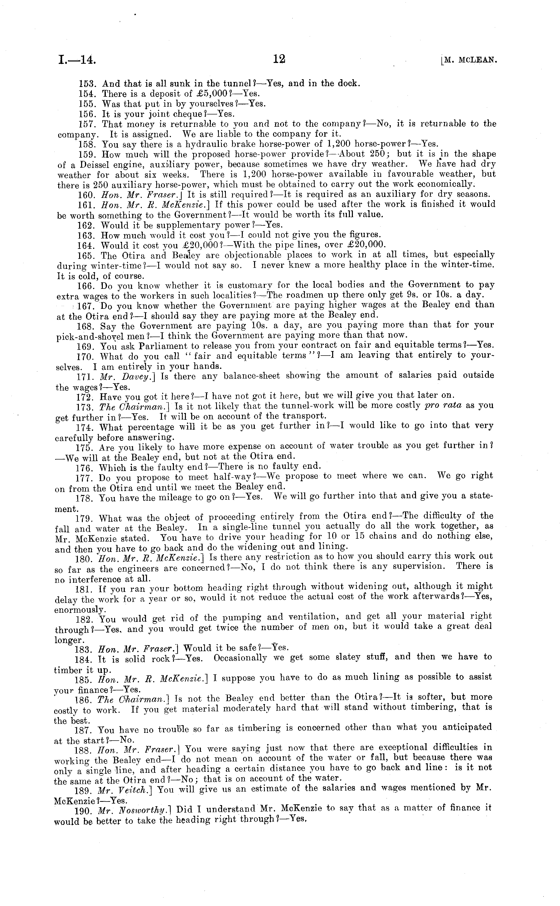 153. And that is all sunk in the tunnel?— Yes, and in the dock. 154. There is a deposit of £s,ooo?—Yes. 155. Was that put in by yourselves?— Yes. 156. It is your joint cheque? —Yes. 157. That money is returnable to you and not to the company?—No, it is returnable to the company. It is assigned. We are liable to the company for it. 158. You say there is a hydraulic brake horse-power of 1,200 horse-power?— Yes. 159. How much will the proposed horse-power provide?—-About 250; but it is in the shape of a Deissel engine, auxiliary power, because sometimes we have dry weather. We have had dry weather for about six weeks. There is 1,200 horse-power available in favourable weather, but there is 250 auxiliary horse-power, which must be obtained to carry out the work economically. 160. Hon. Mr. Fraser.\ It is still required? —It is required as an auxiliary for dry seasons. 161. Hon. Mr. B. McKenzie.] If this power could be used after the work is finished it would be worth something to the Government ?—lt would be worth its full value. 162. Would it be supplementary power?— Yes. 163. How much would it cost you?—l could not give you the figures. 164. Would it cost you £20,000?— With the pipe lines, over £20,000. 165. The Otira and Beailey are objectionable places to work in at all times, but especially during winter-time? —I would not say so. I never knew a more healthy place in the winter-time. It is cold, of course. 166. Do you know whether it is customary for the local bodies and the Government to pay extra wages to the workers in such localities?— The roadmen up there only get 9s. or 10s. a day. 167. Do you know whether the Government are paying higher wages at the Bealey end than at the Otira end ?—I should say they are paying more at the Bealey end. 168. Say the Government are paying 10s. a day, are you paying more than that for your pick-and-shovel men ?—I think the Government are paying more than that now. 169. You ask Parliament to release you from your contract on fair and equitable terms? —Yes. 170. What do you call "fair and equitable terms"? —I am leaving that entirely to yourselves. lam entirely in your hands. 171. Mr. Davey.] Is there any balance-sheet showing the amount of salaries paid outside the wages? —Yes. 172. Have you got it here? —I have not got it here, but we will give you that later on. 173. The Chairman.} Is it not likely that the tunnel-work will be more costly pro rata as you get further in ? —Yes. It will be on account of the transport. 174. What percentage will it be as you get further in?—l would like to go into that very carefully before answering. 175. Are you likely to have more expense on account of water trouble as you get further in? We will at the Bealey end, but not at the Otira end. 176. Which is the faulty end? —There is no faulty end. 177. Do you propose to meet half-way? —We propose to meet where we can. We go right on from the Otira end until we meet the Bealey end. 178. You have the mileage to go on I—Yes.1 —Yes. We will go further into that and give you a state--179. What was the object of proceeding entirely from the Otira end? —The difficulty of the fall and water at the Bealey. In a single-line tunnel you actually do all the work together, as Mr. McKenzie stated. You have to drive your heading for 10 or 15 chains and do nothing else, and then you have to go back and do the widening out and lining. 180. Hon. Mr. B. McKenzie.] Is there any restriction as to how you should carry this work out so far as the engineers are concerned? —No,' I do not think there is any supervision. There is no interference at all. . 181. If you ran your bottom heading right through without widening out, although it might delay the work for a year or so, would it not reduce the actual cost of the work afterwards? —Yes, enormously. . . . 182. You would get rid of the pumping and ventilation, and get all your material right through? Yes, and you would get twice the number of men on, but it would take a great deal longer. 183. Hon. Mr. Fraser.] Would it be safe? —Yes. 184. It is solid rock? —Yes. Occasionally we get some slatey stuff, and then we have to timber it up. . 185. Hon. Mr. B. McKenzie.] I suppose you have to do as much lining as possible to assist your finance? —Yes. 186. The Chairman .] Is not the Bealey end better than the Otira?—lt ia softer, but more costly to work. If you get material moderately hard that will stand without timbering, that is the best. . , 187. You have no trouble so far as timbering is concerned other than what you anticipated at the start? —No. ~,.„... 188. Hon. Mr. Fraser.] You were saying just now that there are exceptional difficulties in working the Bealey end —I do not mean on account of the water or fall, but because there was only a single line,'and after heading a certain distance you have to go back and line: is it not the'same at the Otira end? —No; that is on account of the water. 189. Mr. Veitch.] You will give us an estimate of the salaries and wages mentioned by Mr. McKenzie ? —Yes. 190. Mr. Nosworthy.] Did I understand Mr. McKenzie to say that as a matter ot finance it would be better to take the heading right through?— Yes,