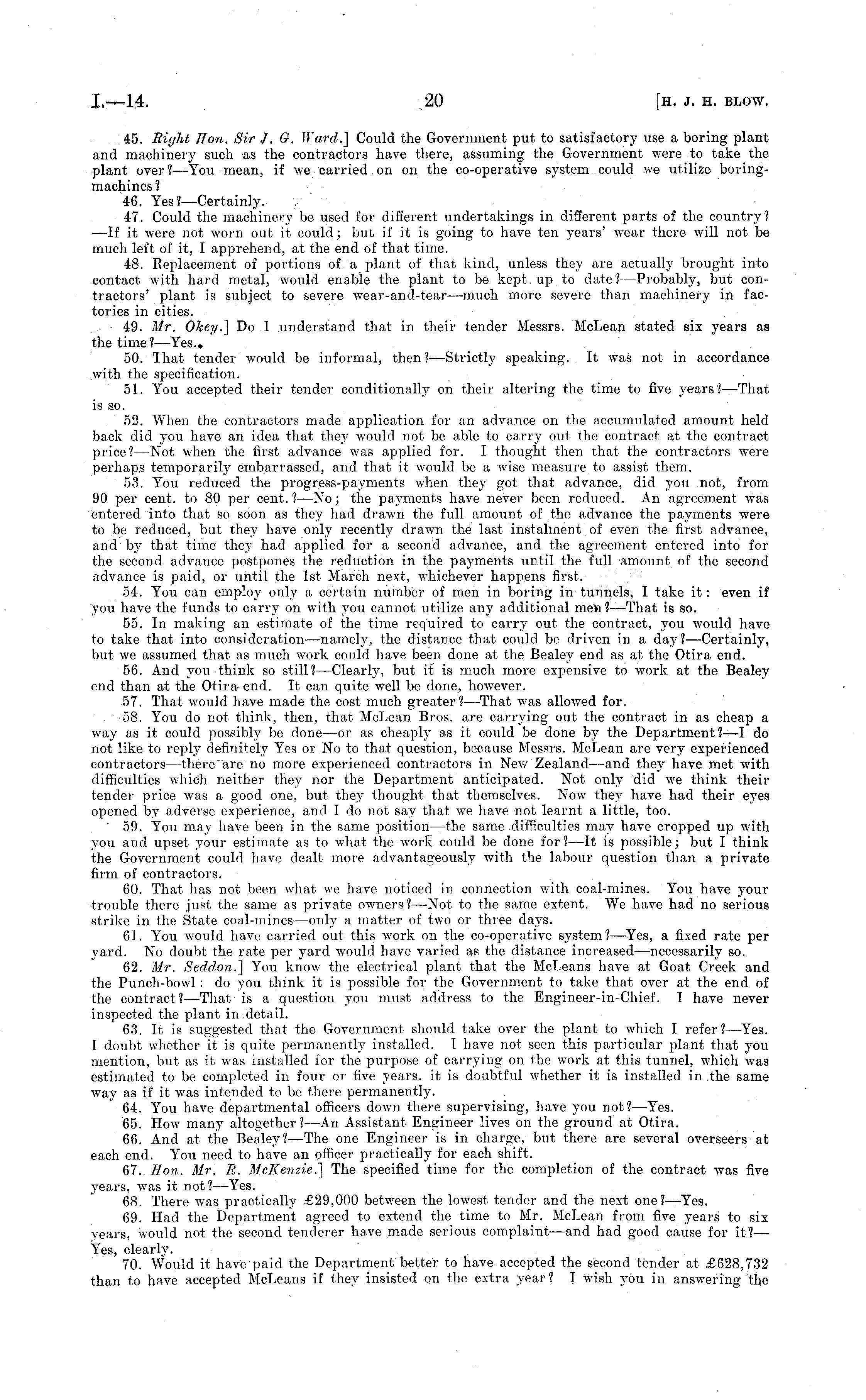45. Right Hon. Sir J, G. Ward.] Could the Government put to satisfactory use a bormg plant and machinery such as the contractors have there, assuming the Government were to take the plant over?— You mean, if we carried on on the co-operative system could we utilize boringmachines ? 46. Yes? —Certainly. 47. Could the machinery be used for different undertakings in different parts of the country? —If it were not worn out it could; but if it is going to have ten years' wear there will not be much left of it, I apprehend, at the end of that time. 48. Replacement of portions of a plant of that kind, unless they are actually brought into contact with hard metal, would enable the plant to be kept up to date?— Probably, but contractors' plant is subject to severe wear-and-tear —much more severe than machinery in factories in cities. 49. Mr. OJcey.] Do I understand that in their tender Messrs. McLean stated six years as the time? —Yes.. 50. Ibat tender would be informal, then? —Strictly speaking. It was not in accordance with the specification. 51. You accepted their tender conditionally on their altering the time to five years? —That is so. 52. When the contractors made application for an advance on the accumulated amount held back did you have an idea that they would not be able to carry out the contract at the contract price?— Not when the first advance was applied for. I thought then that the contractors were perhaps temporarily embarrassed, and that it would be a wise measure to assist them. 53. You reduced the progress-payments when they got that advance, did you not, from 90 per cent, to 80 per cent.? —No; the payments have never been reduced. An agreement was entered into that so soon as they had drawn the full amount of the advance the payments were to be reduced, but they have only recently drawn the last instalment of even the first advance, and by that time they had applied for a second advance, and the agreement entered into for the second advance postpones the reduction in the payments until the full amount of the second advance is paid, or until the Ist March next, whichever happens first. 54. You can employ only a certain number of men in boring in tunnels, I take it : even if you have the funds to carry on with you cannot utilize any additional men? —That is so. 55. In making an estimate of the time required to carry out the contract, you would have to take that into consideration—namely, the distance that could be driven in a day?— Certainly, but we assumed that as much work could have been done at the Bealey end as at the Otira end. 56. And you think so still? —Clearly, but it is much more expensive to work at the Bealey end than at the Otira- end. It can quite well be done, however. 57. That would have made the cost much greater? —That was allowed for. 58. You do not think, then, that McLean Bros, are carrying out the contract in as cheap a way as it could possibly be done —or as cheaply as it could be done by the Department?—l do not like to reply definitely Yes or No to that question, because Messrs. McLean are very experienced contractors —there are no more experienced contractors in New Zealand —and they have met with difficulties which neither they nor the Department anticipated. Not only did we think their tender price was a good one, but they thought that themselves. Now they have had their eyes opened by adverse experience, and I do not say that we have not learnt a little, too. 59. You may have been in the same position—the same difficulties may have cropped up with you and upset your estimate as to what the work could be done for? —It is possible; but I think the Government could have dealt more advantageously with the labour question than a private firm of contractors. 60. That has not been what we have noticed in connection with coal-mines. You have your trouble there just the same as private owners?— Not to the same extent. We have had no serious strike in the State coal-mines —only a matter of two or three days. 61. You would have carried out this work on the co-operative system?— Yes, a fixed rate per yard. No doubt the rate per yard would have varied as the distance increased —necessarily so. 62. Mr. Seddon.] You know the electrical plant that the McLeans have at Goat Creek and the Punch-bowl : do you think it is possible for the Government to take that over at the end of the contract?— That is a question you must address to the Engineer-in-Chief. I have never inspected the plant in detail. 63. It is suggested that the Government should take over the plant to which I refer?— Yes. I doubt whether it is quite permanently installed. I have not seen this particular plant that you mention, but as it was installed for the purpose of carrying on the work at this tunnel, which was estimated to be completed in four or five years, it is doubtful whether it is installed in the same way as if it was intended to be there permanently. 64. You have departmental officers down there supervising, have you not?— Yes. 65. How many altogether?—An Assistant Engineer lives on the ground at Otira. 66. And at the Bealey?—The one Engineer is in charge, but there are several overseers at each end. You need to have an officer practically for each shift. 67.. Hon. Mr. R. McKenzie.] The specified time for the completion of the contract was five was it not ?—Yes. 68. There was practically £29,000 between the lowest tender and the next one?— Yes. 69. Had the Department agreed to extend the time to Mr. McLean from five years to six years, would not the second tenderer have made serious complaint—and had good cause for it?— Yes, clearly. 70. Would it have paid the Department better to have accepted the second tender at £628,732 than to have accepted McLeans if they insisted on the extra year? I wish you in answering the