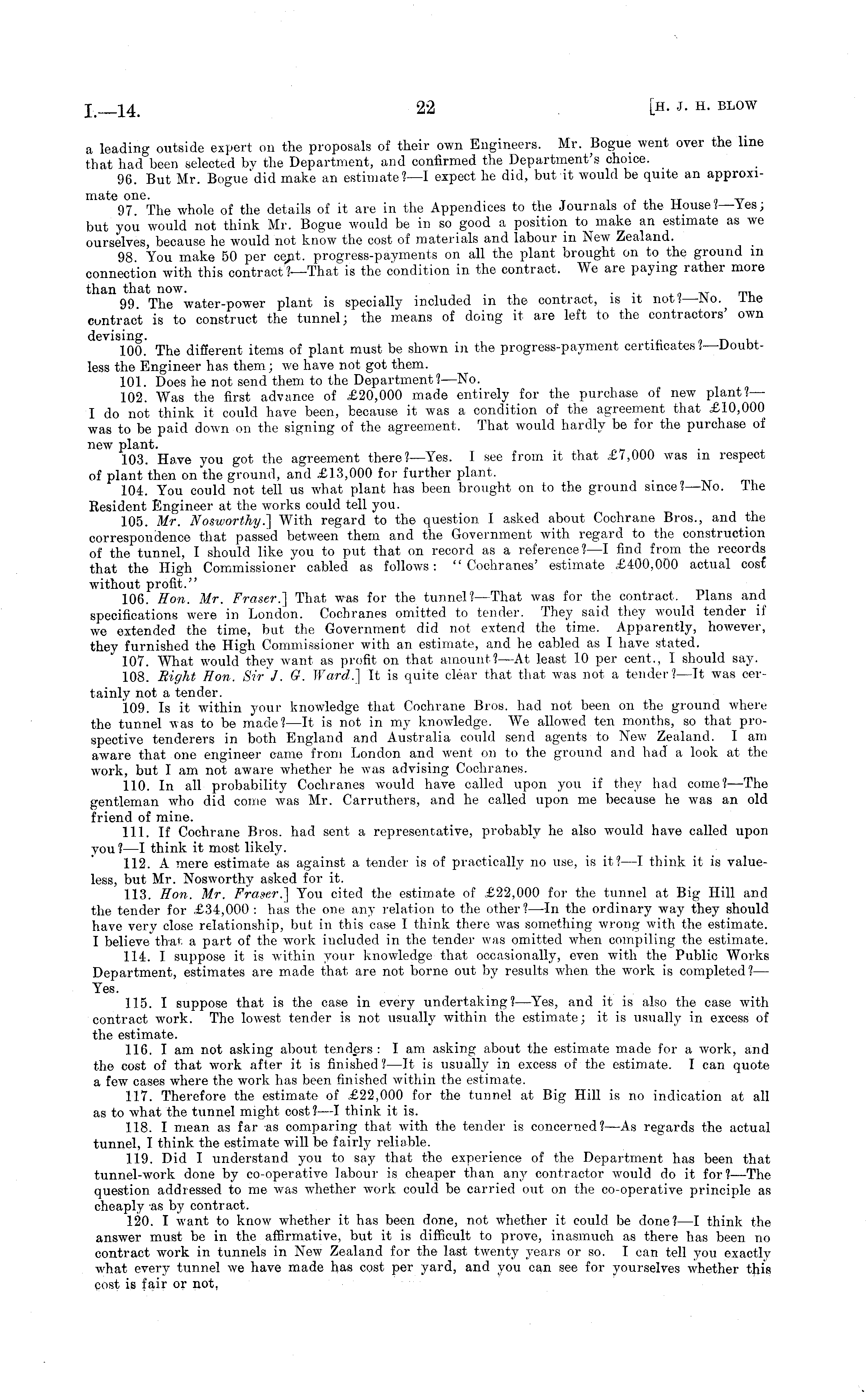 a leading outside expert on the proposals of their own Engineers. Mr. Bogue went over the line that had been selected by the Department, and confirmed the Department's choice. 96. But Mr. Bogue did make an estimate?—l expect he did, but it would be quite an approximate one. 97. The whole of the details of it are in the Appendices to the Journals ot the House.' — Yes; but you would not think Mr. Bogue would be in so good a position to make an estimate as we ourselves, because he would not know the cost of materials and labour in New Zealand. 98 You make 50 per cent, progress-payments on all the plant brought on to the ground m connection with this contract '?—That is the condition in the contract. We are paying rather more than that now. . . „, 99. The water-power plant is specially included in the contract, is it not J —JNo. me contract is to construct the tunnel; the means of doing it are left to the contractors' own 100. The different items of plant must be shown in the progress-payment certificates? —Doubtless the Engineer has them; we have not got them. 101. Does he not send them to the Department? —No. 102. Was the first advance of £20,000 made entirely for the purchase of new plant?— I do not think it could have been, because it was a condition of the agreement that £10,000 was to be paid down on the signing of the agreement. That would hardly be for the purchase of new plant. 103. Have you got the agreement there? —Yes. I see from it that £7,000 was in respect of plant then on the ground, and £13,000 for further plant. 104. You could not tell us what plant has been brought on to the ground since?— No. The Resident Engineer at the works could tell you. 105. Mr. Nosworthy.] With regard to the question I asked about Cochrane Bros., and the correspondence that passed between them and the Government with regard to the construction of the tunnel, I should like you to put that on record as a reference? —I find from the records that the High Commissioner cabled as follows: " Cochranes' estimate £400,000 actual cos£ without profit." 106. Hon. Mr. Fraser.] That was for the tunnel? —That was for the contract. Plans and specifications were in London. Cochranes omitted to tender. They said they would tender if we extended the time, but the Government did not extend the time. Apparently, however, they furnished the High Commissioner with an estimate, and he cabled as I have stated. 107. What would they want as profit on that amount? —At least 10 per cent., I should say. 108. Right Hon. Sir J. G. Ward.] It is quite clear that that was not a tender? —It was certainly not a tender. 109. Is it within your knowledge that Cochrane Bros, had not been on the ground where the tunnel was to be made? —It is not in my knowledge. We allowed ten months, so that prospective tenderers in both England and Australia could send agents to New Zealand. I am aware that one engineer came from London and went on to the ground and had a look at the work, but I am not aware whether he was advising Cochranes. 110. In all probability Cochranes would have called upon you if they had come? —The gentleman who did come was Mr. Carruthers, and he called upon me because he was an old friend of mine. 111. If Cochrane Bros, had sent a representative, probably he also would have called upon you ? —I think it most likely. 112. A mere estimate as against a tender is of practically no use, is it? —I think it is valueless, but Mr. Nosworthy asked for it. 113. Hon. Mr. Fraser.'] You cited the estimate of £22,000 for the tunnel at Big Hill and the tender for £34,000 : has the one any relation to the other?—ln the ordinary way they should have very close relationship, but in this case I think there was something wrong with the estimate. I believe that a part of the work included in the tender was omitted when compiling the estimate. 114. I suppose it is within your knowledge that occasionally, even with the Public Works Department, estimates are made that are not borne out by results when the work is completed?— Yes. 115. I suppose that is the case in every undertaking? —Yes, and it is also the case with contract work. The lowest tender is not usually within the estimate; it is usually in excess of the estimate. 116. I am not asking about tenders : I am asking about the estimate made for a work, and the cost of that work after it is finished? —It is usually in excess of the estimate. I can quote a few cases where the work has been finished within the estimate. 117. Therefore the estimate of £22,000 for the tunnel at Big Hill is no indication at all as to what the tunnel might cost?—l think it is. 118. I mean as far as comparing that with the tender is concerned?—As regards the actual tunnel, I think the estimate will be fairly reliable. 119. Did I understand you to say that the experience of the Department has been that tunnel-work done by co-operative labour is cheaper than any contractor would do it for?— The question addressed to me was whether work could be carried out on the co-operative principle as cheaply as by contract. 120. I want to know whether it has been done, not whether it could be done? —I think the answer must be in the affirmative, but it is difficult to prove, inasmuch as there has been no contract work in tunnels in New Zealand for the last twenty years or so. I can tell you exactly what every tunnel we have made has cost per yard, and you can see for yourselves whether this cost is fair or not,