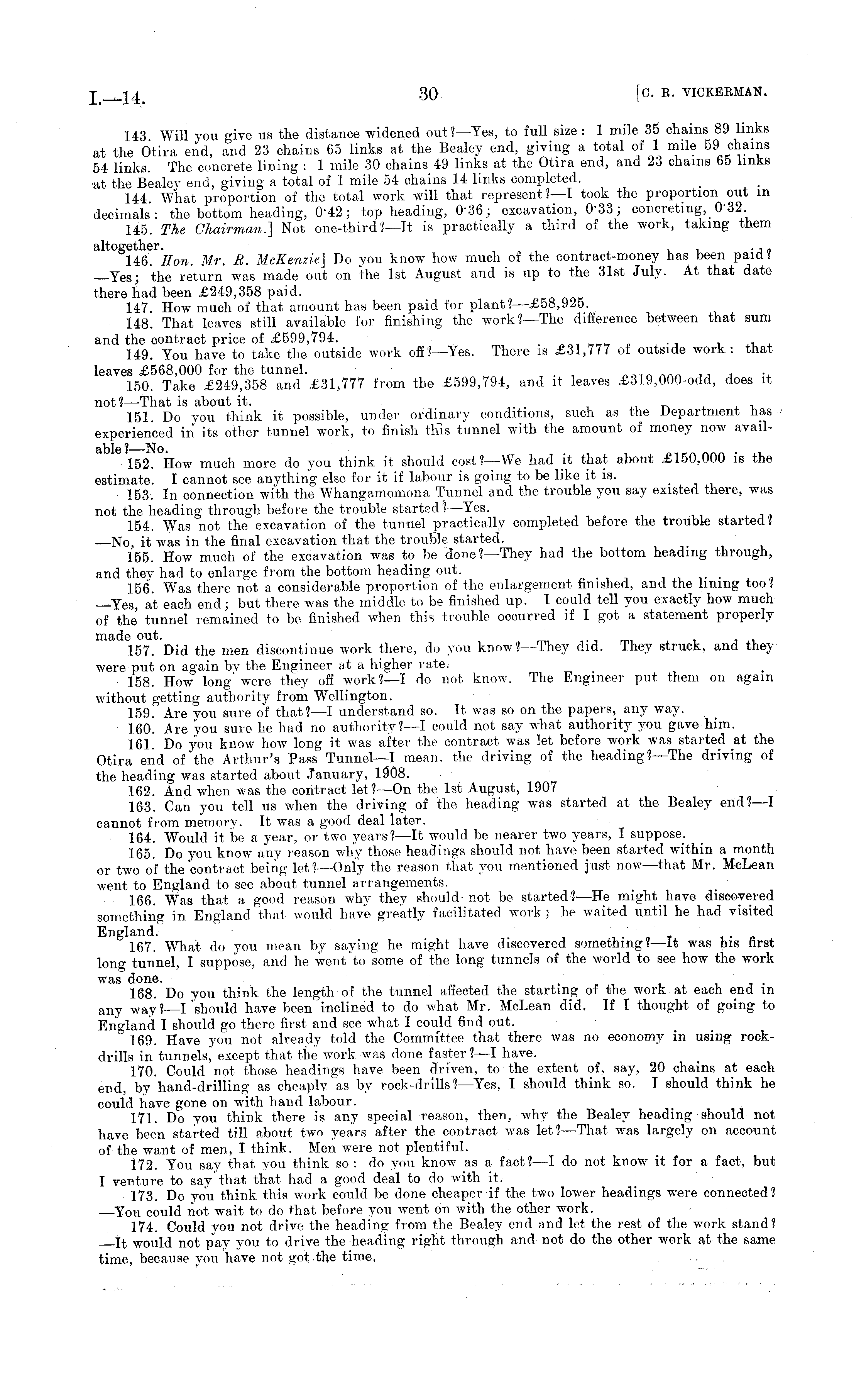 143 Will you give us the distance widened out?— Yes, to full size : 1 mile 35 chains 89 links at the Otira end, and 23 chains 65 links at the Bealey end, giving a total of 1 mile 59 chains 54 links. The concrete lining : 1 mile 30 chains 49 links at the Otira end, and 23 chains 65 links ■at the Bealev end, giving a total of 1 mile 54 chains 14 links completed. 144 What proportion of the total work will that represent?—l took the proportion out in decimals: the bottom heading, 042; top heading, 036; excavation, 033; concreting, 032 145. The Chairman.} Not one-third ?—lt is practically a third of the work, taking them altogether. , ... 146. Hon. Mr. B. McKenzie] Do you know how much of the contract-money has been paid l —Yes; the return was made out on the Ist August and is up to the 31st July. At that date there had been £249,358 paid. 147 How much of that amount has been paid for plant? —£58,920. 148. That leaves still available for finishing the work?— The difference between that sum and the contract price of £599,794. 149. You have to take the outside work off?— Yes. There is £31,7*7 of outside work: that leaves £568,000 for the tunnel. . „„,. . M ~ , 150. Take £249,358 and £31,777 from the £599,794, and it leaves £319,000-odd, does it not? —That is about it. 151 Do you think it possible, under ordinary conditions, such as the Department has experienced in its other tunnel work, to finish this tunnel with the amount of money now available ? No 152. How much more do you think it should cost?—We had it that about £150,000 is the estimate. I cannot see anything else for it if labour is going to be like it is. 153. In connection with the Whangamomona Tunnel and the trouble you say existed there, was not the heading through before the trouble started ? —Yes. 154. Was not the excavation of the tunnel practically completed before the trouble started! —No, it was in the final excavation that the trouble started. 155. How much of the excavation was to be done? —They had the bottom heading through, and they had to enlarge from the bottom heading out. _ 156. Was there not a considerable proportion of the enlargement finished, and the lining too? —Yes, at each end; but there was the middle to be finished up. I could tell you exactly how much of the tunnel remained to be finished when this trouble occurred if I got a statement properly 157. Did the men discontinue work there, do you know? —They did. They struck, and they were put on again by the Engineer at a higher rate. 158. How long'were they off work?—l do not know. The Engineer put them on again without getting authority from Wellington. 159. Are you sure of that? —I understand so. It was so on the papers, any way. 160. Are you sure he had no authority?—l could not say what authority you gave him. 16L Do you know how long it was after the contract was let before work was started at the Otira end of the Arthur's Pass Tunnel—l mean, the driving of the heading ?—-The driving of the heading was started about January, 1908. 162. And when was the contract let?—On the Ist August, 1907 163. Can you tell us when the driving of the heading was started at the Bealey end? —I cannot from memory. It was a good deal later. 164. Would it be a year, or two years? —It would be nearer two years, I suppose. 165. Do you know any reason why those headings should not have been started within a month or two of the contract being let? —Only the reason that you mentioned just now —that Mr. McLean went to England to see about tunnel arrangements. 166. Was that a good reason why they should not be started? —He might have discovered something in England that would have greatly facilitated work; he waited until he had visited England. . ' 167. What do you mean by saying he might have discovered something?—lt was his first long tunnel, I suppose, and he went to some of the long tunnels of the world to see how the work was done. . 168. Do you think the length of the tunnel affected the starting of the work at each end in any way?—l should have been inclined to do what Mr. McLean did. If I thought of going to England I should go there first and see what I could find out. 169. Have you not already told the Committee that there was no economy in using rockdrills in tunnelsj except that the work was done faster? —I have. 170. Could not those headings have been driven, to the extent of, say, 20 chains at each end, by hand-drilling as cheaply as by rock-drills? —Yes, I should think so. I should think he could have gone on with hand labour. 171. Do you think there is any special reason, then, why the Bealey heading should not have been started till about two years after the contract was let? —That was largely on account of the want of men, I think. Men were not plentiful. 172. You say that you think so :do you know as a fact? —I do not know it for a fact, but I venture to say'that that had a good deal to do with it. 173. Do you think this work could be done cheaper if the two lower headings were connected? You could not wait to do that before you went on with the other work. 174. Could you not drive the heading from the Bealey end and let the rest of the work stand? It would not pay you to drive the heading right through and not do the other work at the same time, because you have not got the time,