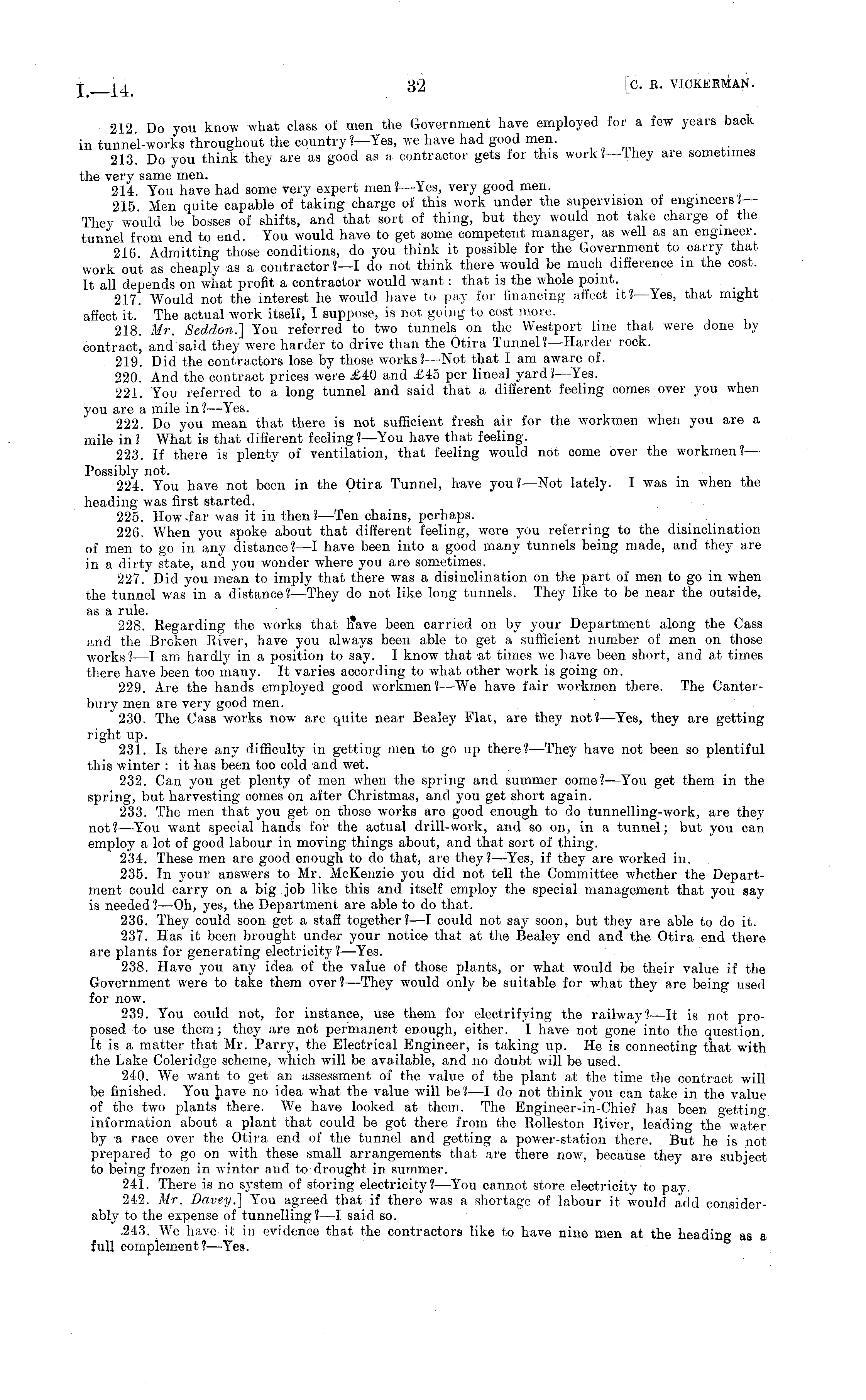 212. Do you know what class of men the Government have employed for a few years back in tunnel-works throughout the country?— Yes, we have had good men. 213. Do you think they are as good as a contractor gets for this work?— lhey are sometimes the very same men. 214 You have had some very expert men? —Yes, very good men. 215 Men quite capable of taking charge of this work under the supervision of engineers J— They would be bosses of shifts, and that sort of thing, but they would not take charge of the tunnel from end to end. You would have to get some competent manager, as well as an engineer. 216 Admitting those conditions, do you think it possible for the Government to carry that work out as cheaply as a contractor ?—I do not think there would be much difference in the cost. It all depends on what profit a contractor would want: that is the whole point. 217. Would not the interest he would have to pay for financing affect it? —Yes, that might affect it. The actual work itself, I suppose, is not going to cost more. 218. Mr. Seddon.] You referred to two tunnels on the Westport line that were done by contract, and said they were harder to drive than the Otira Tunnel? —Harder rock. 219. Did the contractors lose by those works? —Not that I am aware of. 220. And the contract prices were £40 and £45 per lineal yard? —Yes. 221. You referred to a long tunnel and said that a different feeling comes over you when you are a mile in? —Yes. 222. Do you mean that there is not sufficient fresh air for the workmen when you are a mile in? What is that different feeling?— You have that feeling. 223. If there is plenty of ventilation, that feeling would not come over the workmen? — Possibly not. 224. You have not been in the Otira Tunnel, have you?— Not lately. I was in when the heading was first started. 225. How-far was it in then? —Ten chains, perhaps. 226. When you spoke about that different feeling, were you referring to the disinclination of men to go in any distance? —I have been into a good many tunnels being made, and they are in a dirty state, and you wonder where you are sometimes. 227. Did you mean to imply that there was a disinclination on the part of men to go in when the tunnel was in a distance? —They do not like long tunnels. They like to be near the outside, as a rule. 228. Regarding the works that have been carried on by your Department along the Cass and the Broken River, have you always been able to get a sufficient number of men on those works? —I am hardly in a position to say. I know that at times we have been short, and at times there have been too many. It varies according to what other work is going on. 229. Are the hands employed good workmen?—We have fair workmen there. The Canterbury men are very good men. 230. The Cass works now are quite near Bealey Flat, are they not? —Yes, they are getting right up. 231. Is there any difficulty in getting men to go up there? —They have not been so plentiful this winter : it has been too cold and wet. 232. Can you get plenty of men when the spring and summer come?— You get them in the spring, but harvesting comes on after Christmas, and you get short again. 233. The men that you get on those works are good enough to do tunnelling-work, are they not? —You want special hands for the actual drill-work, and so on, in a tunnel; but you can employ a lot of good labour in moving things about, and that sort of thing. 234. These men are good enough to do that, are they?— Yes, if they are worked in. 235. In your answers to Mr. McKenzie you did not tell the Committee whether the Department could carry on a big job like this and itself employ the special management that you say is needed? —Oh, yes, the Department are able to do that. 236. They could soon get a staff together?—l could not say soon, but they are able to do it. 237. Has it been brought under your notice that at the Bealey end and the Otira end there are plants for generating electricity? —Yes. 238. Have you any idea of the value of those plants, or what would be their value if the Government were to take them over?— They would only be suitable for what they are being used for now. 239. You could not, for instance, use them for electrifying the railway?—lt is not proposed to use them; they are not permanent enough, either. I have not gone into the question. It is a matter that Mr. Parry, the Electrical Engineer, is taking up. He is connecting that with the Lake Coleridge scheme, which will be available, and no doubt will be used. 240. We want to get an assessment of the value of the plant at the time the contract will be finished. You have no idea what the value will be? —I do not think you can take in the value of the two plants there. We have looked at them. The Engineer-in-Chief has been getting information about a plant that could be got there from the Rolleston River, leading the water by a race over the Otira end of the tunnel and getting a power-station there. But he is not prepared to go on with these small arrangements that are there now, because they are subject to being frozen in winter and to drought in summer. 241. There is no system of storing electricity?— You cannot store electricity to pay. 242. Mr, Davey.] You agreed that if there was a shortage of labour it would add considerably to the expense of tunnelling ?—I said so. .243. We have it in evidence that the contractors like to have nine men at the heading as a full complement? —Yes.