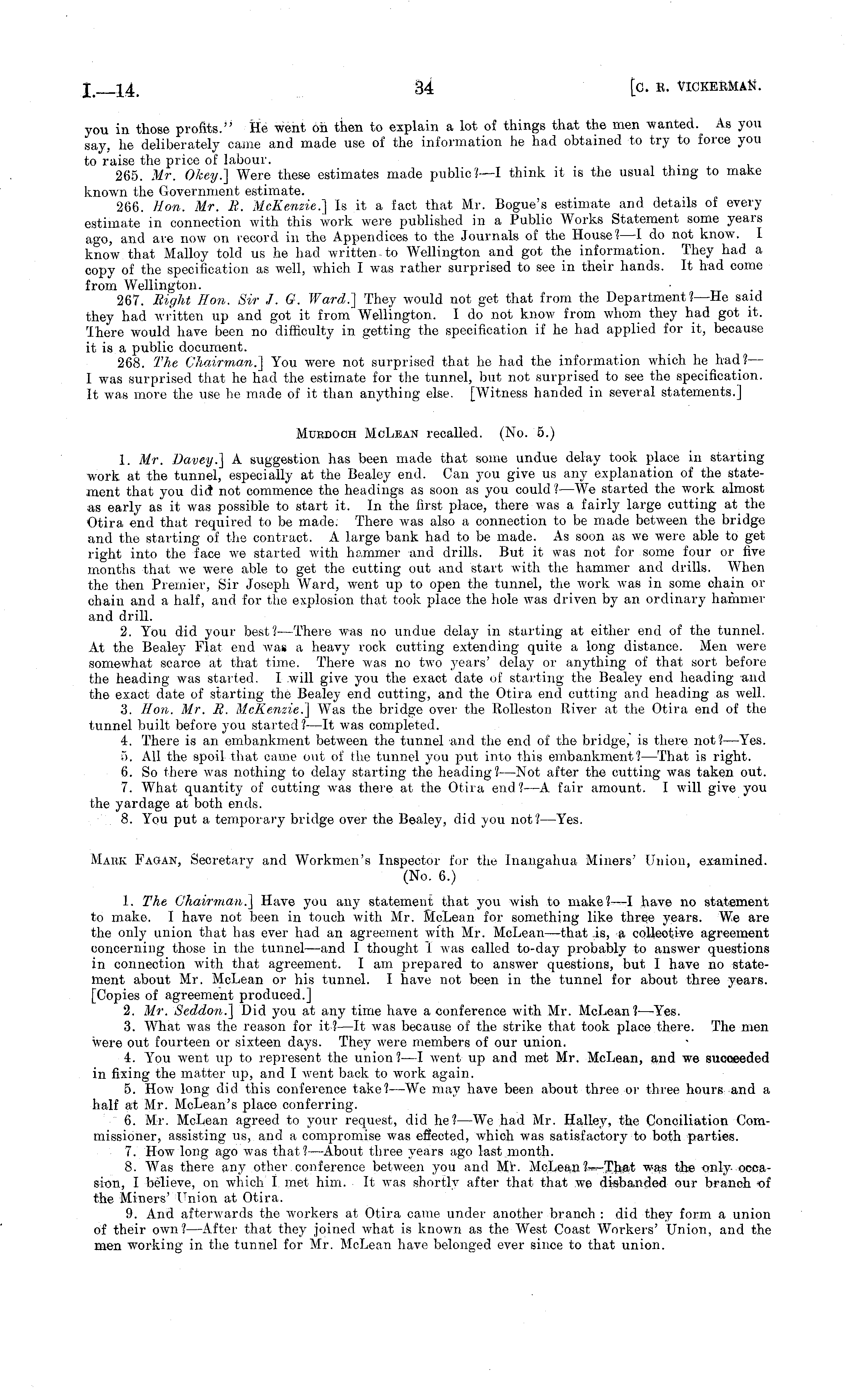 you in those profits." He went oh then to explain a lot of things that the men wanted. As you say. he deliberately came and made use of the information he had obtained to try to force you to raise the price of labour. 265. Mr. Okey.] Were these estimates made public?—l think it is the usual thing to make known the Government estimate. 266. Eon. Mr. R. McEenzie.] Is it a fact that Mr. Bogue's estimate and details of every estimate in connection with this work were published in a Public Works Statement some years ago, and are now on record in the Appendices to the Journals of the House? —I do not know. I know that Malloy told us he had written to Wellington and got the information. They had a copy of the specification as well, which I was rather surprised to see in their hands. It had come from Wellington. 267. Eight Hon. Sir J. G. Ward.} They would not get that from the Department? —He said they had written up and got it from Wellington. I do not know from whom they had got it. There would have been no difficulty in getting the specification if he had applied for it, because it is a public document. 268. The Chairman.} You were not surprised that he had the information which he had? — 1 was surprised that he had the estimate for the tunnel, but not surprised to see the specification. It was more the use he made of it than anything else. [Witness handed in several statements.] Mubdoch McLean recalled. (No. 5.) 1. Mr. Davey.] A suggestion has been made that some undue delay took place in starting work at the tunnel, especially at the Bealey end. Can you give us any explanation of the statement that you did not commence the headings as soon as you could ? —We started the work almost as early as it was possible to start it. In the first place, there was a fairly large cutting at the Otira end that required to be made. There was also a connection to be made between the bridge and the starting of the contract. A large bank had to be made. As soon as we were able to get right into the face we started with hammer and drills. But it was not for some four or five months that we were able to get the cutting out and start with the hammer and drills. When the then Premier, Sir Joseph Ward, went up to open the tunnel, the work was in some chain or chain and a half, and for the explosion that took place the hole was driven by an ordinary hammer and drill. 2. You did your best? —There was no undue delay in starting at either end of the tunnel. At the Bealey Flat end was a heavy rock cutting extending quite a long distance. Men were somewhat scarce at that time. There was no two years' delay or anything of that sort before the heading was started. I will give you the exact date of starting the Bealey end heading and the exact date of starting the Bealey end cutting, and the Otira end cutting and heading as well. 3. Hon. Mr. B. McKenzie.~\ Was the bridge over the Rolleston liiver at the Otira end of the tunnel built before you started ? —lt was completed. 4. There is an embankment between the tunnel and the end of the bridge, is there not?— Yes. 5. All the spoil that came out of the tunnel you put into this embankment? —That is right. 6. So there was nothing to delay starting the heading?— Not after the cutting was taken out. 7. What quantity of cutting was there at the Otira end? —A fair amount. I will give you the yardage at both ends. 8. You put a temporary bridge over the Bealey, did you not? —Yes. Mark Fagan, Secretary and Workmen's Inspector for the Inangahua Miners' Union, examined. (No. 6.) 1. The Chairman.] Have you any statement that you wish to make?—l have no statement to make. I have not been in touch with Mr. McLean for something like three years. We are the only union that has ever had an agreement with Mr. McLean —that is, a collective agreement concerning those in the tunnel —and I thought 1 was called to-day probably to answer questions in connection with that agreement. I am prepared to answer questions, but I have no statement about Mr. McLean or his tunnel. I have not been in the tunnel for about three years. [Copies of agreement produced.] 2. Mr. Seddon.] Did you at any time have a conference with Mr. McLean? —Yes. 3. What was the reason for it?—lt was because of the strike that took place there. The men were out fourteen or sixteen days. They were members of our union. 4. You went up to represent the union ?—I went up and met Mr. McLean, and we succeeded in fixing the matter up, and I went back to work again. 5. How long did this conference take? —We may have been about three or three hours and a half at Mr. McLean's place conferring. 6. Mr. McLean agreed to your request, did he? —We had Mr. Halley, the Conciliation Commissioner, assisting us, and a compromise was effected, which was satisfactory to both parties. 7. How long ago was that? —About three years ago last month. 8. Was there any other conference between you and Mr. McLean ?---That was the only occasion, I believe, on which I met him. It was shortly after that that we disbanded our branch -of the Miners' Union at Otira. 9. And afterwards the workers at Otira came under another branch : did they form a union of their own? —After that they joined what is known as the West Coast Workers' Union, and the men working in the tunnel for Mr. McLean have belonged ever since to that union.