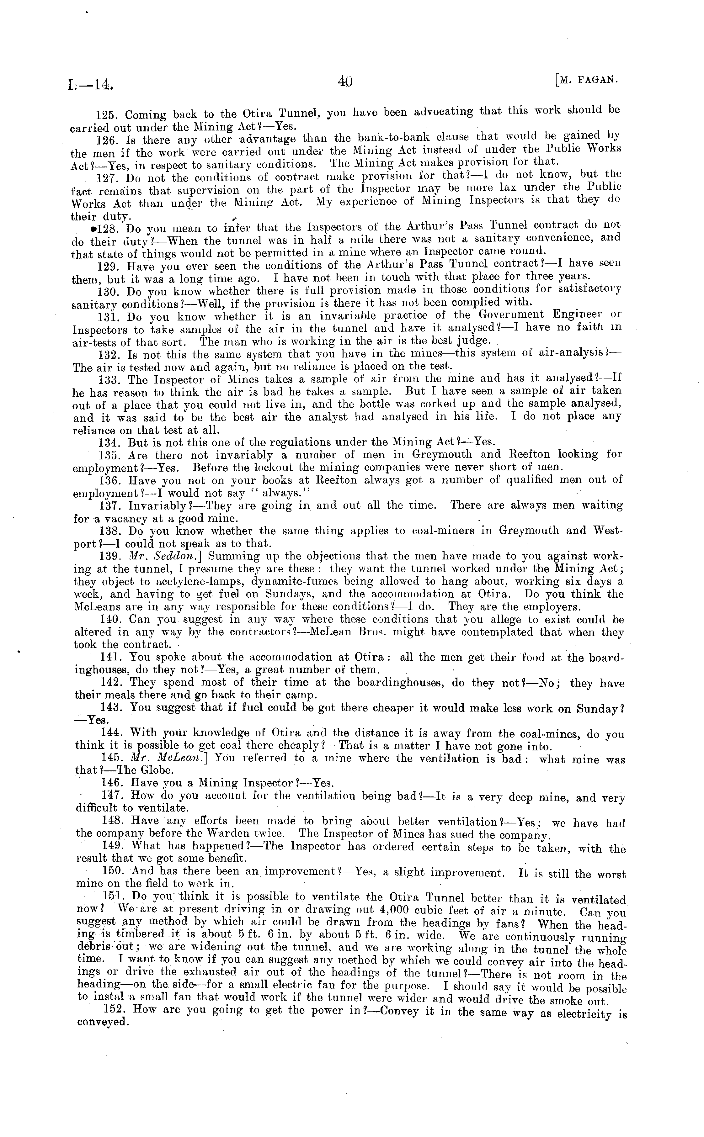 125. Coming back to the Otira Tunnel, you have been advocating that this work should be carried out under the Mining Act? —Yes. 126. Is there any other advantage than the bank-to-bank clause that would be gamed by the men'if the work were carried out under the Mining Act instead of under the Public Works Act? Yes, in respect to sanitary conditions. The Mining Act makes provision for that. 127. Do not the conditions of contract make provision for that?—l do not know, but the fact remains that supervision on the part of the Inspector may be more lax under the Public Works Act than under the Mining Act. My experience of Mining Inspectors is that they do their duty. , •128. Do you mean to infer that the Inspectors of the Arthur's Pass lunnel contract do not do their duty? —When the tunnel was in half a mile there was not a sanitary convenience, and that state of things would not be permitted in a mine where an Inspector came round. 129. Have you ever seen the conditions of the Arthur's Pass Tunnel contract? —I have seen them, but it was a long time ago. I have not been in touch with that place for three years. 130. Do you know whether there is full provision made in those conditions for satisfactorysanitary conditions? —Well, if the provision is there it has not been complied with. 131. Do you know whether it is an invariable practice of the Government Engineer or Inspectors to take samples of the air in the tunnel and have it analysed?—l have no faith in ■air-tests of that sort. The man who is working in the air is the best judge. . 132. Is not this the same system that you have in the mines—this system of air-analysis? — The air is tested now and again, but no reliance is placed on the test. 133. The Inspector of Mines takes a sample of air from the mine and has it analysed? —If he has reason to think the air is bad he takes a sample. But I have seen a sample of air taken out of a place that you could not live in, and the bottle was corked up and the sample analysed, and it was said to be the best air the analyst had analysed in his life. I do not place any reliance on that test at all. 134. But is not this one of the regulations under the Mining Act ?—Yes. 135. Are there not invariably a number of men in Greymouth and lleefton looking for employment? —Yes. Before the lockout the mining companies were never short of men. 136. Have you not on your books at Reefton always got a number of qualified men out of employment?—l would not say " always." 137. Invariably?— They are going in and out all the time. There are always men waiting for a vacancy at a good mine. 138. Do you know whether the same thing applies to coal-miners in Greymouth and Westport?—l could not speak as to that. 139. Mr. Seddon.~\ Summing up the objections that the men have made to you against ing at the tunnel, I presume they are these : they want the tunnel worked under the Mining Act; they object to acetylene-lamps, dynamite-fumes being allowed to hang about, working six days a week, and having to get fuel on Sundays, and the accommodation at Otira. Do you think the McLeans are in any way responsible for these conditions?—l do. They are the employers. 140. Can you suggest in any way where these conditions that you allege to exist could be altered in any way by the contractors ?—McLean Bros, might have contemplated that when they took the contract. 141. You spoke about the accommodation at Otira : all the men get their food at the boardinghouses, do they not? —Yes, a great number of them. 142. They spend most of their time at the boardinghouses, do they not? —No; they have their meals there and go back to their camp. 143. You suggest that if fuel could be got there cheaper it would make less work on Sunday? —Yes. 144. With your knowledge of Otira and the distance it is away from the coal-mines, do you think it is possible to get coal there cheaply?— That is a matter I have not gone into. 145. Mr. McLean.] You referred to a mine where the ventilation is bad : what mine was that?— The Globe. 146. Have you a Mining Inspector?— Yes. 147. How do you account for the ventilation being bad?—lt is a very deep mine, and very difficult to ventilate. 148. Have any efforts been made to bring about better ventilation?— Yes; we have had the company before the Warden twice. The Inspector of Mines has sued the company. 149. What has happened?— The Inspector has ordered certain steps to be taken, with the result that we got some benefit. 150. And has there been an improvement?— Yes, a slight improvement. It is still the worst mine on the field to work in. 151. Do you think it is possible to ventilate the Otira Tunnel better than it is ventilated now? We are at present driving in or drawing out 4,000 cubic feet of air a minute. Can you suggest any method by which air could be drawn from the headings by fans? When the heading is timbered it is about 5 ft. 6 in. by about 5 ft. 6 in. wide. We are continuously running debris out; we are widening out the tunnel, and we are working along in the tunnel the whole time. I want to know if you can suggest any method by which we could convey air into the headings or drive the exhausted air out of the headings of the tunnel?— There is not room in the heading—on tha side—for a small electric fan for the purpose. I should say it would be possible to instal a small fan that would work if the tunnel were wider and would drive the smoke out 152. How are you going to get the power in?— Convey it in the same way as electricity is conveyed. J
