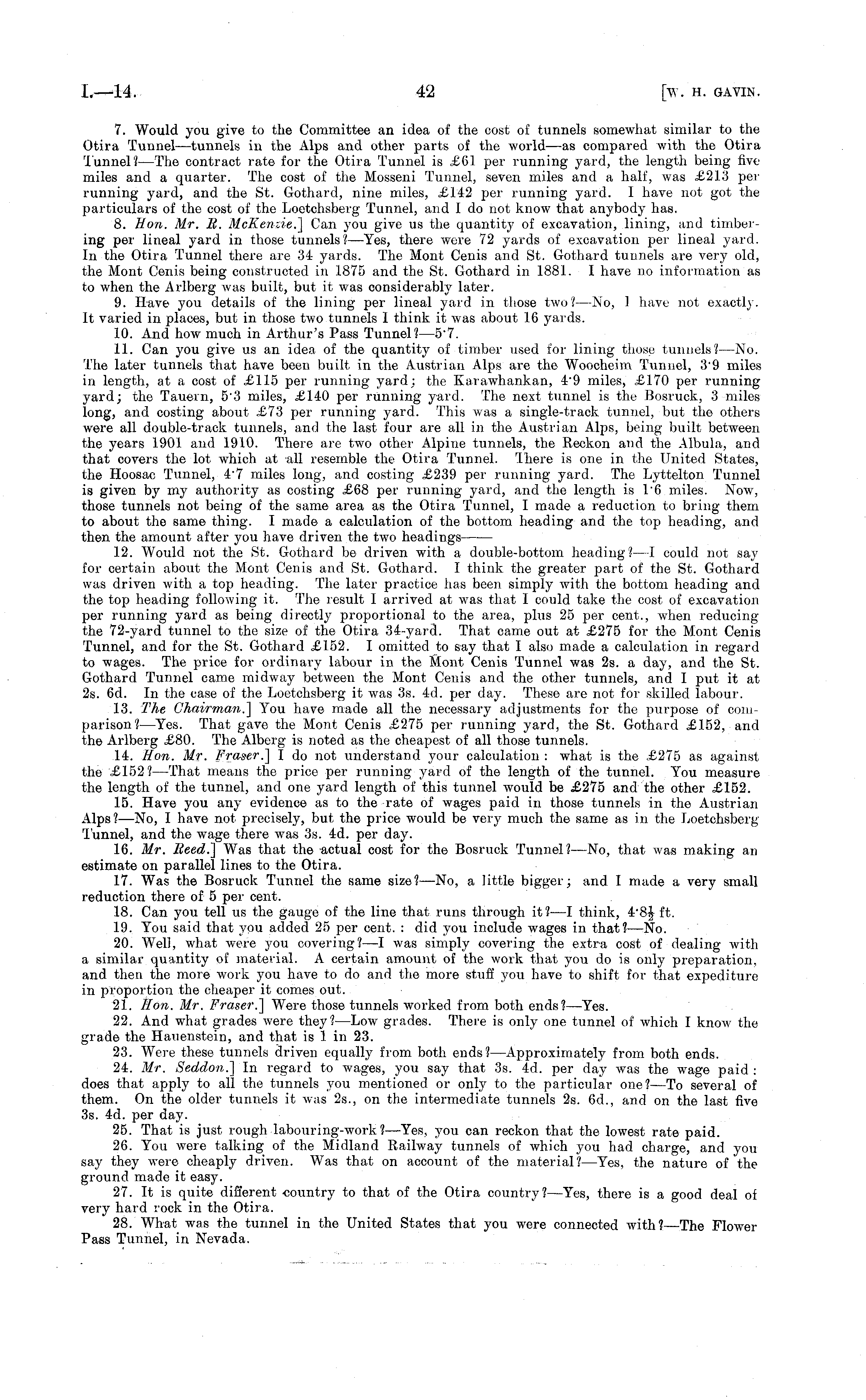 7. Would you give to the Committee an idea of the cost of tunnels somewhat similar to the Otira Tunnel —tunnels in the Alps and other parts of the world —as compared with the Otira Tunnel?— The contract rate for the Otira Tunnel is £61 per running yard, the length being five miles and a quarter. The cost of the Mosseni Tunnel, seven miles and a half, was £213 per running yard, and the St. Gothard, nine miles, £142 per running yard. I have not got the particulars of the cost of the Loetchsberg Tunnel, and I do not know that anybody has. 8. Hon. Mr. B. McKenrie.] Can you give us the quantity of excavation, lining, and timbering per lineal yard in those tunnels? —Yes, there were 72 yards of excavation per lineal yard. In the Otira Tunnel there are 34 yards. The Mont Cenis and St. Gothard tunnels are very old, the Mont Cenis being constructed in 1875 and the St. Gothard in 1881. I have no information as to when the Arlberg was built, but it was considerably later. 9. Have you details of the lining per lineal yard in those two? —No, J have not exactly. It varied in places, but in those two tunnels I think it was about 16 yards. 10. And how much in Arthur's Pass Tunnel? —5"7. 11. Can you give us an idea of the quantity of timber used for lining those tunnels? —No. The later tunnels that have been built in the Austrian Alps are the Woocheim Tunnel, 39 miles in length, at a cost of £115 per running yard; the Karawhankan, 49 miles, £170 per running yard; the Tauem, 53 miles, £140 per running yard. The next tunnel is the Bosruck, 3 miles long, and costing about £73 per running yard. This was a single-track tunnel, but the others were all double-track tunnels, and the last four are all in the Austrian Alps, being built between the years 1901 and 1910. There are two other Alpine tunnels, the Reckon and the Albula, and that covers the lot which at all resemble the Otira Tunnel. Ihere is one in the United States, the Hoosac Tunnel, 47 miles long, and costing £239 per running yard. The Lyttelton Tunnel is given by my authority as costing £68 per running yard, and the length is I' 6 miles. Now, those tunnels not being of the same area as the Otira Tunnel, I made a reduction to bring them to about the same thing. I made a calculation of the bottom heading and the top heading, and then the amount after you have driven the two headings 12. Would not the St. Gothard be driven with a double-bottom heading? —I could not say for certain about the Mont Cenis and St. Gothard. I think the greater part of the St. Gothard was driven with a top heading. The later practice has been simply with the bottom heading and the top heading following it. The result I arrived at was that I could take the cost of excavation per running yard as being directly proportional to the area, plus 25 per cent., when reducing the 72-yard tunnel to the size of the Otira 34-yard. That came out at £275 for the Mont Cenis Tunnel, and for the St. Gothard £152. I omitted to say that I also made a calculation in regard to wages. The price for ordinary labour in the Mont Cenis Tunnel was 2s. a day, and the St. Gothard Tunnel came midway between the Mont Cenis and the other tunnels, and I put it at 2s. 6d. In the case of the Loetchsberg it was 3s. 4d. per day. These are not for skilled labour. 13. The Chairman.] You have made all the necessary adjustments for the purpose of comparison'l—Yes. That gave the Mont Cenis £275 per running yard, the St. Gothard £152, and the Arlberg £80. The Alberg is noted as the cheapest of all those tunnels. 14. Hon. Mr. Fraser.] I do not understand your calculation : what is the £275 as against the £152?— That means the price per running yard of the length of the tunnel. You measure the length of the tunnel, and one yard length of this tunnel would be £275 and the other £152. 15. Have you any evidence as to the rate of wages paid in those tunnels in the Austrian Alps? —No, I have not precisely, but the price would be very much the same as in the Loetchsberg Tunnel, and the wage there was 3s. 4d. per day. 16. Mr. Heed.] Was that the actual cost for the Bosruck Tunnel? —No, that was making an estimate on parallel lines to the Otira. 17. Was the Bosruck Tunnel the same size? —No, a little bigger; and I made a very small reduction there of 5 per cent. 18. Can you tell us the gauge of the line that runs through it?—l think, 4 - 8£ ft. 19. You said that you added 25 per cent. : did you include wages in that? —No. 20. Well, what were you covering? —I was simply covering the extra cost of dealing with a similar quantity of material. A certain amount of the work that you do is only preparation, and then the more work you have to do and the more stuff you have to shift for that expediture in proportion the cheaper it comes out. 21. Hon. Mr. Fraser.] Were those tunnels worked from both ends? —Yes. 22. And what grades were they?— Low grades. There is only one tunnel of which I know the grade the Hauenstein, and that is 1 in 23. 23. Were these tunnels driven equally from both ends? —Approximately from both ends. 24. Mr. Seddon.] In regard to wages, you say that 3s. 4d. per day was the wage paid : does that apply to all the tunnels you mentioned or only to the particular one?—To several of them. On the older tunnels it was 25., on the intermediate tunnels 2s. 6d., and on the last five 3s. 4d. per day. 25. That is just rough labouring-work?— Yes, you can reckon that the lowest rate paid. 26. You were talking of the Midland Railway tunnels of which you had charge, and you say they were cheaply driven. Was that on account of the material?— Yes, the nature of the ground made it easy. 27. It is quite different country to that of the Otira country?— Yes, there is a good deal of very hard rock in the Otira. 28. What was the tunnel in the United States that you were connected with?— The Flower Pass Tunnel, in Nevada.