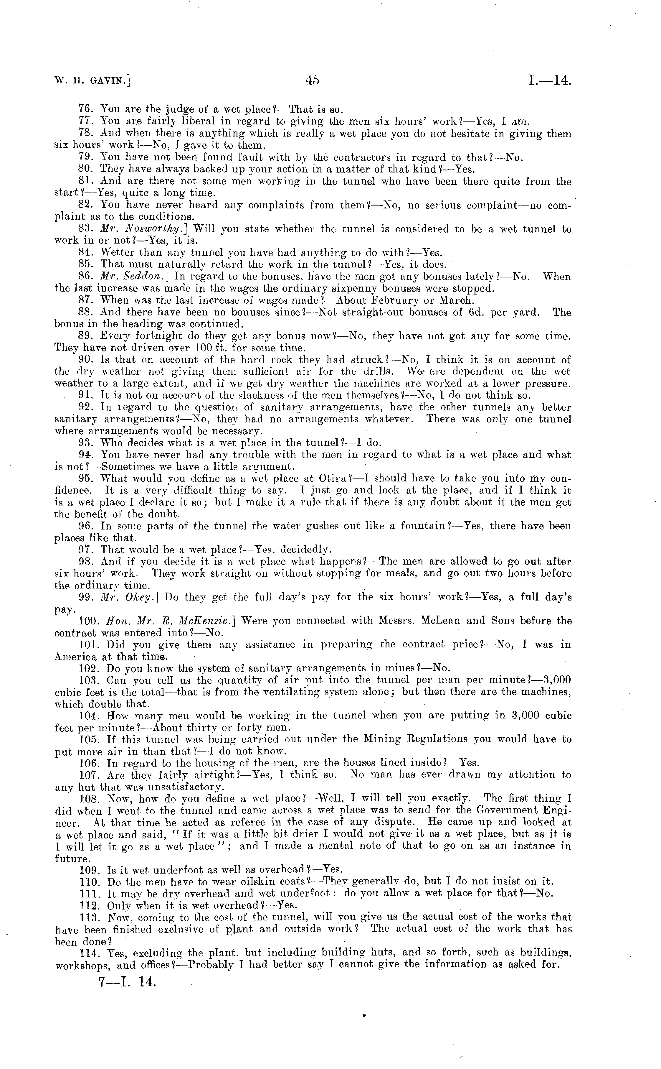 76. You are the judge of a wet place?— That is so. 77. You are fairly liberal in regard to giving the men six hours' work? —Yes, I am. 78. And when there is anything which is really a wet place you do not hesitate in giving them six hours' work ?—No, I gave it to them. 79. You have not been found fault with by the contractors in regard to that? —No. 80. They have always backed up your action in a matter of that kind ? —Yes. 81. And are there not some men working in the tunnel who have been there quite from the start? —Yes, quite a long time. 82. You have never heard any complaints from them? —No, no serious complaint—no complaint as to the conditions. 83. Mr. Nosworthy.] Will you state whether the tunnel is considered to be a wet tunnel to work in or not ?—Yes, it is. 84:. Wetter than any tunnel you have had anything to do with?— Yes. 85. That must naturally retard the work in the tunnel?— Yes, it does. 86. Mr. Seddon.] In regard to the bonuses, have the men got any bonuses lately?— No. When the last increase was made in the wages the ordinary sixpenny bonuses were stopped. 87. When was the last increase of wages made?— About February or March. 88. And there have been no bonuses since?— Not straight-out bonuses of 6d. per yard. The bonus in the heading was continued. 89. Every fortnight do they get any bonus now?—No, they have not got any for some time. They have not driven over 100 ft. for some time. 90. Is that on account of the hard rock they had struck?—No, I think it is on account of the dry weather not giving them .sufficient air for the drills. We» are dependent on the wet weather to a large extent, and if we get dry weather the machines are worked at a lower pressure. 91. It is not on account of the slackness of the men themselves?—No, I do not think so. 92. In regard to the question of sanitary arrangements, have the other tunnels any better sanitary arrangements? —No, they had no arrangements whatever. There was only one tunnel where arrangements would be necessary. 93. Who decides what is a wet place in the tunnel? —I do. 94. You have never had any trouble with the men in regard to what is a wet place and what is not? —Sometimes we have a little argument. 95. What would you define as a wet place at Otira? —I should have to take you into my confidence. It is a very difficult thing to say. I just go and look at the place, and if I think it is a wet place I declare it so; but T make it a rule that if there is any doubt aboiit it the men get the benefit of the doubt. 96. In some parts of the tunnel the water gushes out like a fountain?— Yes, there have been places like that. 97. That would be a wet place?— Yes, decidedly. 98. And if you decide it is a wet place what happens?— The men are allowed to go out after six hours' work. They work straight on without stopping for meals, and go out two hours before the ordinary time. 99. Mr. Okey.] Do they get the full day's pay for the six hours' work?— Yes, a full day's pay. 100. Hon. Mr. R. McKenzie.~\ Were you connected with Messrs. McLean and Sons before the contract was entered into? —No. 101. Did you give them any assistance in preparing the contract price?—No, I was in America at that time. 102. Do you know the system of sanitary arrangements in mines?— No. 103. Can you tell us the quantity of air put into the tunnel per man per minute? —3,000 cubic feet is the total —that is from the ventilating system alone; but then there are the machines, which double that. 104. How many men would be working in the tunnel when you are putting in 3,000 cubic feet per minute? —About thirty or forty men. 105. If this tunnel was being carried out under the Mining Regulations you would have to put more air in than that? —T do not know. 106. Tn regard to the housing of the men, are the houses lined inside? —Yes. 107. Are they fairly airtight?— Yes, I think so. No man has ever drawn my attention to any hut that was unsatisfactory. 108. Now, how do you define a wet place?— Well, I will tell you exactly. The first thing I did when I went to the tunnel and came across a wet place was to send for the Government Engineer. At that time he acted as referee in the case of any dispute. He came up and looked at a wet place and said, " If it was a little bit drier I would not give it as a wet place, but as it is I will let it go as a wet place " ; and I made a mental note of that to go on as an instance in future. 109. Is it wet underfoot as well as overhead? —Yes. 110. Do the men have to wear oilskin coats?- -They generally do, but I do not insist on it. 111. It may be dry overhead and wet underfoot: do you allow a wet place for that?— No. 112. Only when it is wet overhead? —Yes. 113. Now, coming to the cost of the tunnel, will you give us the actual cost of the works that have been finished exclusive of plant and outside work? —The actual cost of the work that has been done? 114. Yes, excluding the plant, but including building huts, and so forth, such as buildings, workshops, and offices ?—Probably I had better say I cannot give the information as asked for.
