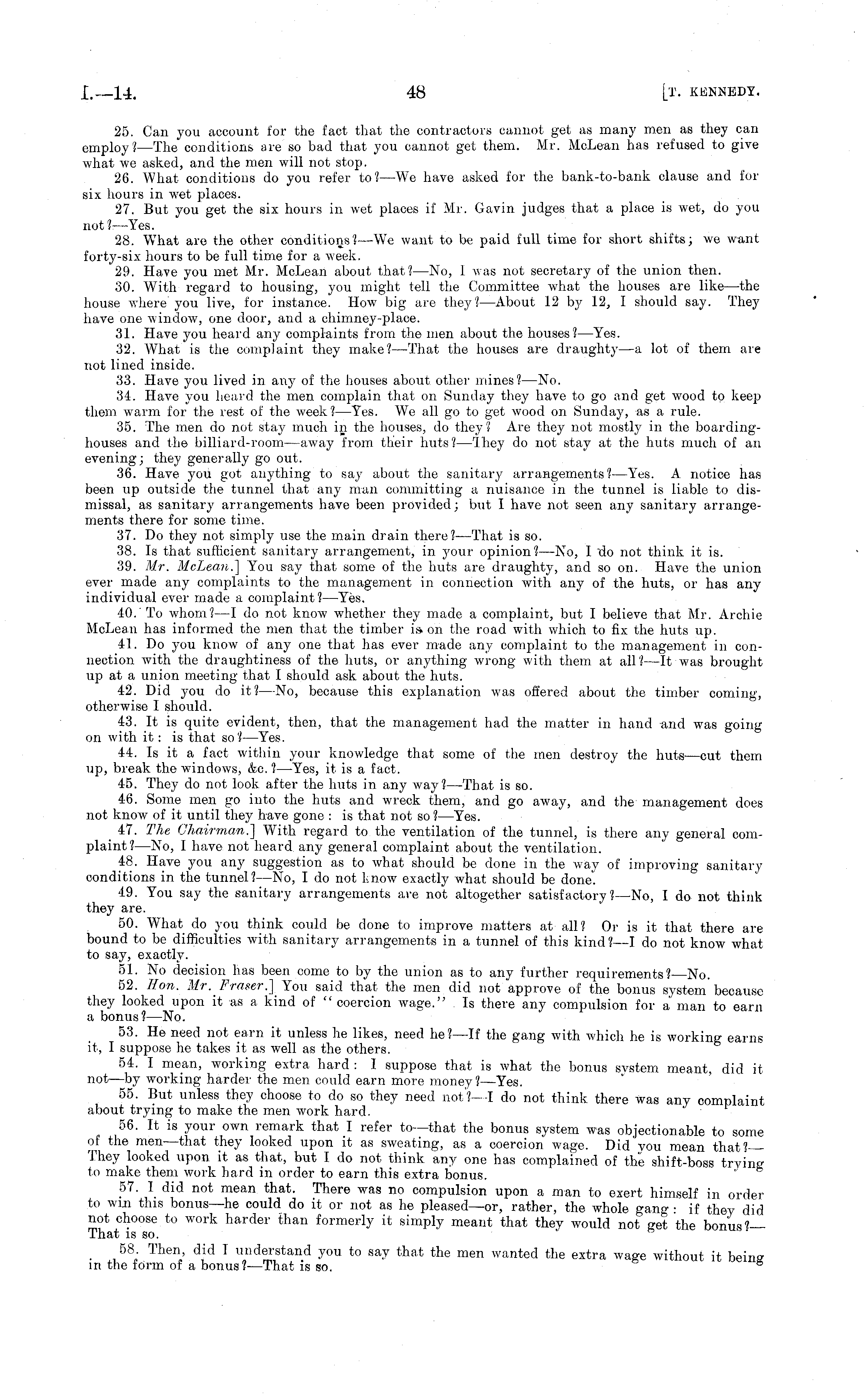 25. Can you account for the fact that the contractors cannot get as many men as they can employ? —The conditions are so bad that you cannot get them. Mr. McLean has refused to give what we asked, and the men will not stop. 26. What conditions do you refer to? —We have asked for the bank-to-bank clause and for six hours in wet places. 27. But you get the six hours in wet places if Mr. Gavin judges that a place is wet, do you not ? —Yes. 28. What are the other conditions?—We want to be paid full time for short shifts; we want forty-six hours to be full time for a week. 29. Have you met Mr. McLean about that? —No, 1 was not secretary of the union then. 30. With regard to housing, you might tell the Committee what the houses are like —the house where you live, for instance. How big are they? —About 12 by 12, I should say. They have one window, one door, and a chimney-place. 31. Have you heard any complaints from the men about the houses?— Yes. 32. What is the complaint they make?— That the houses are draughty—a lot of them are not lined inside. 33. Have you lived in any of the houses about other mines? —No. 34. Have you heard the men complain that on Sunday they have to go and get wood to keep them warm for the rest of the week? —Yes. We all go to get wood on Sunday, as a rule. 35. The men do not stay much in the houses, do they? Are they not mostly in the boardinghouses and the billiard-room —away from their huts ? —lhey do not stay at the huts much of an evening; they generally go out. 36. Have you got anything to say about the sanitary arrangements?— Yes. A notice has been up outside the tunnel that any man committing a nuisance in the tunnel is liable to dismissal, as sanitary arrangements have been provided; but I have not seen any sanitary arrangements there for some time. 37. Do they not simply use the main drain there?— That is so. 38. Is that sufficient sanitary arrangement, in your opinion?—No, I do not think it is. 39. Mr. McLean.] You say that some of the huts are draughty, and so on. Have the union ever made any complaints to the management in connection with any of the huts, or has any individual ever made a complaint?— Yes. 40.' To whom?—l do not know whether they made a complaint, but I believe that Mr. Archie McLean has informed the men that the timber is. on the road with which to fix the huts up. 41. Do you know of any one that has ever made any complaint to the management in connection with the draughtiness of the huts, or anything wrong with them at all?—It was brought up at a union meeting that I should ask about the huts. 42. Did you do it?—No, because this explanation was offered about the timber coming, otherwise I should. 43. It is quite evident, then, that the management had the matter in hand and was going on with it: is that so? —Yes. 44. Is it a fact within your knowledge that some of the men destroy the huts —cut them up, break the windows, &c. ?—Yes, it is a fact. 45. They do not look after the huts in any way? —That is so. 46. Some men go into the huts and wreck them, and go away, and the management does not know of it until they have gone : is that not so ?—Yes. 47. The Chairman.] With regard to the ventilation of the tunnel, is there any general complaint?—No, I have not heard any general complaint about the ventilation. 48. Have you any suggestion as to what should be done in the way of improving sanitary conditions in the tunnel? —No, I do not know exactly what should be done". 49. You say the sanitary arrangements are not altogether satisfactory?—No, I do not think they are. 50. What do you think could be done to improve matters at all? Or is it that there are bound to be difficulties with sanitary arrangements in a tunnel of this kind?—l do not know what to say, exactly. 51. No decision has been come to by the union as to any further requirements?— No. 52. Hon. Mr. Fraser.] You said that the men did not approve of the bonus system because they looked upon it as a kind of "coercion wage." Is there any compulsion for a man to earn a bonus? —No. 53. He need not earn it unless he likes, need he? —If the gang with which he is working earns it, I suppose he takes it as well as the others. 54. I mean, working extra hard : I suppose that is what the bonus system meant, did it not—by working harder the men could earn more money?— Yes. 55. But unless they choose to do so they need not'?--I do not think there was any complaint about trying to make the men work hard. 56. It is your own remark that I refer to—that the bonus system was objectionable to some of the men—that they looked upon it as sweating, as a coercion wage. Did you mean that? They looked upon it as that, but I do not think any one has complained of the shift-boss trying to make them work hard in order to earn this extra bonus. 57. I did not mean that. There was no compulsion upon a man to exert himself in order to wui this bonus—he could do it or not as he pleased—or, rather, the whole gang •if they did not choose to work harder than formerly it simply meant that they would not get the bonus ?— That is so. 58. Then, did I understand you to say that the men wanted the extra wage without it beine in the form of a bonus I —That is so. s
