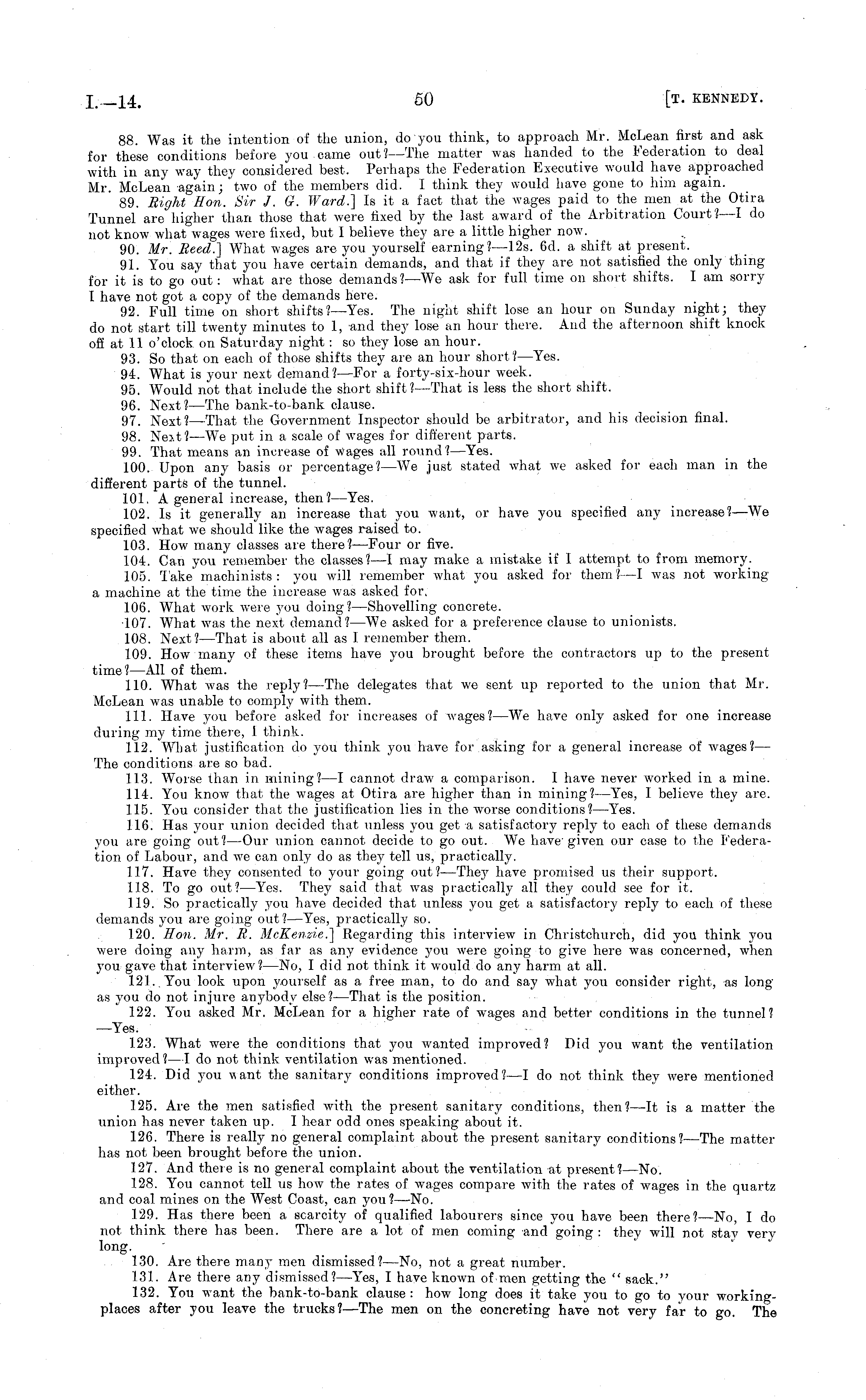88. Was it the intention of the union, do you think, to approach Mr. McLean first and ask for these conditions before you came out? —The matter was handed to the Federation to deal with in any way they considered best. Perhaps the Federation Executive would have approached Mr. McLean again; "two of the members did. I think they would have gone to him again. 89. Bight Hon. Sir J. G. Ward.] Is it a fact that the wages paid to the men at the Otira Tunnel are higher than those that were fixed by the last award of the Arbitration Court? —I do not know what wages were fixed, but I believe they are a little higher now. 90. Mr. Reed.] What wages are you yourself earning?—l2s. 6d. a shift at present. 91. You say that you have certain demands, and that if they are not satisfied the only thing for it is to go out: what are those demands? —We ask for full time on short shifts. lam sorry I have not got a copy of the demands here. 92. Full time on short shifts? —Yes. The night shift lose an hour on Sunday night; they do not start till twenty minutes to 1, and they lose an hour there. And the afternoon shift knock off at 11 o'clock on Saturday night: so they lose an hour. 93. So that on each of those shifts they are an hour short? —Yes. 94. What is your next demand? —For a forty-six-hour week. 95. Would not that include the short shift? —That is less the short shift. 96. Next? —The bank-to-bank clause. 97. Next? —That the Government Inspector should be arbitrator, and his decision final. 98. Next? —We put in a scale of wages for different parts. 99. That means an increase of wages all round? —Yes. 100. Upon any basis or percentage?—We just stated what we asked for each man in the different parts of the tunnel. 101. A general increase, then? —Yes. 102. Is it generally an increase that you want, or have you specified any increase? —We specified what we should like the wages raised to. 103. How many classes are there?— Four or five. 104. Can you remember the classes?—l may make a mistake if I attempt to from memory. 105. Take machinists: you will remember what you asked for them? —I was not working a machine at the time the increase was asked for. 106. What work were you doing? —Shovelling concrete. 107. What was the next demand? —We asked for a preference clause to unionists. 108. Next? —That is about all as I remember them. 109. How many of these items have you brought before the contractors up to the present time? —All of them. 110. What was the reply? —The delegates that we sent up reported to the union that Mr. McLean was unable to comply with them. 111. Have you before asked for increases of wages? —We have only asked for one increase during my time there, I think. 112. What justification do you think you have for asking for a general increase of wages? — The conditions are so bad. 113. Worse ihan in mining? —I cannot draw a comparison. I have never worked in a mine. 114. You know that the wages at Otira are higher than in mining?— Yes, I believe they are. 115. You consider that the justification lies in the worse conditions? —Yes. 116. Has your union decided that unless yovi get a satisfactory reply to each of these demands you are going out? —Our union cannot decide to go out. We have , given our case to the Federation of Labour, and we can only do as they tell us, practically. 117. Have they consented to your going out?— The } ,' have promised us their support. 118. To go out? —Yes. They said that was practically all they could see for it. 119. So practically } r ou have decided that unless you get a satisfactory reply to each of these demands you are going out?— Yes, practically so. 120. Hon. Mr. R. McKenzte.] Regarding this interview in Christchurch, did you think you were doing any harm, as far as any evidence you were going to give here was concerned, when you gave that interview?—No, I did not think it would do any harm at all. 121.. You look upon yourself as a free man, to do and say what you consider right, as long as you do not injure an} r body else?— That is the position. 122. You asked Mr. McLean for a higher rate of wages and better conditions in the tunnel? —Yes. 123. What were the conditions that you wanted improved? Did you want the ventilation improved?—l do not think ventilation was mentioned. 124. Did you want the sanitary conditions improved?—l do not think they were mentioned either. 125. Are the men satisfied with the present sanitary conditions, then?—lt is a matter the union has never taken up. I hear odd ones speaking about it. 126. There is really no general complaint about the present sanitary conditions? —The matter has not been brought before the union. 127. And there is no general complaint about the ventilation at present?— No. 128. You cannot tell us how the rates of wages compare with the rates of wages in the quartz and coal mines on the West Coast, can you?— No. 129. Has there been a scarcity of qualified labourers since you have been there? —No, I do not think there has been. There are a lot of men coming and going : they will not stay very long. 130. Are there many men dismissed? —No, not a great number. 131. Are there any dismissed? —Yes, I have known of men getting the " sack." 132. You want the bank-to-bank clause : how long does it take you to go to your workingplaces after you leave the trucks?— The men on the concreting have not very far to go. The