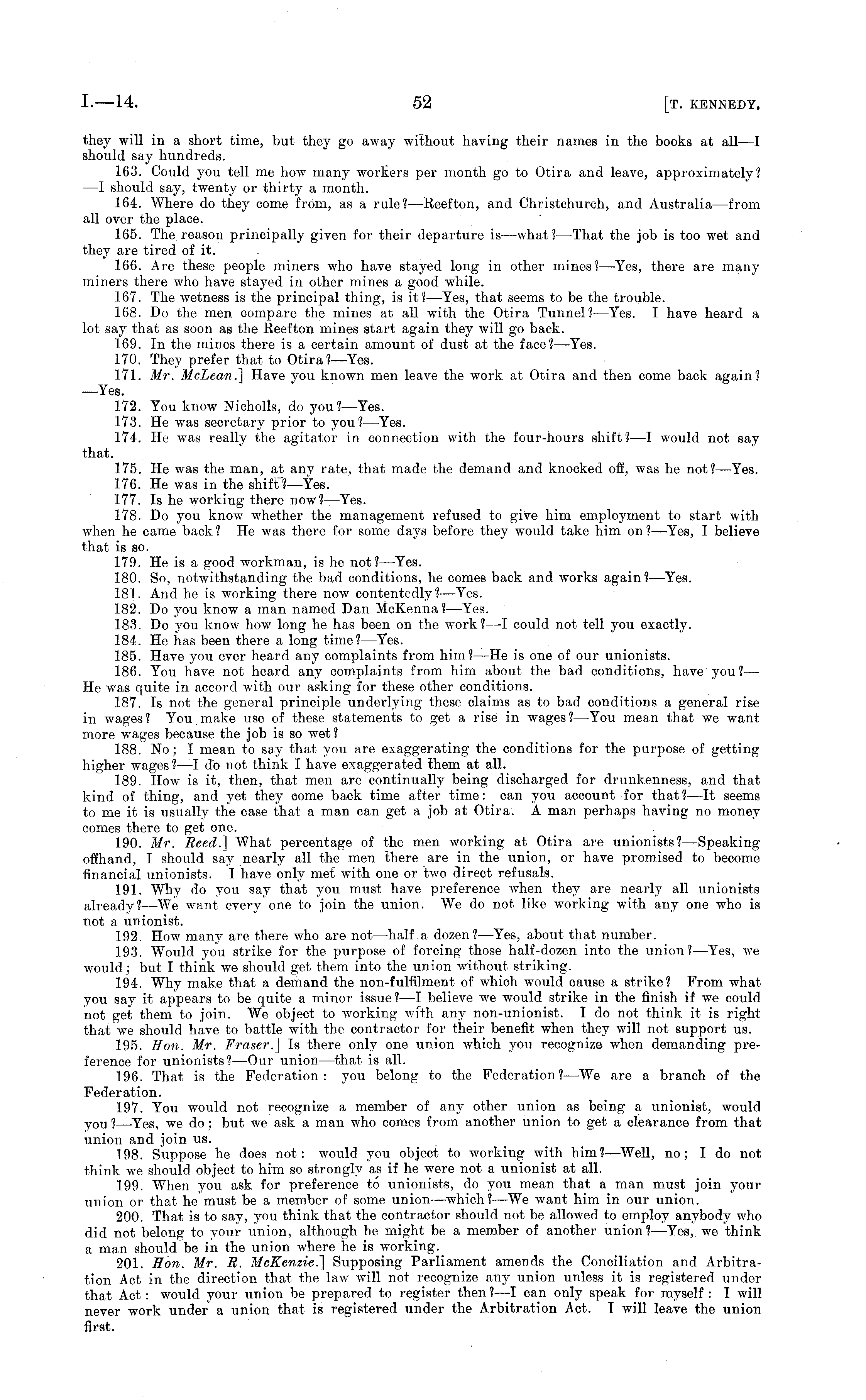 they will in a short time, but they go away without having their names in the books at all—l should say hundreds. 163. Could you tell me how many workers per month go to Otira and leave, approximately? —I should say, twenty or thirty a month. 164. Where do they come from, as a rule? —Reefton, and Christchurch, and Australia —from all over the place. 165. The reason principally given for their departure is—what? — That the job is too wet and they are tired of it. 166. Are these people miners who have stayed long in other mines?— Yes, there are many miners there who have stayed in other mines a good while. 167. The wetness is the principal thing, is it? —Yes, that seems to be the trouble. 168. Do the men compare the mines at all with the Otira Tunnel? —Yes. I have heard a lot say that as soon as the Reefton mines start again they will go back. 169. In the mines there is a certain amount of dust at the face? —Yes. 170. They prefer that to Otira? —Yes. 171. Mr. McLean.] Have you known men leave the work at Otira and then come back again? —Yes. 172. You know Nicholls, do you?— Yes. 173. He was secretary prior to you? —Yes. 174. He was really the agitator in connection with the four-hours shift? —I would not say that. 175. He was the man, at any rate, that made the demand and knocked off, was he not? —Yes. 176. He was in the shift?— Yes. 177. Is he working there now?— Yes. 178. Do you know whether the management refused to give him employment to start with when he came back? He was there for some days before they would take him on? —Yes, I believe that is so. 179. He is a good workman, is he not? —Yes. 180. So, notwithstanding the bad conditions, he comes back and works again?— Yes. 181. And he is working there now contentedly?— Yes. 182. Do you know a man named Dan McKenna? —Yes. 183. Do you know how long he has been on the work? —I could not tell you exactly. 184. He has been there a long time? —Yes. 185. Have you ever heard any complaints from him? —He is one of our unionists. 186. You have not heard any complaints from him about the bad conditions, have you?— He was quite in accord with our asking for these other conditions. 187. Is not the general principle underlying these claims as to bad conditions a general rise in wages? You make use of these statements to get a rise in wages? —You mean that we want more wages because the job is so wet? 188. No; I mean to say that you. are exaggerating the conditions for the purpose of getting higher wages? —I do not think I have exaggerated them at all. 189. How is it, then, that men are continually being discharged for drunkenness, and that kind of thing, and yet they come back time after time: can you account for that? —It seems to me it is usually the case that a man can get a job at Otira. A man perhaps having no money comes there to get one. 190. Mr. Reed.] What percentage of the men working at Otira are unionists? —Speaking offhand, I should say nearly all the men there are in the union, or have promised to become financial unionists. I have only met with one or two direct refusals. 191. Why do you say that you must have preference when they are nearly all unionists already?—We want every one to join the union. We do not like working with any one who is not a unionist. 192. How many are there who are not —half a dozen? —Yes, about that number. 193. Would you strike for the purpose of forcing those half-dozen into the union? —Yes, we would; but I think we should get them into the union without striking. 194. Why make that a demand the non-fulfilment of which would cause a strike? From what you say it appears to be quite a minor issue? —I believe we would strike in the finish if we could not get them to join. We object to working with any non-unionist. I do not think it is right that we should have to battle with the contractor for their benefit when they will not support us. 195. Hon. Mr. Fraser.\ Is there only one union which you recognize when demanding preference for unionists? —Our union—that is all. 196. That is the Federation: you belong to the Federation? —We are a branch of the Federation. 197. You would not recognize a member of any other union as being a unionist, would y OU I —Yes, we do; but we ask a man who comes from another union to get a clearance from that union and join us. 198. Suppose he does not: would you object to working with him? —Well, no; I do not think we should object to him so strongly as if he were not a unionist at all. 199. When you ask for preference to unionists, do you mean that a man must join your union or that he must be a member of some union—which? —We want him in our union. 200. That is to say, you think that the contractor should not be allowed to employ anybody who did not belong to your union, although he might be a member of another union? —Yes, we think a man should be in the union where he is working. 201. Hon. Mr. E. McKenzie.] Supposing Parliament amends the Conciliation and Arbitration Act in the direction that the law will not recognize any union unless it is registered under that Act : would your union be prepared to register then ? —I can only speak for myself : I will never work under a union that is registered under the Arbitration Act. I will leave the union first.
