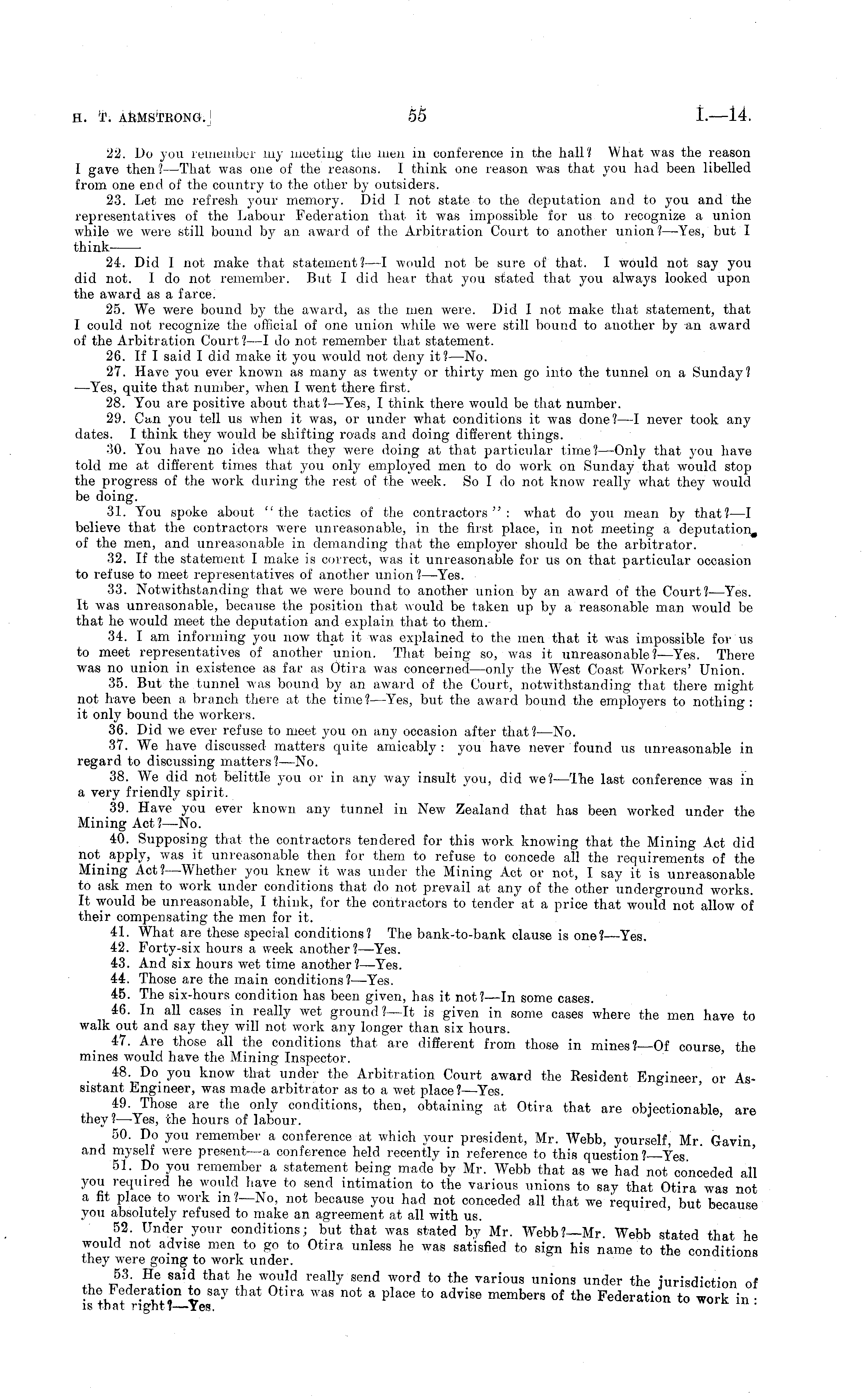 22. Do you remember my meeting the men in conference in the hall? What was the reason I gave then? —That was one of the reasons. I think one reason was that you had been libelled from one end of the country to the other by outsiders. 23. Let me refresh your memory. Did I not state to the deputation and to you and the representatives of the Labour Federation that it was impossible for us to recognize a union while we were still bound by an award of the Arbitration Court to another union? —Yes, but I think 24. Did I not make that statement? —I would not be sure of that. I would not say you did not. 1 do not remember. But I did hear that you stated that you always looked upon the award as a farce. 25. We were bound by the award, as the men were. Did I not make that statement, that I could not recognize the official of one union while we were still bound to another by an award of the Arbitration Court ? —I do not remember that statement. 26. If I said I did make it you would not deny it?— No. 27. Have you ever known as many as twenty or thirty men go into the tunnel on a Sunday? —Yes, quite that number, when I went there first. 28. You are positive about that? —Yes, I think there would be that number. 29. Can you tell us when it was, or under what conditions it was done?—l never took any dates. I think they would be shifting roads and doing different things. 30. You have no idea what they were doing at that particular time? —Only that you have told me at different times that you only employed men to do work on Sunday that would stop the progress of the work during the rest of the week. So I do not know really what they would be doing. 31. You spoke about "the tactics of the contractors": what do you mean by that? —I believe that the contractors were unreasonable, in the first place, in not meeting a deputation, of the men, and unreasonable in demanding that the employer should be the arbitrator. 32. If the statement I make is correct, was it unreasonable for us on that particular occasion to refuse to meet representatives of another union? —Yes. 33. Notwithstanding that we were bound to another union by an award of the Court?— Yes. It was unreasonable, because the position that would be taken up by a reasonable man would be that he would meet the deputation and explain that to them. 34. I am informing you now that it was explained to the men that it was impossible for us to meet representatives of another union. That being so, was it unreasonable? —Yes. There was no union in existence as far as Otira was concerned —only the West Coast Workers' Union. 35. But the tunnel was bound by an award of the Court, notwithstanding that there might not have been a branch there at the time? —Yes, but the award bound the employers to nothing: it only bound the workers. 36. Did we ever refuse to meet you on any occasion after that?— No. 37. We have discussed matters quite amicably : you have never found us unreasonable in regard to discussing matters?— No. 38. We did not belittle you or in any way insult you, did we?— r lhe last conference was in a very friendly spirit. 39. Have you ever known any tunnel in New Zealand that has been worked under the Mining Act?— No. 40. Supposing that the contractors tendered for this work knowing that the Mining Act did not apply, was it unreasonable then for them to refuse to concede all the requirements of the Mining Act?— Whether you knew it was under the Mining Act or not, I say it is unreasonable to ask men to work under conditions that do not prevail at any of the other underground works. It would be unreasonable, I think, for the contractors to tender at a price that would not allow of their compensating the men for it. 41. What are these special conditions? The bank-to-bank clause is one?— Yes. 42. Forty-six hours a week another I —Yes. 43. And six hours wet time another? —Yes. 44. Those are the main conditions?— Yes. 45. The six-hours condition has been given, has it not?—ln some cases. 46. In all cases in really wet ground?—lt is given in some cases where the men have to walk out and say they will not work any longer than six hours. 47. Are those all the conditions that are different from those in mines?—Of course the mines would have the Mining Inspector. 48. Do you know that under the Arbitration Court award the Resident Engineer, or Assistant Engineer, was made arbitrator as to a wet place?— Yes. 49. Those are the only conditions, then, obtaining at Otira that are objectionable are they?— Yes, the hours of labour. 50. Do you remember a conference at which your president, Mr. Webb, yourself, Mr. Gavin and myself were present —a conference held recently in reference to this question ? Yes 51. Do you remember a statement being made by Mr. Webb that as we had not conceded all you required he would have to send intimation to the various unions to say that Otira was not a fit place to work in ?-—No, not because you had not conceded all that we required but because you absolutely refused to make an agreement at all with us. 52. Under yonr conditions; but that was stated by Mr. Webb?—Mr. Webb stated that he would not advise men to go to Otira unless he was satisfied to sign his name to the conditions they w-ere going to work under. 4.x. t^ 3 j H( r. Baid that w ° uld reall y send word to the various unions under the jurisdiction of the *ederation to say that Otira was not a place to advise members of the Federation to work in : IS TriflX T'lffnT * ■"• Y6B.