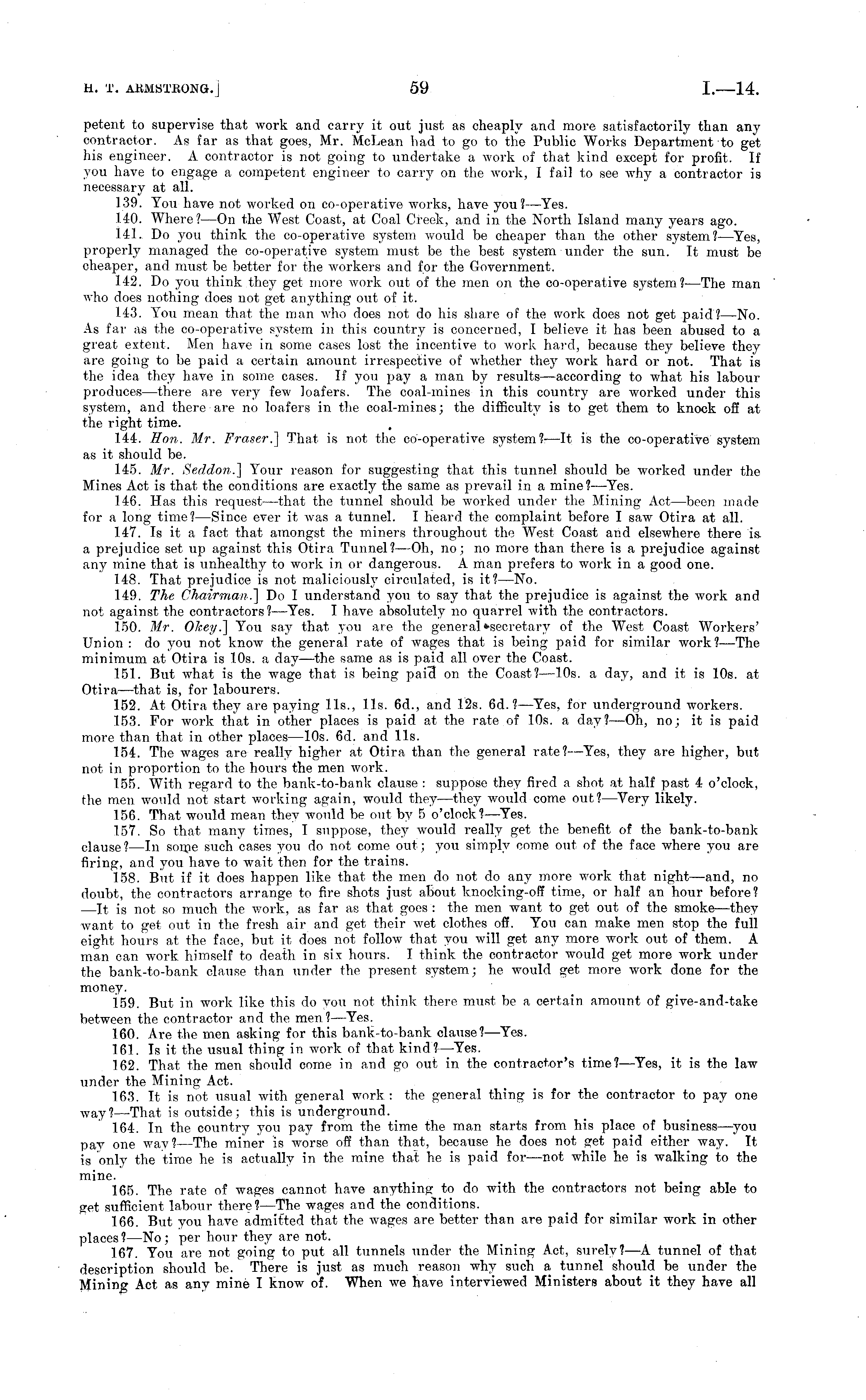 petent to supervise that work and carry it out just as cheaply and more satisfactorily than any contractor. As far as that goes, Mr. McLean had to go to the Public Works Department to get his engineer. A contractor is not going to undertake a work of that kind except for profit. If you have to engage a competent engineer to carry on the work, I fail to see why a contractor is necessary at all. 139. You have not worked on co-operative works, have you? —Yes. 140. Where?—On the West Coast, at Coal Creek, and in the North Island many years ago. 141. Do you think the co-operative system would be cheaper than the other system?— Yes, properly managed the co-operative system must be the best system under the sun. It must be cheaper, and must be better for the workers and for the Government. 142. Do you think they get more work out of the men on the co-operative system?— The man who does nothing does not get anything out of it. 143. You mean that the man who does not do his share of the work does not get paid?— No. As far as the co-operative s}'stem in this country is concerned, I believe it has been abused to a great extent. Men have in some cases lost the incentive to work hard, because they believe they are going to be paid a certain amount irrespective of whether they work hard or not. That is the idea they have in some cases. If you pay a man by results—according to what his labour produces—there are very few loafers. The coal-mines in this country are worked under this system, and there are no loafers in the coal-mines; the difficulty is to get them to knock off at the right time. 144. Hon. Mr. Fraser.] That is not the co-operative system? —It is the co-operative system as it should be. 145. Mr. Seddon.] Your reason for suggesting that this tunnel should be worked under the Mines Act is that the conditions are exactly the same as prevail in a mine? —Yes. 146. Has this request —that the tunnel should be worked under the Mining Act —been made for a long time?— Since ever it was a tunnel. I heard the complaint before I saw Otira at all. 147. Is it a fact that amongst the miners throughout the West Coast and elsewhere there is. a prejudice set up against this Otira Tunnel? —Oh, no; no more than there is a prejudice against any mine that is unhealthy to work in or dangerous. A man prefers to work in a good one. 148. That prejudice is not maliciously circulated, is it? —No. 149. The Chairman.'] Do I understand you to say that the prejudice is against the work and not against the contractors? —Yes. I have absolutely no quarrel with the contractors. 150. Mr. Okey.~\ You say that you are the general of the West Coast Workers' Union :do you not know the general rate of wages that is being paid for similar work?— The minimum at Otira is 10s. a day—the same as is paid all over the Coast. 151. But what is the wage that is being paict on the Coast?—los. a day, and it is 10s. at Otira —that is, for labourers. 152. At Otira they are paying 11s., 11s. 6d., and 12s. 6d. ?—Yes, for underground workers. 153. For work that in other places is paid at the rate of 10s. a day?—Oh, no; it is paid more than that in other places—los. 6d. and 11s. 154. The wages are really higher at Otira than the general rate? —Yes, they are higher, but not in proportion to the hours the men work. 155. With regard to the bank-to-bank clause : suppose they fired a shot at half past 4 o'clock, the men would not start working again, would they—they would come out? —Very likely. 156. That would mean they would be out by 5 o'clock?— Yes. 157. So that many times, I suppose, they would really get the benefit of the bank-to-bank clause? —In some such cases you do not come out; you simply come out of the face where you are firing, and you have to wait then for the trains. 158. But if it does happen like that the men do not do any more work that night—and, no doubt, the contractors arrange to fire shots just about knocking-off time, or half an hour before? —It is not so much the work, as far as; that goes : the men want to get out of the smoke—they want to get out in the fresh air and get their wet clothes off. You can make men stop the full eight hours at the face, but it does not follow that you will get any more work out of them. A man can work himself to death in six hours. I think the contractor would get more work under the bank-to-bank clause than under the present system; he would get more work done for the money. 159. But in work like this do you not think there must be a certain amount of give-and-take between the contractor and the men? —-Yes. 160. Are the men asking for this bank-to-bank clause? —Yes. 161. Is it the usual thing in work of that kind? —Yes. 162. That the men should come in and go out in the contractor's time? —Yes, it is the law under the Mining Act. 163. It is not usual with general work : the general thing is for the contractor to pay one way?— That is outside; this is underground. 164. In the country you pay from the time the man starts from his place of business—you pay one way?— The miner is worse off than that, because he does not get paid either way. It is only the time he is actually in the mine that he is paid for —not while he is walking to the mine. 165. The rate of wages cannot have anything to do with the contractors not being able to get sufficient labour there? —The wages and the conditions. 166. But you have admitted that the wages are better than are paid for similar work in other places? —No; per hour they are not. 167. You are not going to put all tunnels under the Mining Act, surely?—A tunnel of that description should be. There is just as much reason why such a tunnel should be under the Mining Act as any mine I know of. When we have interviewed Ministers about it they have all