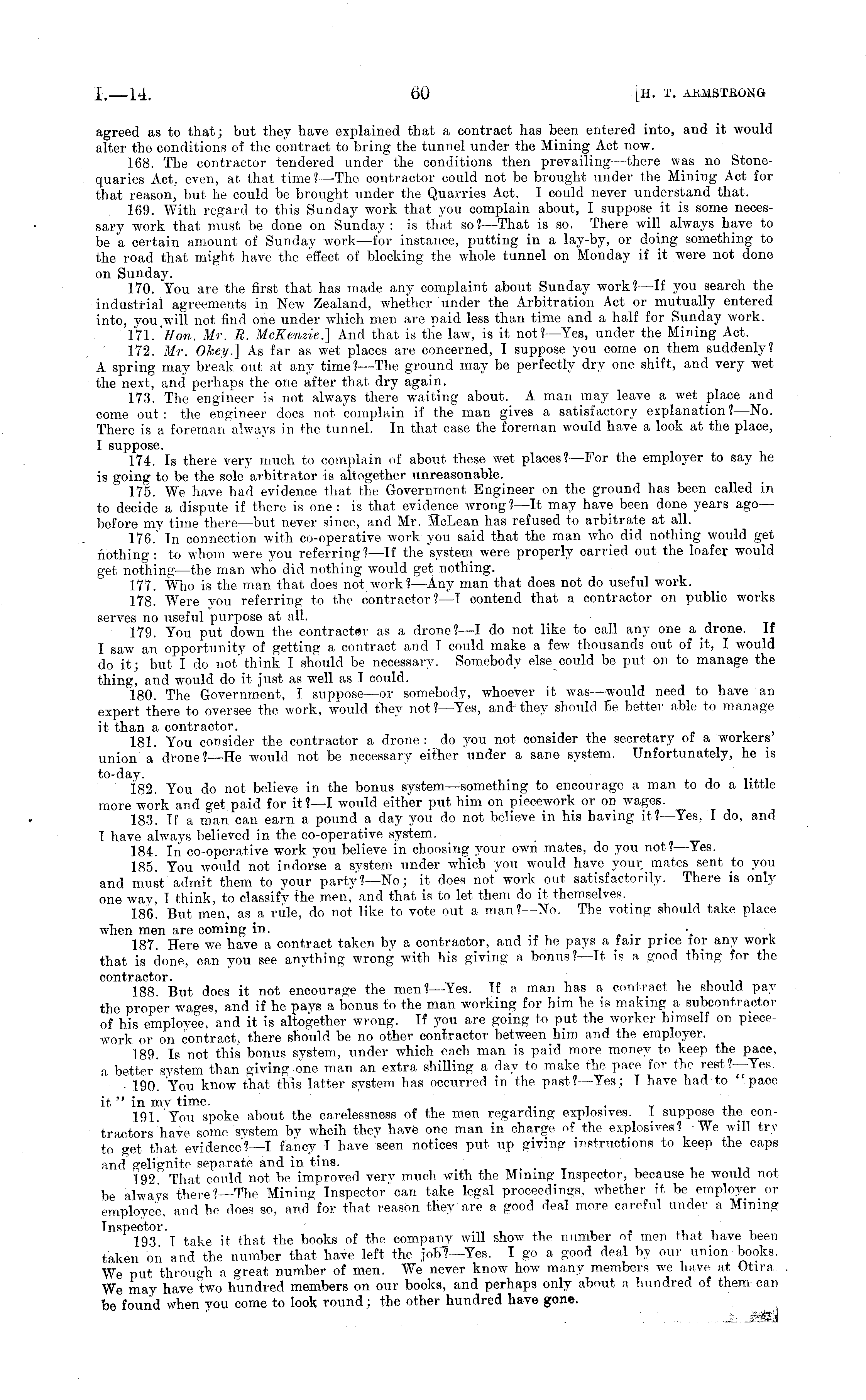 agreed as to that; but they have explained that a contract has been entered into, and it would alter the conditions of the contract to bring the tunnel under the Mining Act now. 168. The contractor tendered under the conditions then prevailing —there was no Stonequaries Act. even, at that time? —The contractor could not be brought under the Mining Act for that reason, but he could be brought under the Quarries Act. I could never understand that. 169. With regard to this Sunday work that you complain about, I suppose it is some necessary work that must be done on Sunday: is that so?— That is so. There will always have to be a certain amount of Sunday work —for instance, putting in a lay-by, or doing something to the road that might have the effect of blocking the whole tunnel on Monday if it were not done on Sunday. 170. You are the first that has made any complaint about Sunday work? —If you search the industrial agreements in New Zealand, whether under the Arbitration Act or mutually entered into, you will not find one under which men are paid less than time and a half for Sunday work. 171. Hon. Mr. R. McEenzie.] And that is the law, is it not? —Yes, under the Mining Act. 172. Mr. Ohey.'\ As far as wet places are concerned, I suppose you come on them suddenly? A spring may break out at any time? —The ground may be perfectly dry one shift, and very wet the next, and perhaps the one after that dry again. 173. The engineer is not always there waiting about. A man may leave a wet place and come out: the engineer does not complain if the man gives a satisfactory explanation?— No. There is a foreman always in the tunnel. In that case the foreman would have a look at the place, I suppose. 174. Is there very much to complain of about these wet places? —For the employer to say he is going to be the sole arbitrator is altogether unreasonable. 175. We have had evidence that the Government Engineer on the ground has been called in to decide a dispute if there is one :is that evidence wrong? —It may have been done years ago— before my time there —but never since, and Mr. McLean has refused to arbitrate at all. 176. In connection with co-operative work you said that the man who did nothing would get nothing :to whom were you referring? —If the system were properly carried out the loafer would get nothing—the man who did nothing would get nothing. 177. Who is the man that does not work? —Any man that does not do useful work. 178. Were you referring to the contractor? —T contend that a contractor on public works serves no useful purpose at all. 179. You put down the contracter as a drone?—l do not like to call any one a drone. If I saw an opportunity of getting a contract and I could make a few thousands out of it, I would do it; but I do not'think I should be necessary. Somebody else could be put on to manage the thing, and would do it just as well as I could. 180. The Government, I suppose —or somebody, whoever it was —would need to have an expert there to oversee the work, would they not? —Yes, and they should Be better able to manage it than a contractor. 181. You consider the contractor a drone: do you not consider the secretary of a workers union a drone? —He would not be necessary either under a sane system. Unfortunately, he is to-day. 182. You do not believe in the bonus system —something to encourage a man to do a little more work, and get paid for it?—l would either put him on piecework or on wages. 183. If a man can earn a pound a day you do not believe in his having it?— Yes, I do, and I have always believed in the co-operative system. 184. In co-operative work you believe in choosing your own mates, do you not? —Yes. 185. You would not indorse a system under which you would have your mates sent to you and must admit, them to your party ?—No; it does not" work out satisfactorily. There is only one way, I think, to classify the men, and that is to let them do it themselves. 186. But men, as a rule, do not like to vote out a man?— No. The voting should take place when men are coming in. . ' . • 187. Here we have a contract taken by a contractor, and if he pays a fair price for any work that is done, can you see anything wrong with his giving a bonus? —Tt is a good thing for the contractor. . 188. But does it not encourage the men?— Yes. If a man has a contract he should pay the proper wages, and if he pays a bonus to the man working for him he is making a subcontractor of his employee, and it is altogether wrong. If you are going to put the worker himself on piecework or on contract, there should be no other contractor between him and the employer. 189. Is not this bonus system, under which each man is paid more money to keep the pace, a better system than giving one man an extra shilling a day to make the pace for the rest?— Yes. ■ 190. You know that this latter system has occurred in the past? —Yes; T have had to "pace it "in my time. . . 191. You spoke about the carelessness of the men regarding explosives. I suppose the contractors have some system by wheih they have one man in charge of the explosives? We will try to get that evidence? —I fancy I have seen notices put up giving instructions to keep the caps and gelignite separate and in tins. __ 192 That could not be improved very much with the Mining Inspector, because he would not be always there?— The Mining Inspector' can take legal proceedings, whether it be employer or employee, and he does so, and for that reason they are a good deal more careful under a Mining 193 I take it that the books of the company will show the number of men that have been taken on and the number that have left the jobl—Yes. I go a good deal by our union books. We put through a great number of men. We never know how many members we have at Otira We may have two hundred members on our books, and perhaps only about a hundred of them can be found when you come to look round; the other hun