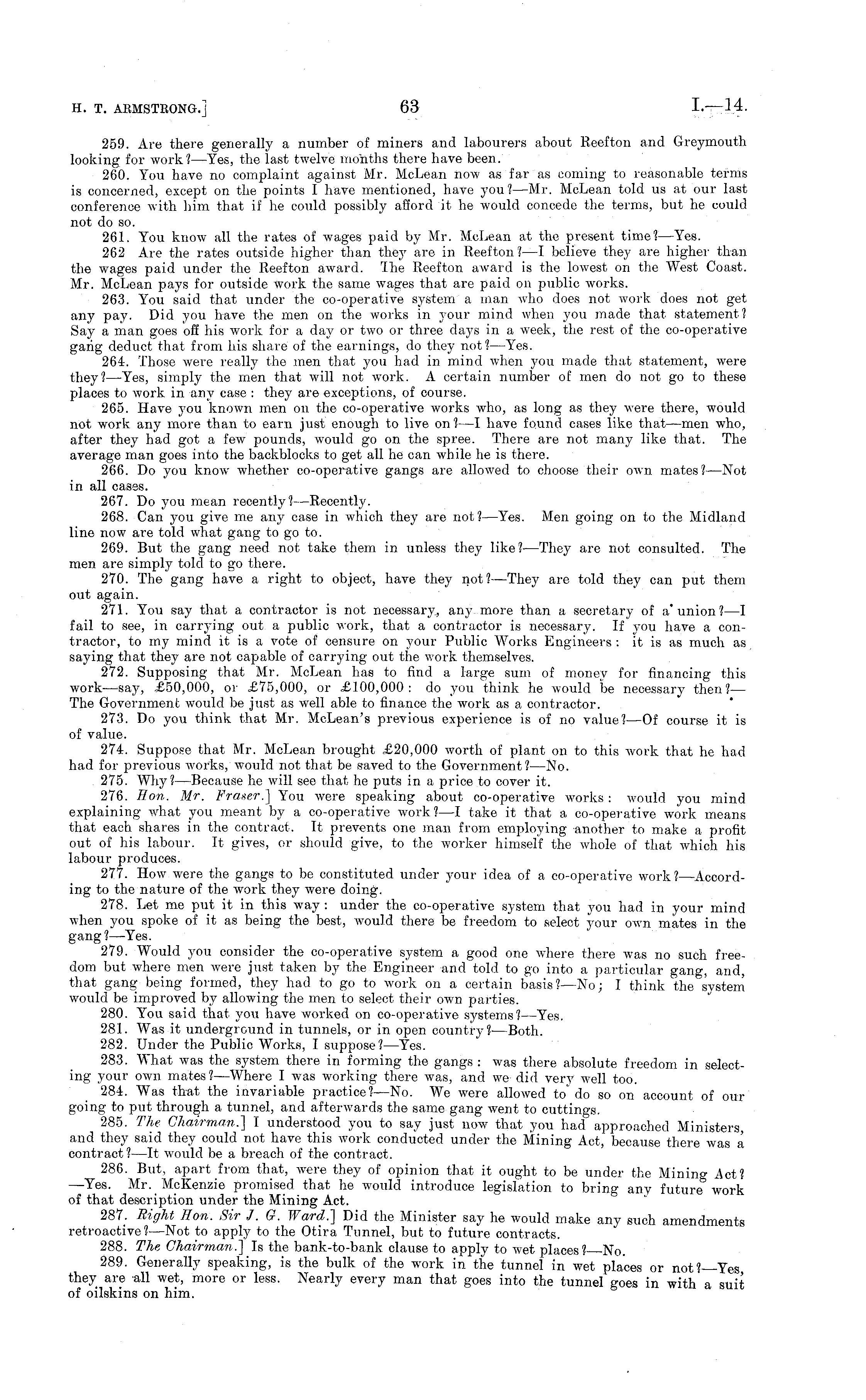 259. Are there generally a number of miners and labourers about Reef ton and Greymouth looking for work?— Yes, the last twelve months there have been. 260. You have no complaint against Mr. McLean now as far as coming to reasonable terms is concerned, except on the points I have mentioned, have you? —Mr. McLean told us at our last conference with him that if he could possibly afford it he would concede the terms, but he could not do so. 261. You know all the rates of wages paid by Mr. McLean at the present time? —Yes. 262 Are the rates outside higher than they are in Reefton?—l believe they are higher than the wages paid under the Reefton award. The Reefton award is the lowest on the West Coast. Mr. McLean pays for outside work the same wages that are paid on public works. 263. You said that under the co-operative a man who does not work does not get any pay. Did you have the men on the works in your mind when you made that statement? Say a man goes off his work for a day or two or three days in a week, the rest of the co-operative gang deduct that from his share of the earnings, do they not?— Yes. 264. Those were really the men that you had in mind when you made that statement, were they?— Yes, simply the men that will not work. A certain number of men do not go to these places to work in any case : they are exceptions, of course. 265. Have you known men on the co-operative works who, as long as they were there, would not work any more than to earn just enough to live on?—I have found cases like that—men who, after they had got a few pounds, would go on the spree. There are not many like that. The average man goes into the backblocks to get all he can while he is there. 266. Do you know whether co-operative gangs are allowed to choose their own mates? —Not in all cases. 267. Do you mean recently? —Recently. 268. Can you give me any case in which they are not?— Yes. Men going on to the Midland line now are told what gang to go to. 269. But the gang need not take them in unless they like? —They are not consulted. The men are simply told to go there. 270. The gang have a right to object, have they not?— They are told they can put them out again. 271. You say that a contractor is not necessary, any more than a secretary of a'union? —l fail to see, in carrying out a public work, that a contractor is necessary. If you have a contractor, to my mind it is a vote of censure on 3'our Public Works Engineers : it is as much as saying that they are not capable of carrying out the work themselves. 272. Supposing that Mr. McLean has to find a large sum of money for financing this work—say, £50,000, or £75,000, or £100,000: do you think he would be necessary then? — The Government would be just as well able to finance the work as a contractor. 273. Do you think that Mr. McLean's previous experience is of no value? —Of course it is of value. 274. Suppose that Mr. McLean brought £20,000 worth of plant on to this work that he had had for previous works, would not that be saved to the Government? —No. 275. Why?— Because he will see that he puts in a price to cover it. 276. Hon. Mr. Fraser.] You were speaking about co-operative works: would you mind explaining what you meant by a co-operative work?—l take it that a co-operative work means that each shares in the contract. It prevents one man from employing another to make a profit out of his labour. It gives, or should give, to the worker himself the whole of that which his labour produces. 277. How were the gangs to be constituted under your idea of a co-operative work? —According to the nature of the work they were doing. 278. Let me put it in this way : under the co-operative system that you had in your mind when you spoke of it as being the best, would there be freedom to select your own mates in the gang? —Yes. 279. Would you consider the co-operative system a good one where there was no such freedom but where men were just taken by the Engineer and told to go into a particular gang, and, that gang being formed, they had to go to work on a certain basis?—No; I think the system would be improved by allowing the men to select their own parties. 280. You said that you have worked on co-operative systems?— Yes. 281. Was it underground in tunnels, or in open country?— Both. 282. Under the Public Works, I suppose?— Yes. 283. What was the system there in forming the gangs : was there absolute freedom in selecting your own mates?— Where I was working there was, and we did very well too. 284. Was that the invariable practice?— No. We were allowed to" do so on account of our going to put through a tunnel, and afterwards the same gang went to cuttings. 285. The. Chairman.] I understood you to say just now that you had' approached Ministers, and they said they could not have this work conducted under the Mining Act, because there was a contract ?—lt would be a breach of the contract. 286. But, apart from that, were they of opinion that it ought to be under the Mining Act? —Yes. Mr. McKenzie promised that he would introduce legislation to bring any future , work of that description under the Mining Act. 287. Bight Hon. Sir J. G. Ward.] Did the Minister say he would make any such amendments retroactive? —Not to apply to the Otira Tunnel, but to future contracts. 288. The Chairman.] Is the bank-to-bank clause to apply to wet places? No. 289. Generally speaking, is the bulk of the work in the tunnel in wet places or not? Yes, they are all wet, more or less. Nearly every man that goes into the tunnel goes in with a suit of oilskins on him.