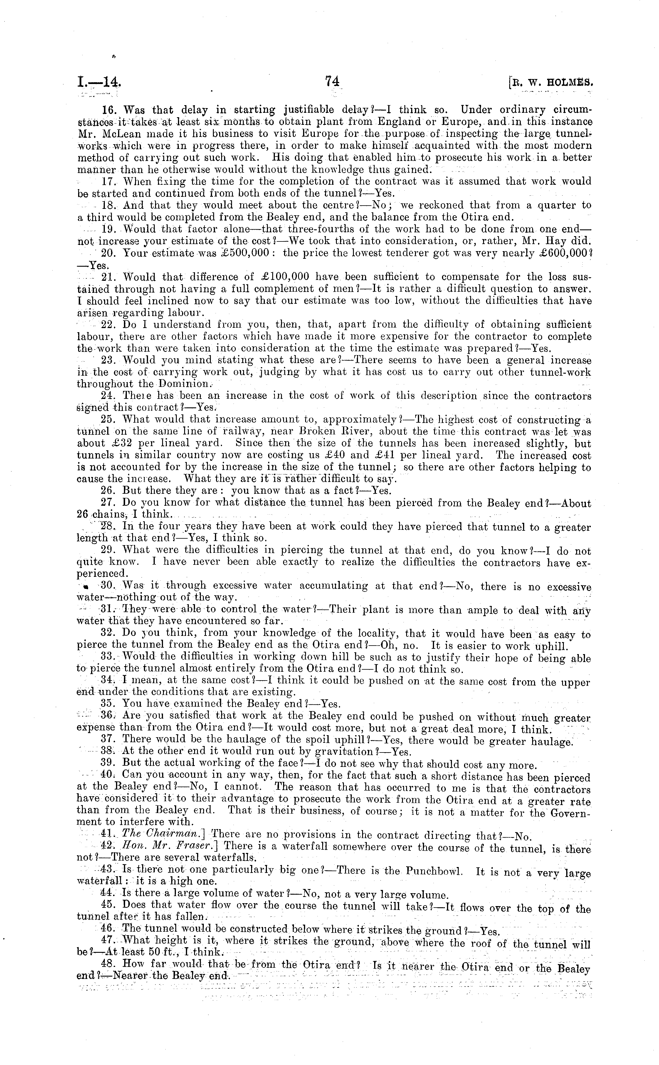 16. Was that delay in starting justifiable delay? —I think so. Under ordinary circumstances intakes at least six months to obtain plant from England or Europe, and-in this instance Mr. McLean made it his business to visit Europe for the purpose of inspecting the large tunnelworks which were in progress there, in order to make himself acquainted with the most modern method of carrying out such work. His doing that enabled him to prosecute his work in a. better manner than he otherwise would without the knowledge thus gained. 17. When fixing the time for the completion of the contract was it assumed that work would be started and continued from both ends of the tunnel? —Yes. 18. And that they would meet about the centre?—No; we reckoned that from a quarter to a third would be completed from the Bealey end, and the balance from the Otira end. 19. Would that factor alone —that three-fourths of the work had to be done from one end— not increase your estimate of the cost? —We took that into consideration, or, rather, Mr. Hay did. 20. Tour estimate was £500,000 : the price the lowest tenderer got was very nearly £600,000? —Yes. ■'■• : - 21. Would that difference of £100,000 have been sufficient to compensate for the loss sustained through not having a full complement of men ?—lt is rather a difficult question to answer. T should feel inclined now to say that our estimate was too low, without the difficulties that have arisen regarding labour. • 22. Do I understand from you, then, that, apart from the difficulty of obtaining sufficient labour, there are other factors which have made it more expensive for the contractor to complete the work than were taken into consideration at the time the estimate was prepared?— Yes. 23. Would you mind stating what these are? —There seems to have been a general increase in the cost of carrying work out, judging by what it has cost us to carry out other tunnel-work throughout the Dominion. 24. Theie has been an increase in the cost of work of this description since the contractors signed this contract? —Yes. 25. What would that increase amount to, approximately? —The highest cost of constructing a tunnel on the same line of railway, near Broken River, about the time this contract was let was about £32 per lineal yard. Since then the size of the tunnels has been increased slightly, but tunnels in similar country now are costing us £40 and £41 per lineal yard. The increased cost is not accounted for by the increase in the size of the tunnel; so there are other factors helping to cause the increase. What they are it is rather difficult to say. 26. But there they are : you know that as a fact?— Yes. 27. Do you know for what distance the tunnel has been pierced from the Bealey end?— About 26 chains, I think. . . .... .. . - 28. In the four years they have been at work could they have pierced that tunnel to a greater length at that end? —Yes, I think so. 29. What were the difficulties in piercing the tunnel at that end, do you know? —I do not quite know. I have never been able exactly to realize the difficulties the contractors have experienced. • 30. Was it through excessive water accumulating at that end?—No, there is no excessive water—-nothing out of the way. , : -- -31.-They were able to control the water ?—Their plant is more than ample to deal with any water that they have encountered so far. 32. Do you think, from your knowledge of the locality, that it would have been as easy to pierce the tunnel from the Bealey end as the Otira end? —Oh, no. It is easier to work uphill. 33. Would the difficulties in working down hill be such as to justify their hope of being able to pierce the tunnel almost entirely from the Otira end?—l do not think so. 34. I mean, at the same cost?—l think it could be pushed on at the same cost from the upper end -under the conditions that are existing. 35. You have examined the Bealey end? —Yes. ■'-■'■" 3£. Are you satisfied that work at the Bealey end could be pushed on without much greater expense than from the Otira end? —It would cost more, but not a great deal more, I think. 37. There would be the haulage of the spoil uphill?— Yes, there would be greater haulage. ' •■- 38. At the other end it would run out by gravitation?— Yes. 39. But the actual working of the face? —I do not see why that should cost any more. 40: Can you account in any way, then, for the fact that such a short distance has been pierced at the Bealey end?—No, I cannot. The reason that has occurred to me is that the contractors have considered it to their advantage to prosecute the work from the Otira end at a greater rate than from the Bealey end. That is their business, of course; it is not a matter for the Government to interfere with. : 41.. The Chairman.] There are no provisions in the contract directing that? No. 42. Eon. Mr, Eraser.] There is a waterfall somewhere over the course of the tunnel, is there not? —There are several waterfalls. 43. Is there not one particularly big one?— There is the Punchbowl. It is not a very large waterfall: it is a high one. -44. Is there a large volume of water ?—No, not a very large volume. 45. Does that water flow over the course the tunnel will take?—lt flows over the top of the tunnel after it has fallen. ...... 46. The tunnel would be constructed below where it strikes the ground? Yes. '""""■ 47.-What height is it, where it strikes the ground, above where the roof of the tunnel will be)—-At least 50-ft., I-think.- - 48. How far would that be from the Otira end? Is it nearer the Otira end or the Bealey end the Bealey end-. -'--■ ._....-..-- ~ *~ j . .