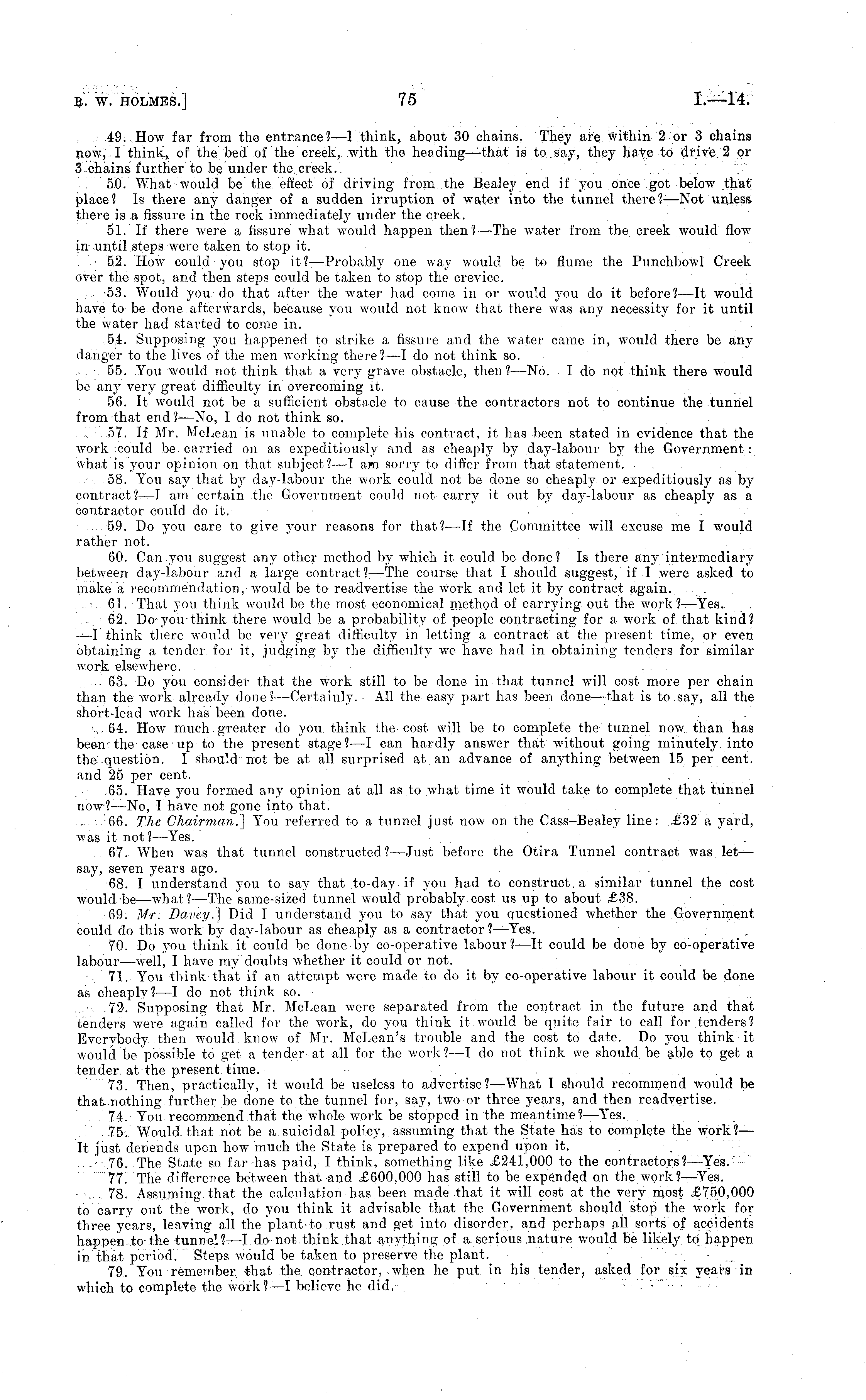 49. How far from the entrance? —I think, about 30 chains. They are within 2or 3 chains now, I think, of the bed of the creek, with the heading—that is to .say, they have to drive. 2 or 3 chains further to be under the. creek. 50. What would be the effect of driving from the Bealey end if you once got below that place? Is there any danger of a sudden irruption of water into the tunnel there?- —Not unless there is a fissure in the rock immediately under the creek. 51. If there were a fissure what would happen then? —The water from the creek would flow in until steps were taken to stop it. 52. How could you stop it?— Probably one way would be to flume the Punchbowl Creek over the spot, and then steps could be taken to stop the crevice. 53. Would you do that after the water had come in or would you do it before? —It would have to be. done afterwards, because you would not know that there was any necessity for it until the water had started to come in. 54. Supposing you happened to strike a fissure and the water came in, would there be any danger to the lives of the men working there? —I do not think so. . ■ 55. You would not think that a very grave obstacle, then ?—No. I do not think there would be any very great difficulty in overcoming it. 56. It would not be a sufficient obstacle to cause the contractors not to continue the tunnel from that end?—No, I do not think so. 57. If Mr. McLean is unable to complete his contract, it has been stated in evidence that the work could be carried on as expeditiously and as cheaply by day-labour by the Government: what is your opinion on that subject? —I am sorry to differ from that statement. 58. You say that by day-labour the work could not be done so cheaply or expeditiously as by contract ?—I am certain the Government could not carry it out by day-labour as cheaply as a contractor could do it. 59. Do you care to give your reasons for that?—lf the Committee will excuse me I would rather not. 60. Can you suggest any other method by which it could be done? Is there any intermediary between day-labour and a large contract? —The course that I should suggest, if I were asked to make a recommendation, would be to readvertise the work and let it by contract again. .: 61. That you think would be the most economical method of carrying out the work?— Yes. 62. Do-you think there would be a probability of people contracting for a work of. that kind? —I think there would be very great difficulty in letting a contract at the present time, or even obtaining a tender for it, judging by the difficulty we have had in obtaining tenders for similar work elsewhere. 63. Do you consider that the work still to be done in that tunnel will cost more per chain than the work already done?— Certainly. All the easy part has been done —that is to say, all the short-lead work has been done. •64. How much greater do you think the cost will be to complete the tunnel now than has been the case up to the present stage?—l can hardly answer that without going minutely into the question. I should not be at all surprised at an advance of anything between 15 per cent, and 25 per cent. . . 65. Have you formed any opinion at all as to what time it would take to complete that tunnel now?—No, I have not gone into that. . ■ 66. The Chairman.] You referred to a tunnel just now on the Cass—Bealey line: £32 a yard, was it not? —Yes. 67. When was that tunnel constructed?— Just before the Otira Tunnel contract was let — say, seven years ago. 68. I understand you to say that to-day if } T ou had to construct a similar tunnel the cost would be —what?—The same-sized tunnel would probably cost us up to about £38. 69. Mr. Dave?/.] Did I understand you to say that you questioned whether the Government could do this work by day-labour as cheaply as a contractor ?—Yes. 70. Do you think it could be done by co-operative labour?—lt could be done by co-operative labour—well, I have my doubts whether it could or not. ■■- 71. You think that if an attempt were made to do it by co-operative labour it could be done as cheaply? —I do not think so. 72. Supposing that Mr. McLean were separated from the contract in the future and that tenders were again called for the work, do you think it would be quite fair to call for tenders? Everybody then would know of Mr. McLean's trouble and the cost to date. Do you think it would be possible to get a tender at all for the work? —I do not think we should be able to get a tender at the present time. 73. Then, practically, it would be useless to advertise? —What I should recommend would be that nothing further be done to the tunnel for, say, two or three years, and then readvertise. 74. You recommend that the whole work be stopped in the meantime? —Yes. .'.'".'. 75. Would that not be a suicidal policy, assuming that the State has to complete the work?— It just depends upon how much the State is prepared to expend upon it. • 76. The State so far has paid, I think, something like £241,000 to the contractors? —Yes. 77. The difference between that and £600,000 has still to be expended on the work? —Yes. ... 78. Assuming that the calculation has been made that it will cost at the very, most £750,000 to carry out the work, do you think it advisable that the Government should stop the work for three years, leaving all the plant to rust and get into disorder, and perhaps all sorts of accidents happen to; the tunnel?—l do not think that anything: of a serious nature would be likely, to happen in that period. Steps would be taken to preserve the plant. 79. You remember, that the. contractor, when he put in his tender, asked for six years in which to complete the work? —I believe he did. .