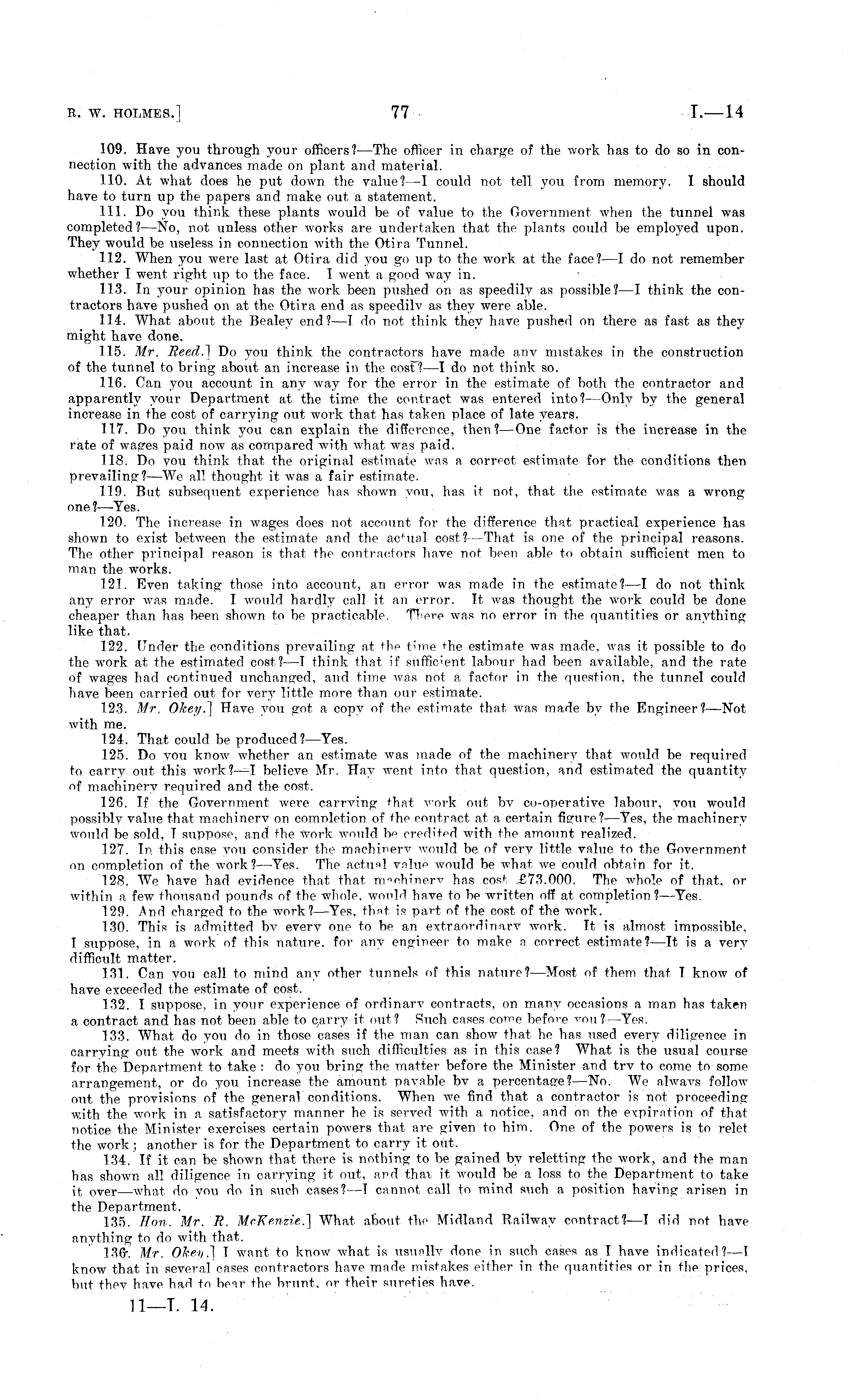 109. Have you through your officers? —The officer in charge of the work has to do so in connection with the advances made on plant and material. 110. At what does he put down the value?—l could not tell you from memory. I should have to turn up the papers and make out a statement. 111. Do you think these plants would be of value to the Government when the tunnel was completed?—No, not unless other works are undertaken that the plants could be employed upon. They would be useless in connection with the Otira Tunnel. 112. When you were last at Otira did you go up to the work at the face?—l do not remember whether I went right up to the face. I went a good way in. 113. In your opinion has the work been pushed on as speedily as possible?—l think the contractors have pushed on at the Otira end as speedily as they were able. 114. What about the Bealey end? —T do not think they have pushed on there as fast as they might have done. 115. Mr. Reed.] Do you think the contractors have made any mistakes in the construction of the tunnel to bring about an increase in the cosF?—l do not think so. 116. Can you account in any way for the error in the estimate of both the contractor and apparently your Department at the time the contract was entered into?— Only by the general increase in the cost of carrying out work that has taken place of late years. 117. Do you think you can explain the difference, then?— One factor is the increase in the rate of watres paid now as compared with what was paid. 118. Do you think that the original estimate was a corrpct estimate for the conditions then prevailing?—We all thought it was a fair estimate. 119. But subsequent experience has shown you, has it not, that the estimate was a wrong one? —Yes. 120. The increase in wages does not account for the difference that practical experience has shown to exist between the estimate and the ac+ual cost? —That is one of the principal reasons. The other principal reason is that the contractors have not been able to obtain sufficient men to man the works. 121. Even taking those into account, an error was made in the estimate?—l do not think any error was made. I would hardly call it an error. It was thought the work could be done cheaper than has been shown to be practicable. TKere was no error in the quantities or anything like that. 122. Under the conditions prevailing at the time the estimate was made, was it possible to do the work at the estimated cost? —I think that if sufficient labour had been available, and the rate of wages had continued unchanged, and time was not a factor in the question, the tunnel could have been carried out for very little more than our estimate. 123. Mr. OkeyA Have you got a copy of the estimate that was made by the Engineer?— Not with me. 124. That could be produced? —Yes. 125. Do you know whether an estimate was made of the machinery that would be required to carry out this work? —I believe Mr. Hay went into that question, and estimated the quantity of machinery required and the cost. 126. If the Government were carrying that vnrk out by co-operative labour, you would possibly value that machinery on comnletion of the contract at a certain figure?— Yes, the machinery would be sold, I suppose, and the work would be credited with the amount realized. 127. In this case you consider the machinery would be of very little value to the Government on completion of the work?— Yes. The actual vnlup would be what we could obtain for it. 128. We have had evidence that that machinery has cos , - .£73.000. The whole of that, or within a few thousand pounds of the whole, would have to be written off at completion? —Yes. 129. And charged to the work?— Yes, that is part of the cost of the work. 130. This is admitted by every one to be an extraordinary work. It is almost impossible, I suppose, in a work of this nature, for any engineer to make a correct estimate? —It is a very difficult matter. 131. Can you call to mind any other tunnels of this nature?— Most of them that I know of have exceeded the estimate of cost. 132. I suppose, in your experience of ordinary contracts, on many occasions a man has taken a contract and has not been able to carry it out? Such cases come before von?—Yes. 133. What do you do in those cases if the man can show that he has used every diligence in carrying out the work and meets with such difficulties as in this case? What is the usual course for the Department to take : do you bring the matter before the Minister and try to come to some arrangement, or do you increase the amount payable by a percentage?— No. We always follow out the provisions of the general conditions. When we find that a contractor is not proceeding with the work in a satisfactory manner he is served with a notice, and on the expiration of that notice the Minister exercises certain powers that are given to him. One of the powers is to relet the work; another is for the Department to carry it out. 134. If it can be shown that there is nothing to be gained by reletting the work, and the man has shown all diligence in carrying it out, and thai it would be a loss to the Department to take it over—what do you do in such cases? —I cannot call to mind such a position having arisen in the Department. 135. Hon. Mr. R. McKenzie.] What about the Midland Railway contract?—T did not have anything to do with that. 136. Mr. Okei/.l T want to know what is usunllv done in such cases as I have indicated?—l know that in several cases contractors have made mistakes either in the quantities or in the prices, but they have had to benr the brunt, or their sureties have.