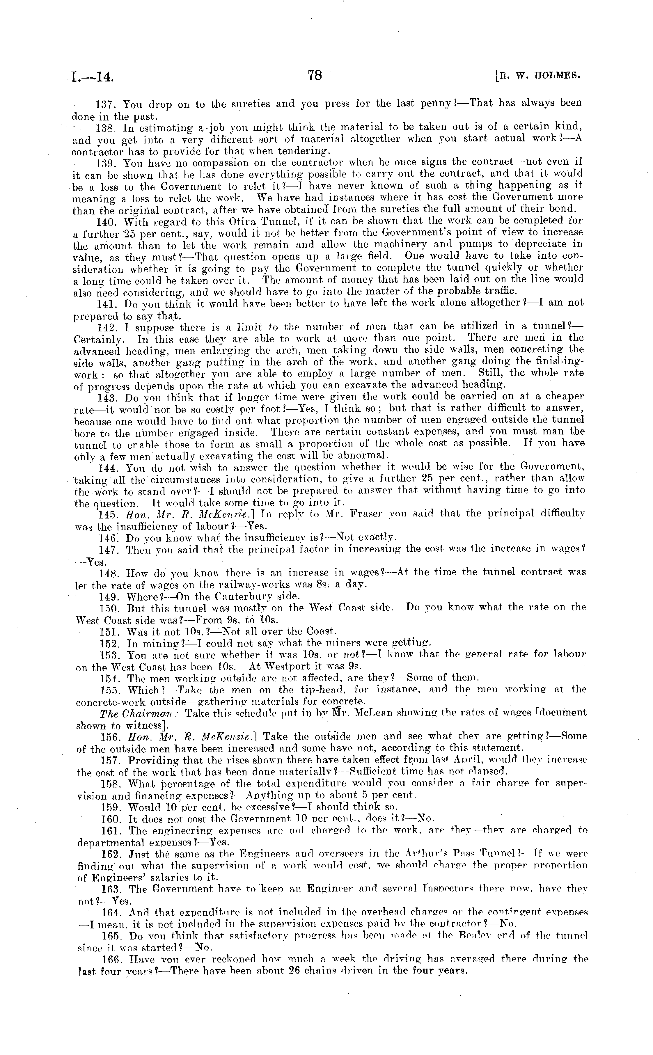 137. You drop on to the sureties and you press for the last penny? —That has always been done in the past. 138. In estimating a job you might think the material to be taken out is of a certain kind, and you get into a very different sort of material altogether when you start actual work? —A contractor has to provide for that when tendering. 139. You have no compassion on the contractor when he once signs the contract —not even if it can be shown that he has done everything possible to carry out the contract, and that it would be a loss to the Government to relet it? —I have never known of such a thing happening as it meaning a loss to relet the work. We have had instances where it has cost the Government more than the original contract, after we have obtained from the sureties the full amount of their bond. 140. With regard to this Otira Tunnel, if it can be shown that the work can be completed for a further 25 per cent., say, would it not be better from the Government's point of view to increase the amount than to let the work remain and allow the machinery and pumps to depreciate in value, as they must? —That question opens up a large field. One would have to take into consideration whether it is going to pay the Government to complete the tunnel quickly or whether a long time could be taken over it. The amount of money that has been laid out on the line would also need considering, and we should have to go into the matter of the probable traffic. 141. Do you think it would have been better to have left the work alone altogether? —I am not prepared to say that. 142. I suppose there is a limit to the number of men that can be utilized in a tunnel?— Certainly. In this case they are able to work at more than one point. There are men in the advanced heading, men enlarging the arch, men taking down the side walls, men concreting the side walls, another gang putting in the arch of the work, and another gang doing the finishingwork :so that altogether you are able to employ a, large number of men. Still, the whole rate of progress depends upon the rate at which you can excavate the advanced heading. 143. Do you think that if longer time were given the work could be carried on at a cheaper ra te —it would not be so costly per foot? —Yes, I think so; but that is rather difficult to answer, because one would have to find out what proportion the number of men engaged outside the tunnel bore to the number engaged inside. There are certain constant expenses, and you must man the tunnel to enable those to form as small a proportion of the whole cost as possible. Tf you have only a few men actually excavating the cost will be abnormal. 144. You do not wish to answer the question whether it would be wise for the Government, taking all the circumstances into consideration, to give a further 25 per cent., rather than allow the work to stand over? —I should not be prepared to answer that without having time to go into the question. Tt would take some time to go into it. 145. Hon. Mr. R. McKenzie.] In reply to Mr. Fraser you said that the principal difficulty was the insufficiency of labour? —Yes. 146. Do you know what the insufficiency is? —Not exactly. 147. Then you said that the principal factor in increasing the cost was the increase in wages? —Yes. 148. How do you know there is an increase in wages?—At the time the tunnel contract was let the rate of wages on the railway-works was Bs. a day. 149. Where?—On the Canterbury side. 150. But this tunnel was mostly on the West Coast side. Do you know what the rate on the West Coast side was ?—From 9s. to 10s. 151. Was it not 10s. ?—Not all over the Coast. 152. In mining? —T could not say what the miners were getting. 153. You are not sure whether it was 10s. or not? —I know that the general rate for labour on the West Coast has been 10s. At Westport it was 9s. 154. The men working outside are not affected, are they?— Some of them. 155. Which?— Take the men on the tip-head, for instance, and the men working at the concrete-work outside —gathering materials for concrete. The Chairman : Take this schedule put in by Mr. McLean showing the rates of wages [document shown to witness]. 156. Hon. Mr. R. McKenzie.] Take the outside men and see what they are getting?— Some of the outside men have been increased and some have not, according to this statement. 157. Providing that the rises shown there have taken effect from last April, would they increase the cost of the work that has been done materially?— Sufficient time has not elapsed. 158. What percentage of the total expenditure would you consider a fair charge for supervision and financing expenses?— Anything up to about 5 per cent. 159. Would 10 per cent, be excessive? —I should think so. 160. It does not cost the Government 10 per cent., does it?— No. 161. The engineering expenses are not charged to the work, are they—they are charged to departmental expenses?— Yes. 162. Just the same as the Engineers and overseers in the Arthur's Pass Tunnel? —Tf we were finding out what the supervision of a work would cost, we should charge the proper proportion of Engineers' salaries to it. 163. The Government have to'keep an Engineer and several Inspectors there now, have they not?— Yes. 164. And that expenditure is not included in the overhead charges or the contingent expenses —J mean, it is not included in the supervision expenses paid by the contractor? —No. 165. Do you think that satisfactory progress has been made at the Bealer end of the tunnel since it was started? —No. 166. Have you ever reckoned how much a week the driving has averaged there during the last four years?— There have been about 26 chains driven in the four years.