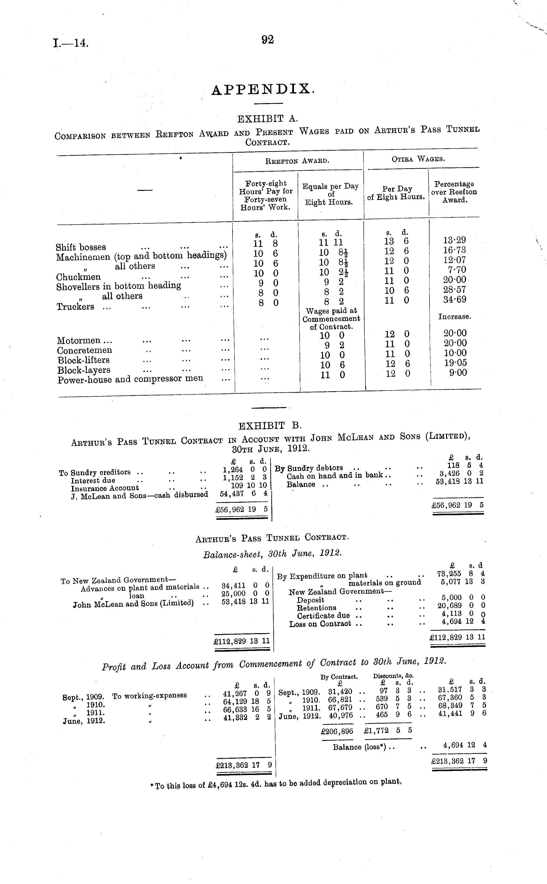 EXHIBIT B. Arthur's Pass Tunnel Contract in Account with John McLean and Sons (Limited), 30th June, 1912. Ineurance Account .. • • 109 10 10 Balance J McLean and Sons—cash disbursed 54,437 b 4 Arthur's Pass Tunnel Contract. Balance-sheet, 30th June, 1912. To New Zeaiand Government- * \ \ By Expenditure on pbat 73 255 J 4 Advances on plant and rn.to.ls.. 34,411 0 0 New ZeaWd Govemmenb _ g John McLean and Sons (Limited) .. 53,418 13 11 !! !! '■'■ W,m 0 0 Certificate due .. .. •• 4 11 ? ,2 9 Loss on Contraot .. .. •• 4,694 12 4 £112,829 13 11 Profit and Loss Account from Commencement of Contract to 30th June, 1912. By Contraot. Discounts, See. Sept., 1909. Toworking-expenses 41 jg fi\ Sept., 1909 BlfgO .. || J' 31517 3 8 . 191 °- " •• Rβ 633 16 5 " 19U 67 679 .. 670 75 .. 68,349 7 5 - • ]l]i- - Xl 2 a June, 1912. 40,976 .. 465 9 6 .. 41,441 9 6 June, lyi*.. » * * ' , .. £206,896 £1,772 5 5 ""Balance (loss*) .. .. 12 4 •To this loss of £4,694 12b. 4d. has to be added depreciation on plant,