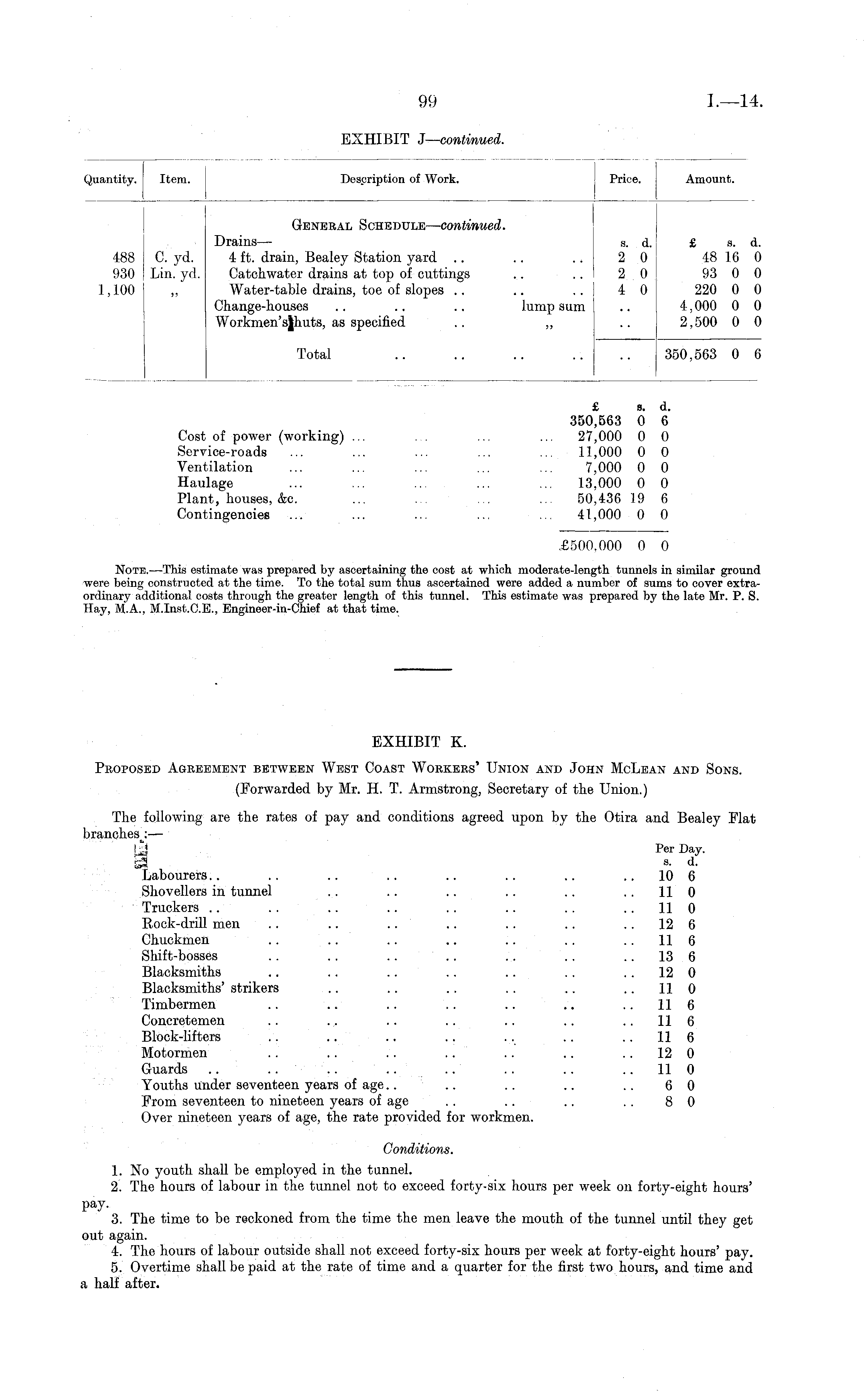 EXHIBIT K. Proposed Agreement between West Coast Workers' Union and John McLean and Sons. (Forwarded by Mr. H. T. Armstrong, Secretary of the Union.) The following are the rates of pay and conditions agreed upon by the Otira and Bealey Flat branches^ — Per Day. a c. a. Labourers.. .. .. .. .. .. .. 10 6 Shovellers in tunnel .. .. .. .. .. ..110 Truckers .. .. .. .. .. .. .. ..110 Rock-drill men .. .. .. .. .. .. 12 6 Chuckmen .. .. .. .. .. .. ..116 Shift-bosses .. .. .. .. ... .. 13 6 Blacksmiths .. .. .. .. .. .. 12 0 Blacksmiths' strikers .. .. .. .. .. .. 110 Timbermen .. .. .. .. .. .. 11 6 Concretemen .. .. .. .. .. .. 11 6 Block-lifters .. .. .. .. . , .. 11 6 Motormen . . .. .. .. .. .. 12 0 Guards .. .. .. .. .. .. .. ..110 Youths under seventeen years of age.. .. .. .. .. 6 0 From seventeen to nineteen years of age .. .. .. .. 8 0 Over nineteen years of age, the rate provided for workmen. Conditions. 1. No youth shall be employed in the tunnel. 2. The hours of labour in the tunnel not to exceed forty-six hours per week on forty-eight hours' pay. 3. The time to be reckoned from the time the men leave the mouth of the tunnel until they get out again. 4. The hours of labour outside shall not exceed forty-six hours per week at forty-eight hours' pay. 5. Overtime shall be paid at the rate of time and a quarter for the first two hours, and time and a half after.